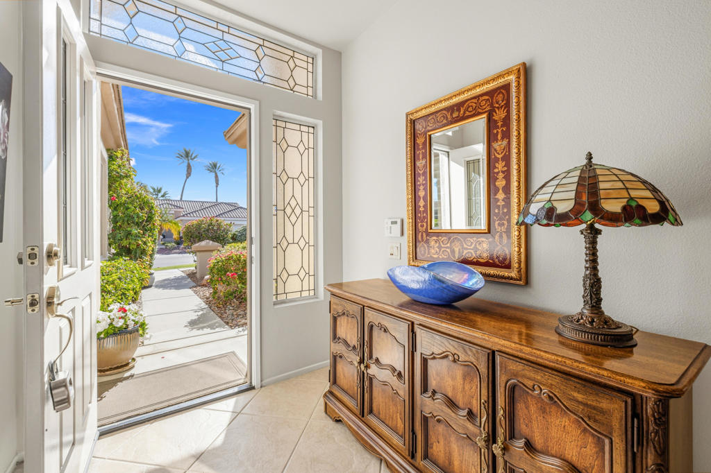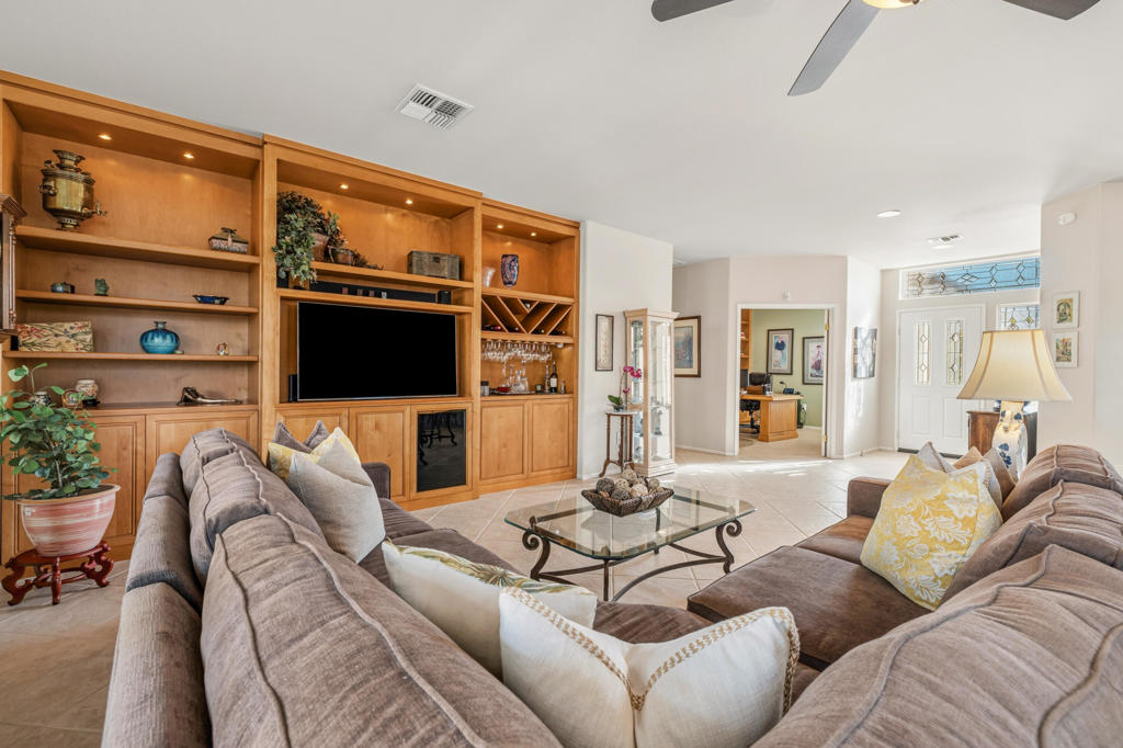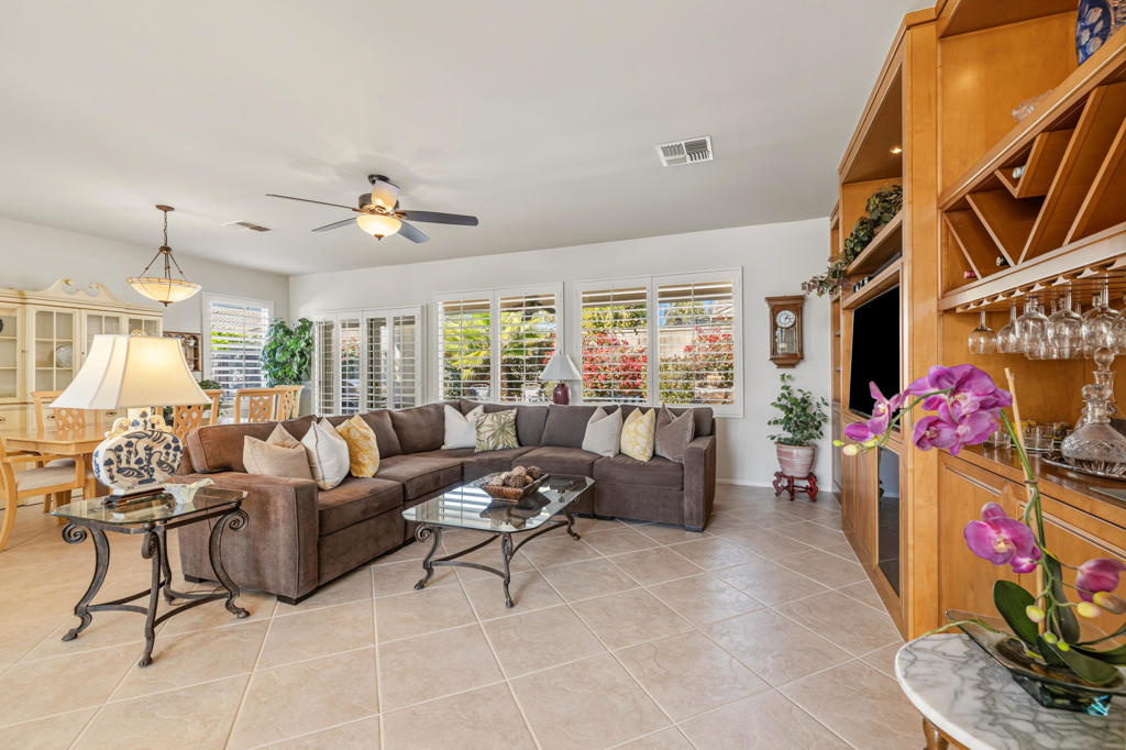 55+ Sun City Palm Desert offers the ''BEST BANG FOR YOUR BUCK'' active lifestyle retirement community in the whole desert! This highly sought after open-concept St. Croix model has 2 bedrooms, 2 baths, plus versatile DEN/OFFICE and a golf cart garage. This home is situated on a spacious corner lot and is located right smack in the middle of community within walking distance of the Sunset View clubhouse. Beautiful curb appeal, gated courtyard, real grass, easy maintenance desert/tropical landscaping. Inside, built-in custom cabinetry throughout in the kitchen, living room, master bedroom, and office, 16 inch tile on the diagonal throughout, ceiling fans, and plantation shutters. Kitchen has chefs island, breakfast bar and breakfast nook with a view, slab granite, stainless fridge, pull-out drawers, and built-in desk. The living and dining rooms are open to the kitchen with French doors to the patio. The living room has custom built-in media center. The spacious master bedroom suite has built-in entertainment center, sliding door to the patio, the bath has tiled counters and shower and custom closet organizing system. The guest bedroom has bath adjacent in the hall. The den/office has built-in desk with an additional flex space/hobby room with pocket door in-between. Laundry room is inside, upper cabinets and sink, and washer/dryer are included. The covered patio has a high wall for extra privacy, above-ground hot tub, and a fountain that creates a serene atmosphere for relaxing and/or entertaining with family and friends. Sun City is all about the LIFESTYLE...low HOA dues, (4) salt water 87 degree pools, (2) 18-hole golf courses, tennis, pickleball, softball, bocce ball, 18-hole putting course, art and social clubs, entertainment, post office, restaurants and even a new outside area with fire tables at Boulevards with awesome views! ''Buy Where you Love to Play...Sun City Palm Desert!''