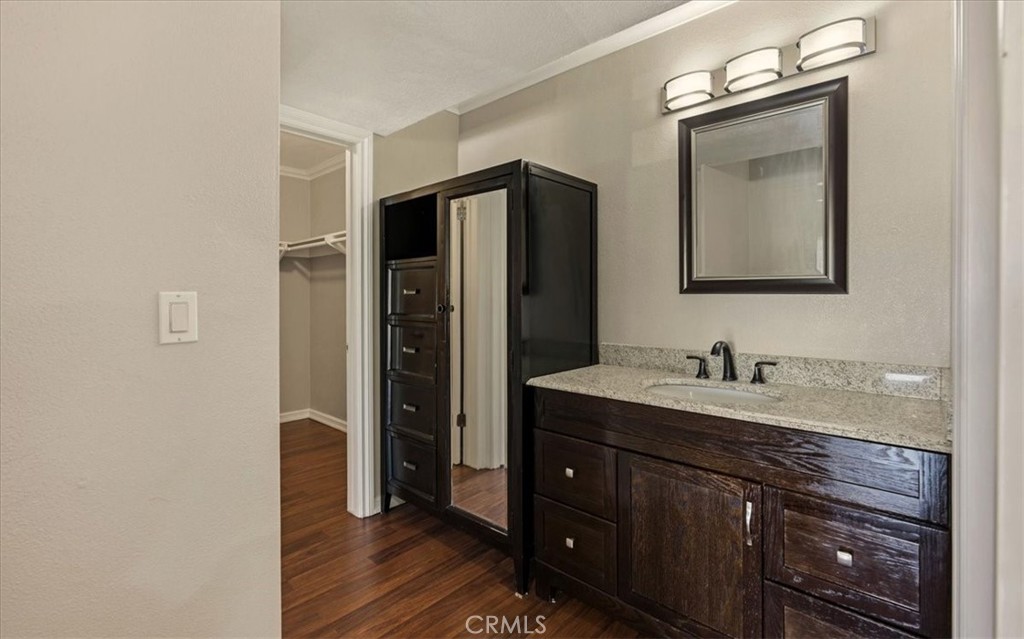 Upper-level Unit #24 featuring 2 Bedrooms, the master with a walk-in closet. The unit offers laminate wood flooring throughout, a living room with crown molding and recessed lighting, and a kitchen with granite countertops and recessed lighting. The dining area is adjacent to the kitchen and opens to a balcony. The one Bathroom has been upgraded with marble and stone finishes. Additional improvements include double-pane windows and sliding glass doors, along with fresh interior paint. Conveniently located near shopping centers, restaurants, movie theaters, public transportation, and parks, with close proximity to California State University, Fullerton (CSUF). Community amenities include pools, spas, outdoor BBQ, and four on-site laundry facilities, HOA fees that include water, Trash and gas utilities. Move in ready.
