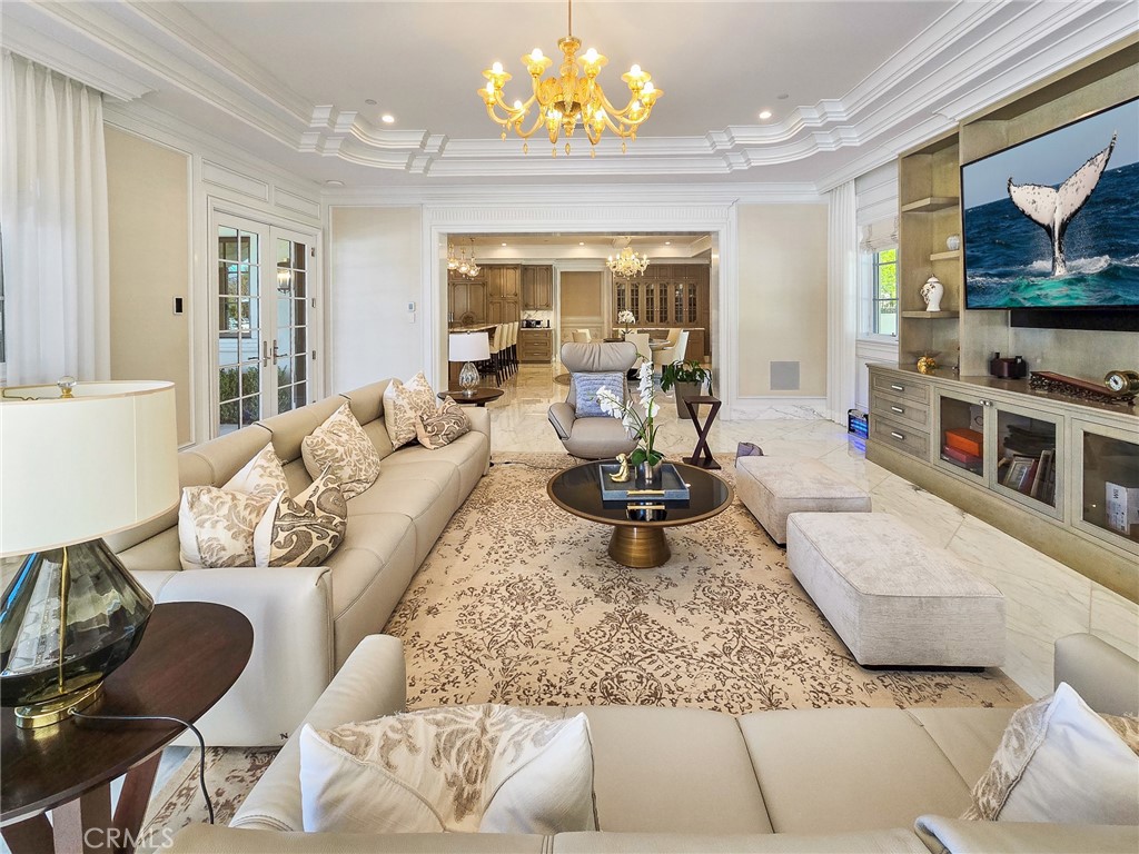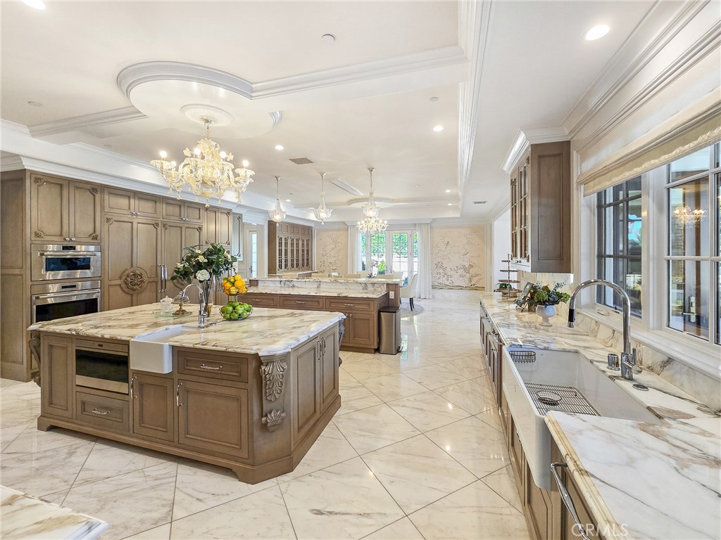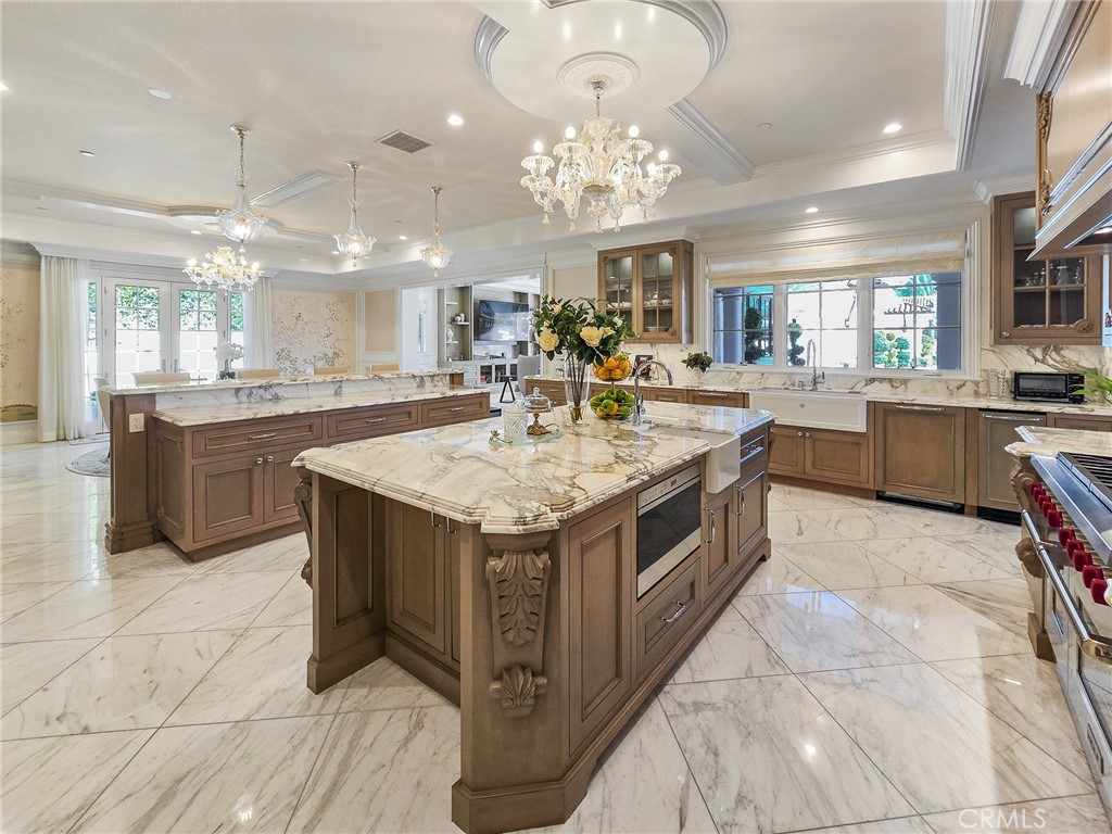 Tucked behind the guarded gates of the coveted Bradbury Estates, this remarkable Tuscan-inspired compound offers an exceptional level of privacy on more than two acres of meticulously maintained grounds. A stately drive framed by mature palm trees introduces a residence that exemplifies refined craftsmanship, architectural grandeur, and uncompromising luxury. Encompassing more than 14,000 square feet of living space, the estate is richly appointed with bespoke finishes and artisan materials sourced from Italy. Interiors feature dramatic marble inlaid flooring, custom-designed carpets, richly detailed wall coverings, coffered and domed ceilings, sculpted wall treatments, marble base moldings, and museum-quality chandeliers. A sophisticated home automation system and independent energy capabilities seamlessly integrate modern innovation with timeless design. The formal entry leaves a lasting impression with a magnificent Murano glass chandelier, soaring two-story ceiling, intricate laser-cut marble inlays, and elegant Lalique crystal accents complemented by silk wall coverings. Expansive living spaces flow effortlessly, with the formal living room capturing picturesque views of the mosaic-tiled outdoor pool and grounds beyond. Every bedroom suite is individually curated, offering luxurious finishes, custom chandeliers, and spa-like marble bathrooms. The estate is further distinguished by an extraordinary collection of amenities, including an indoor swimming pool, expansive indoor-outdoor entertaining spaces, a separate guest residence with two en-suite bedrooms and kitchenette, a private executive office with conference lounge, a fully equipped fitness center, and an impressive car barn. Rarely does a property of this caliber become available, offering a serene resort-style lifestyle, exceptional privacy, and architectural excellence in one of Southern California’s most exclusive communities.