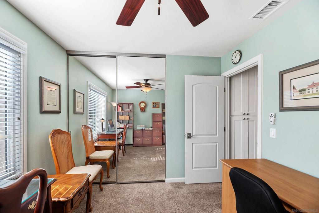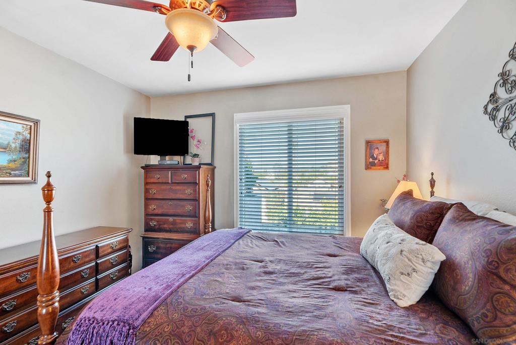 Beautiful turn-key, single story, 2 br, 2 ba end unit in "Alameda" complex. Private patio off living room with sunset views! Renovated throughout with wood-like porcelain flooring in all areas except for carpets in brs. Recessed lighting in kit, entry, hallway, & bathrms. Newer water heater, HVAC system & ducting.Ceiling fans in LR & both brs. Upgraded kit cabinets & granite counters. Stainless steel appliances, double oven, refrigerator, dishwasher. Stackable washer/dryer in kit closet. Quartz bathrm countertops, custom mirrored wardrobe doors in brs. Custom drapery & rod in LR. Most hardware upgraded, including front door. Assigned one covered parking space with storage. Located in desirable Poway School system. Move-in ready and much more to see and appreciate!