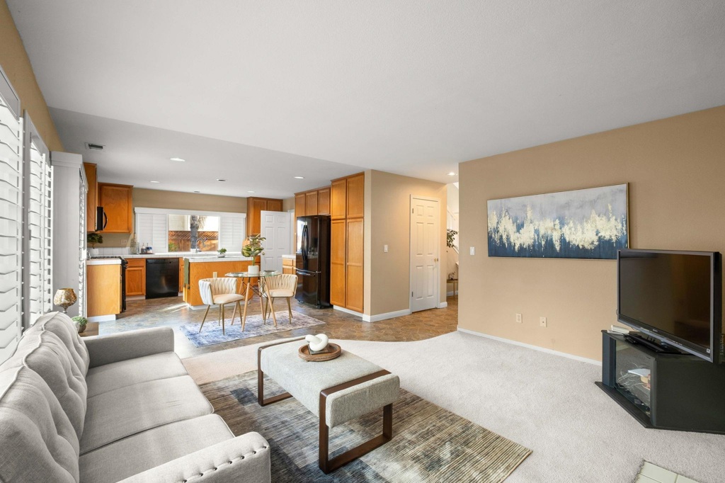 Welcome home to space, comfort, and versatility in this beautifully designed two-story residence tucked away at the end of a quiet cul-de-sac. Offering 5 bedrooms, 3 full bathrooms, including a full bedroom and bath on the main level, this home is ideal for multi-generational living, guests, or a private home office. Step inside to soaring ceilings, abundant natural light from high ceiling windows, and details such as the wood banister and plantation shutters. This floor plan flows effortlessly, with a warm and inviting family room featuring a wood-burning fireplace—perfect for cozy evenings. The spacious kitchen with island overlooks the dining area and family room, creating a true heart-of-the-home feel. Two sliding glass doors lead directly to the patio and backyard, making indoor-outdoor entertaining a breeze. Enjoy views of the pool from the front LR, DR, and kitchen, adding to the home’s open and connected ambiance. A 3-car garage for added convenience & storage. The backyard offers space to relax, entertain & play, complete with a dedicated dog run. Located just steps from a neighborhood playground, with no HOA, this home offers both privacy and community in a highly desirable setting. A great location—this is one you won’t want to miss!
