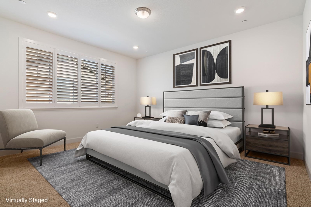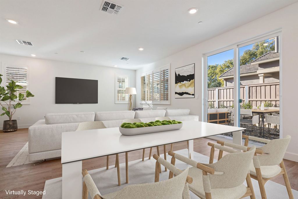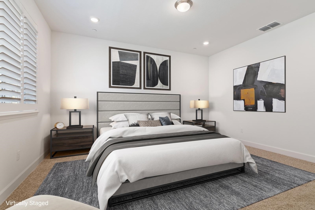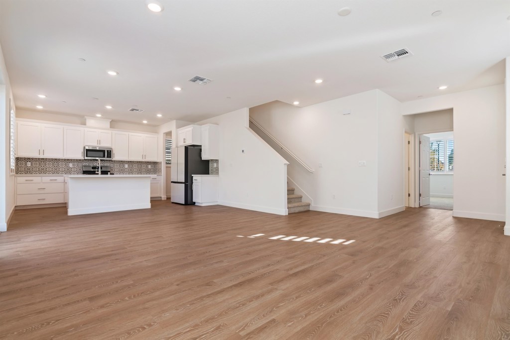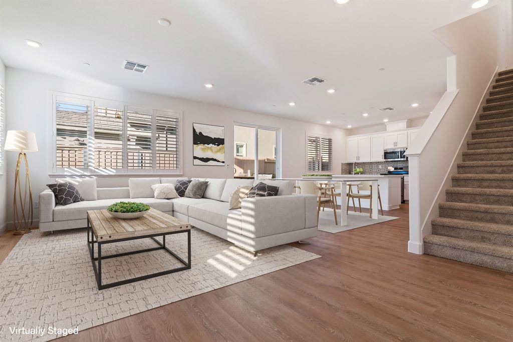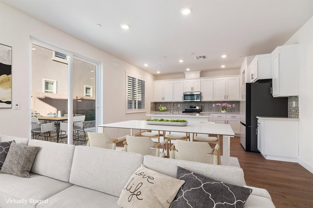 This stylish four-bedroom, three-bathroom home blends comfort and contemporary design. The two-story residence sits on a corner lot in a peaceful cul-de-sac with views of Dreamers’ Park—an idyllic backdrop for daily living. The main level features a sunlit, open-plan great room that seamlessly integrates living, dining, and kitchen areas, ideal for modern lifestyles. A generous island anchors the kitchen, perfect for casual meals and connection. Natural light pours in through numerous windows, and sliding glass doors open to a beautifully landscaped, fully fenced yard that wraps the home—offering privacy and ease with low-maintenance plantings including bay laurel, Meyer lemons, red maple, and jasmine. One bedroom and a full bath on the main floor add flexibility and convenience. Upstairs are three additional bedrooms, including a spacious primary suite with ensuite bath, another full bath, and a separate laundry room. Amenitites include interior access to the two-car garage, a fire sprinkler system, air conditioning, solar panels, and easy access to shopping, schools, and major highways. A perfect lease opportunity in one of Vacaville’s most appealing newer communities.