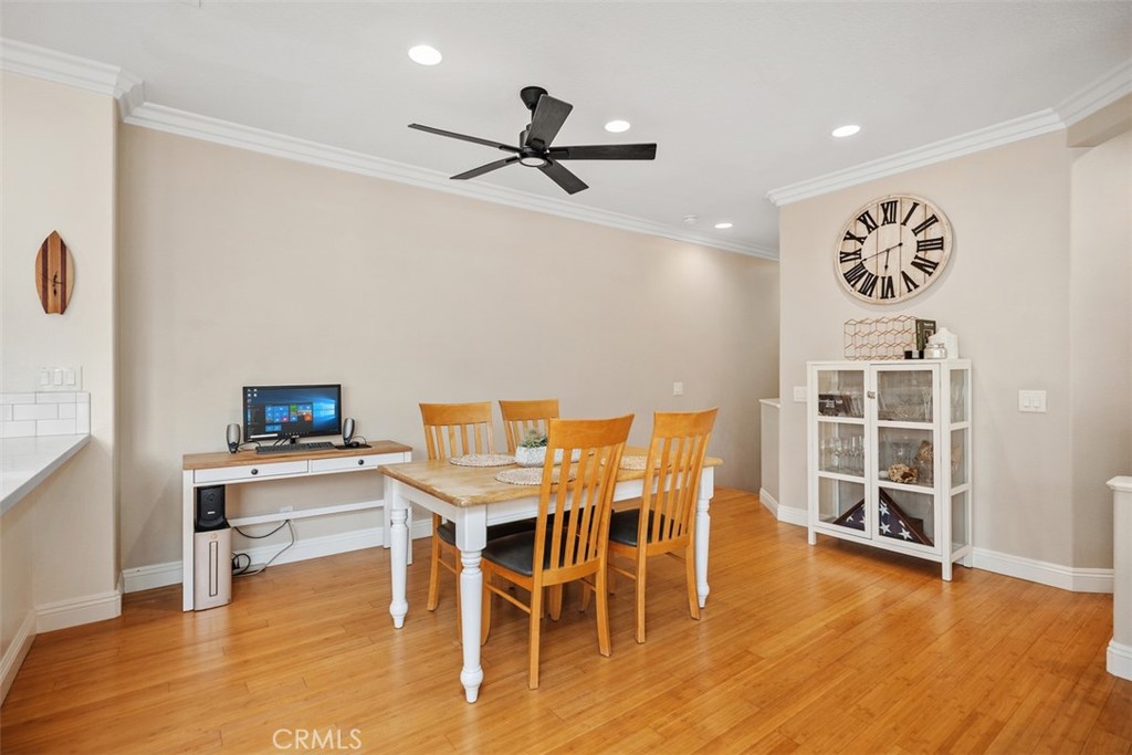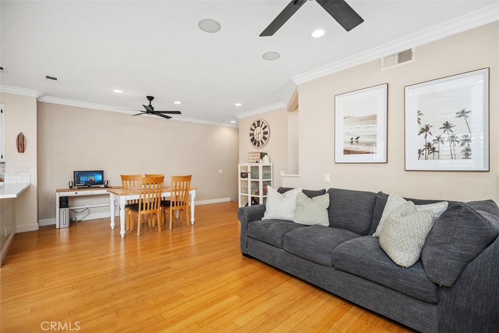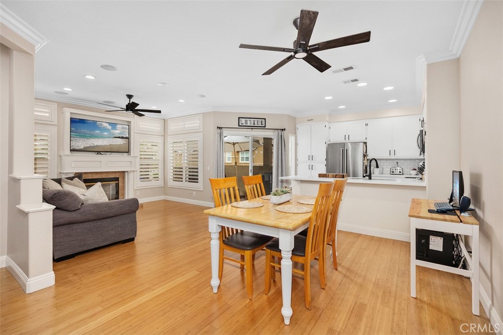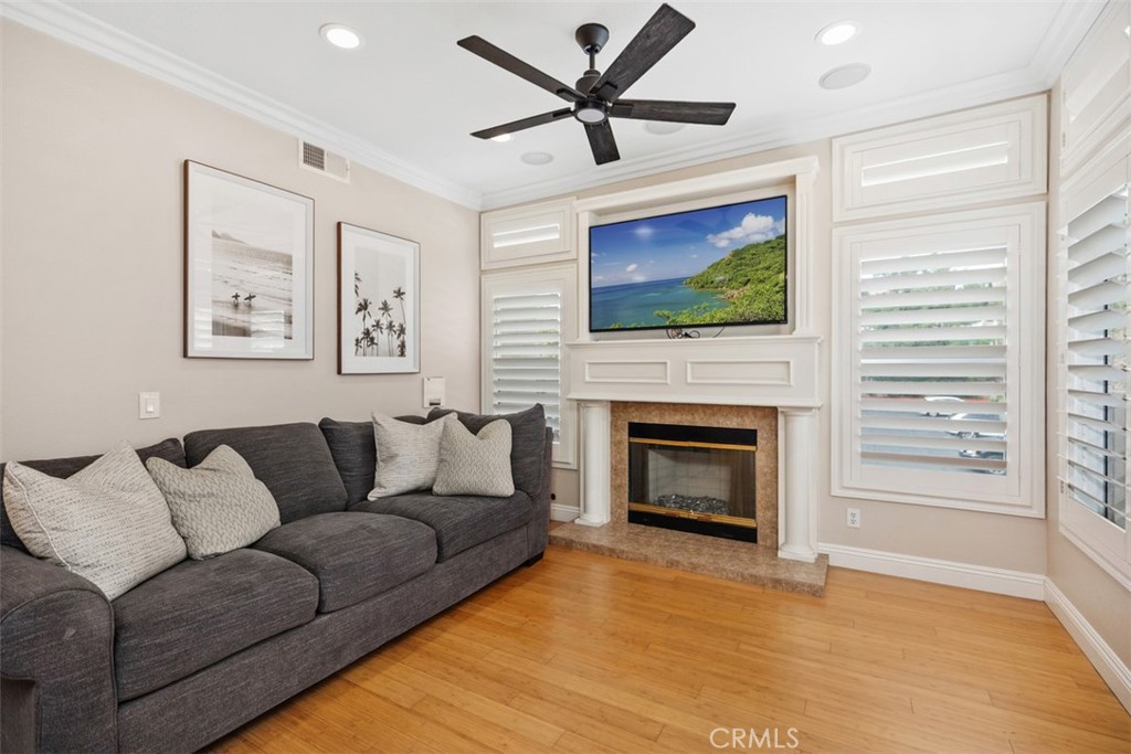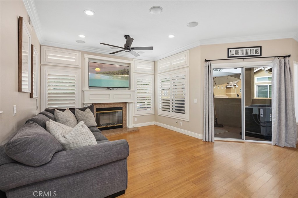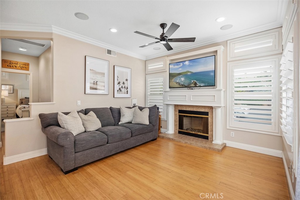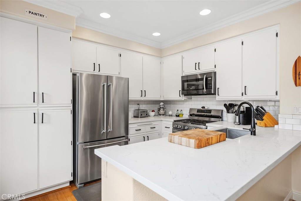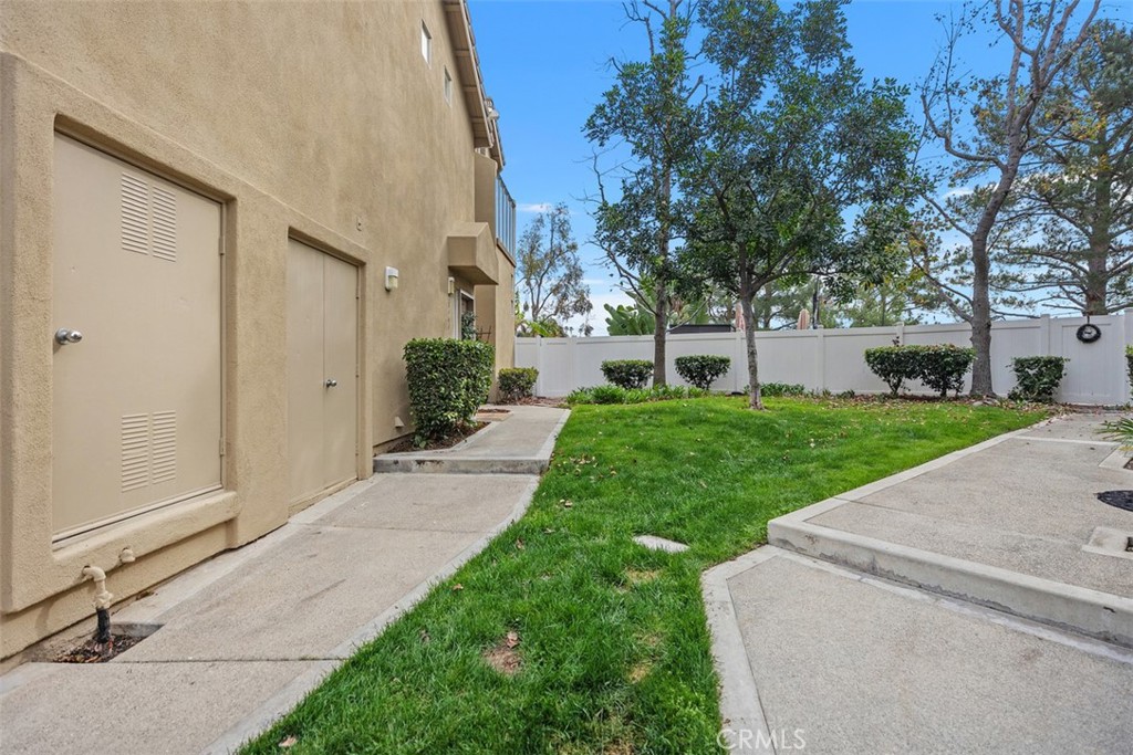 Welcome to this beautifully positioned carriage-style home where all the living spaces are thoughtfully located on one level above the convenient direct-accss one car garage. Perfectly located in the desirable Portola Hills community of Lake Forest. As an end unit, this home enjoys added privacy, and an abundance of natural light, along with the rare advantage of being adjacent to a private grassy greenbelt. This beautifully maintained 2-bedroom, 2-bath residence offers an open, light-filled floor plan and tasteful designer finishes including crown moulding throughout. A welcoming living area centers on a unique “fire & ice” glass fireplace and flows seamlessly to the open kitchen and the private outdoor balcony — ideal for morning coffee, evening BBQs or relaxing and unwinding. The heart of the home is the renovated kitchen, featuring brand-new stainless steel appliances, quartz countertops, a large steel farmhouse sink, modern fixtures and white cabinetry. Crown molding and custom plantation shutters add refined architectural detail, while new ceiling fans, newer carpet and fresh finishes provide comfort and style. Recent high-end HVAC installation ensures efficient climate control year-round! Both bedrooms are generous in size. The master suite has been thoughtfully updated with a full remodel — new vanity, soaking tub, modern tile surround in the shower, new porcelain tile and contemporary lighting. The second bedroom includes a custom shiplap wall and closet organizer for enhanced storage and organization. Residents enjoy HOA amenities such as a private community pool, spa and fitness center, plus plentiful guest parking and low HOA fees. The location is exceptional within Saddleback Valley — close to parks, sports fields, top hiking and biking trails at Whiting Ranch Wilderness Park, shopping, dining, easy transportation routes and a short drive to world-class beaches along the Pacific coastline. Turnkey condition and thoughtful upgrades make this condo an outstanding opportunity to enjoy Southern Orange County living. All of this is complimented by low property taxes and affordable HOA fees, making this an exceptional value. Schedule your showing today!