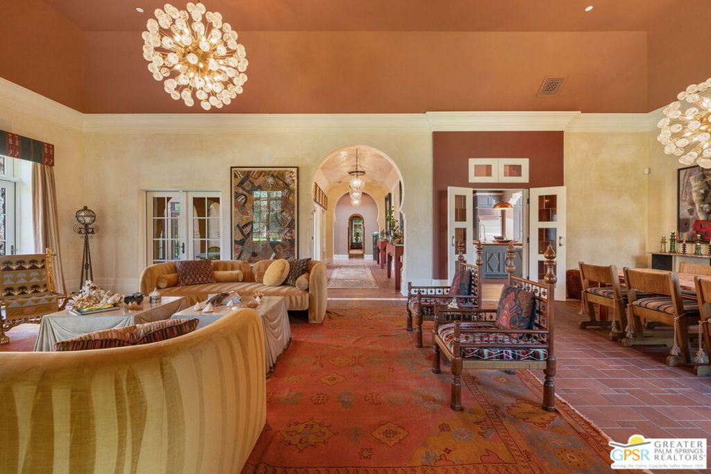A cinematic interplay of architecture, landscape, and light defines this South Palm Springs estate that reimagines modern desert luxury. Nestled in the exclusive Andreas Hills enclave, the residence offers a rare harmony of artistry, comfort, and absolute privacy. Originally envisioned by the acclaimed firm Tichenor & Thorp, this Moorish-inspired masterpiece has been thoughtfully reimagined for contemporary living. Spanning nearly one third of an acre, the estate features 5 bedrooms, 5.5 baths, and over 4,800 square feet of refined living space including a private guest house and exceptional bedroom separation for privacy and flow. Every detail reflects the designers' celebrated eye for form, proportion, and garden composition. Grand scale meets serene restraint with high ceilings, tall Venetian plaster walls, and graceful arched passageways that frame curated views of courtyards and lush gardens. Carrara marble surfaces, broad skylights, and French doors bring balance and light, while the formal living room's commanding fireplace provides a striking architectural centerpiece. The chef's kitchen is both functional and inviting, blending custom cabinetry, an oversized marble island, and generous workspace that opens seamlessly to the family room. Designed for connection, it accommodates everything from morning coffee to large scale entertaining with effortless sophistication. Outdoors, the home's series of covered and open air patios dissolve boundaries between structure and nature. A fireplace warmed loggia, alfresco dining area, and intimate garden vignettes encourage lingering under the desert sky. Mature 100 year old olive trees, towering date palms, and lush layered plantings form a tranquil backdrop to the dramatic pool and secluded spa, enhanced by outdoor showers and complete privacy. With owned solar, a gated motor court, and every modern refinement, this Andreas Hills estate is both a timeless architectural statement and a deeply livable sanctuary, a rare composition of light, texture, and soul.