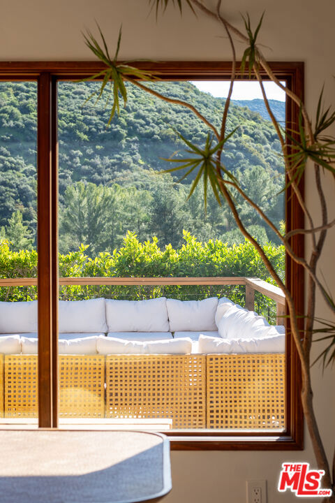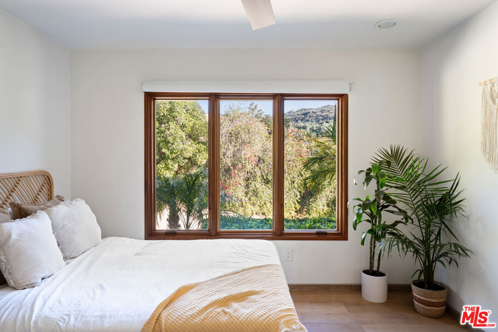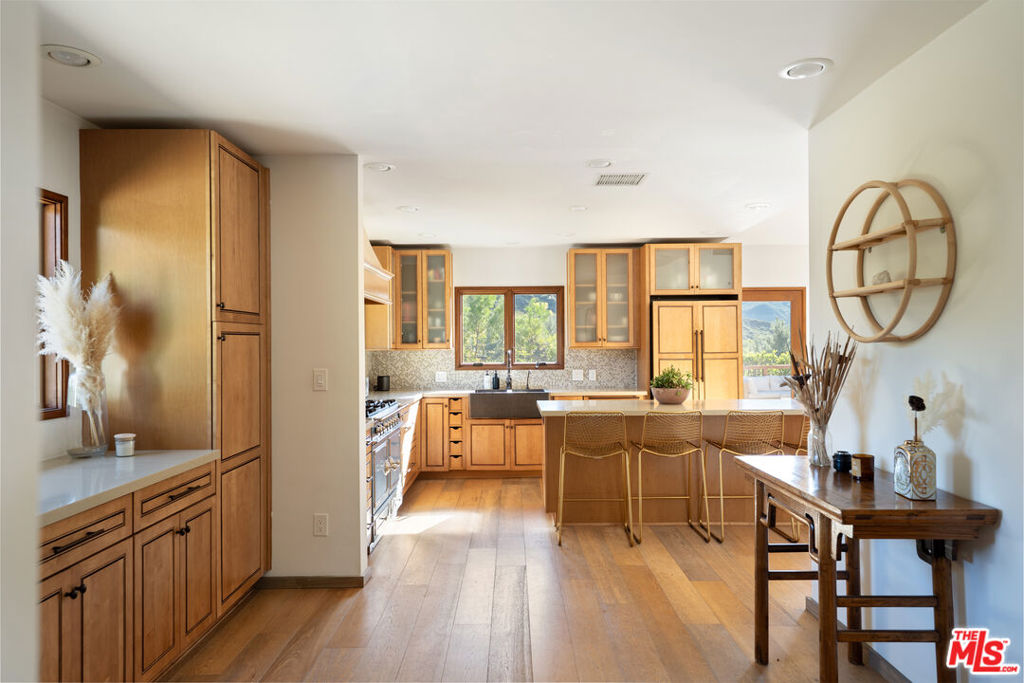 A very special offering in Calabasas, this gated Zen contemporary mini-estate sits atop its own private promontory with serene mountain views overlooking the Mulholland Scenic Corridor. Set on over an acre of land, the property includes a large fenced area with excellent potential for horses, gardens, or additional outdoor amenities, offering a rare combination of privacy, flexibility, and connection to nature just minutes from city conveniences.The beautifully updated main residence features an open-concept floor plan filled with natural light, soaring ceilings, recessed lighting, white oak wood floors, and custom wood interior windows that seamlessly blend indoor and outdoor living. The great room flows into a generous dining area, creating an ideal setting for entertaining or everyday living. The island kitchen is a standout, featuring a rare La Cornue five-burner stove with pot filler, copper farmhouse sink, striking countertops with glass tile backsplash, and a center island for casual seating.Outdoor living is at the heart of the home, with sweeping views of the pool, gazebo, mountains, and expansive grounds. The grounds have been carefully and thoughtfully designed by Natural Earth Landscaping, featuring hundreds of mature plantings that create a sense of serene privacy and a tranquil, nature-forward aesthetic. The fully usable acre offers lush yet drought-conscious landscaping, meandering pathways, meditation gardens, fruit trees, and several beautifully curated outdoor spaces that invite relaxation, gatherings, and quiet reflection. Enjoy a sparkling saltwater pool, cold plunge, mineral-rich swim spa, BBQ area with outdoor refrigerator, and peaceful seating areas throughout the property, along with a natural amphitheater ideal for wellness activities and entertaining.The spacious primary suite offers a tranquil retreat with a steam shower and dual walk-in closets. Additional space includes an attached junior primary suite with a separate entrance and a detached bonus structure with kitchenette and deck space, currently used as a recording studio and creative workspace, offering versatility as a car barn, studio, or private retreat. A dedicated yoga studio and professional recording space further complement the property's serene and creative atmosphere.Additional features include an owned solar system, Pella windows, ample on-site parking via a long meandering driveway, storage sheds, and open usable land ideal for equestrian use. Located just minutes from The Commons at Calabasas, Woodland Hills, top public and private schools, scenic hiking and horseback riding trails, and the beaches of Malibu, this exceptional property offers a rare opportunity to live, create, and thrive in a setting that feels like a private retreat while remaining close to everything. An absolute must see.