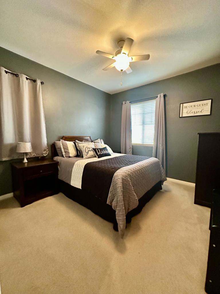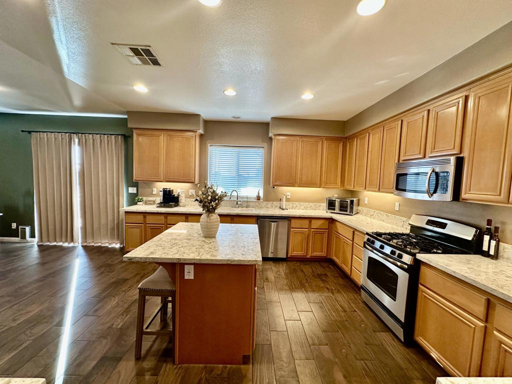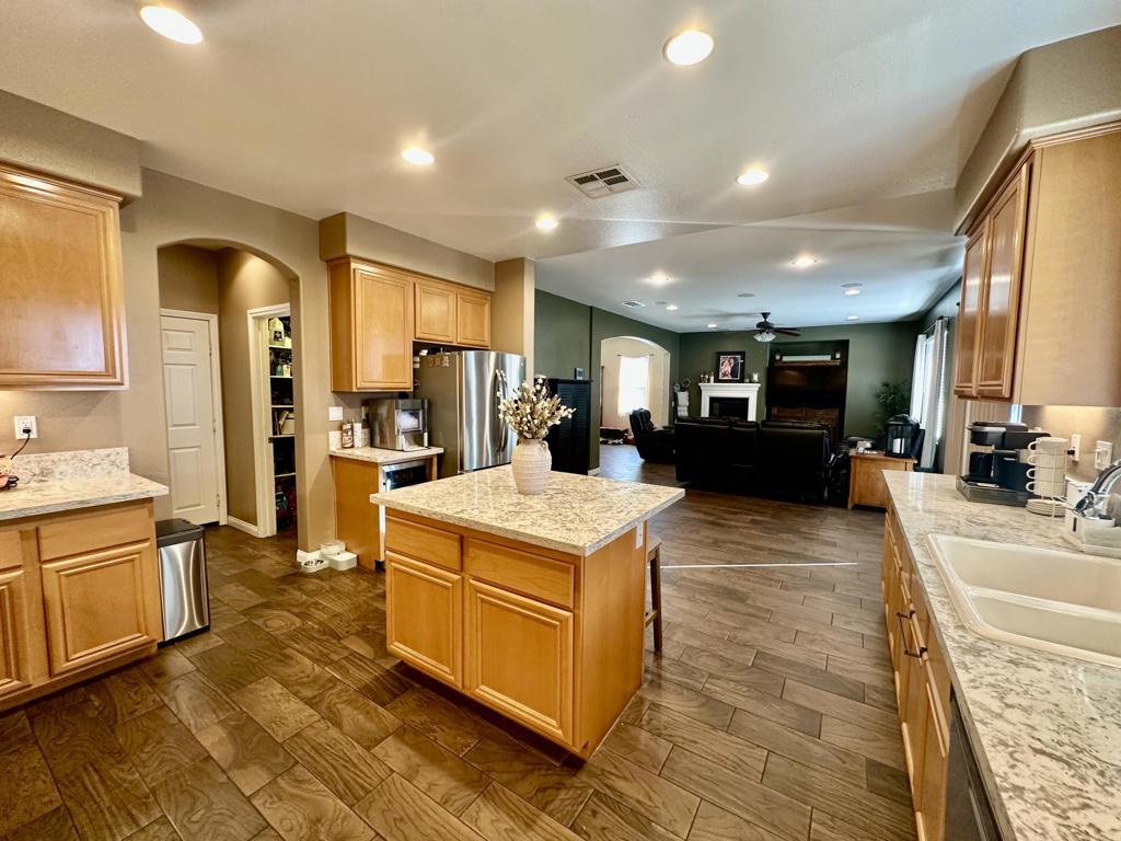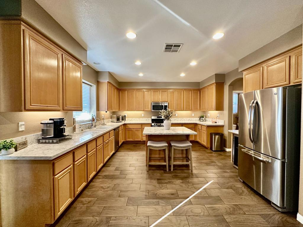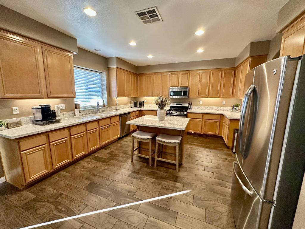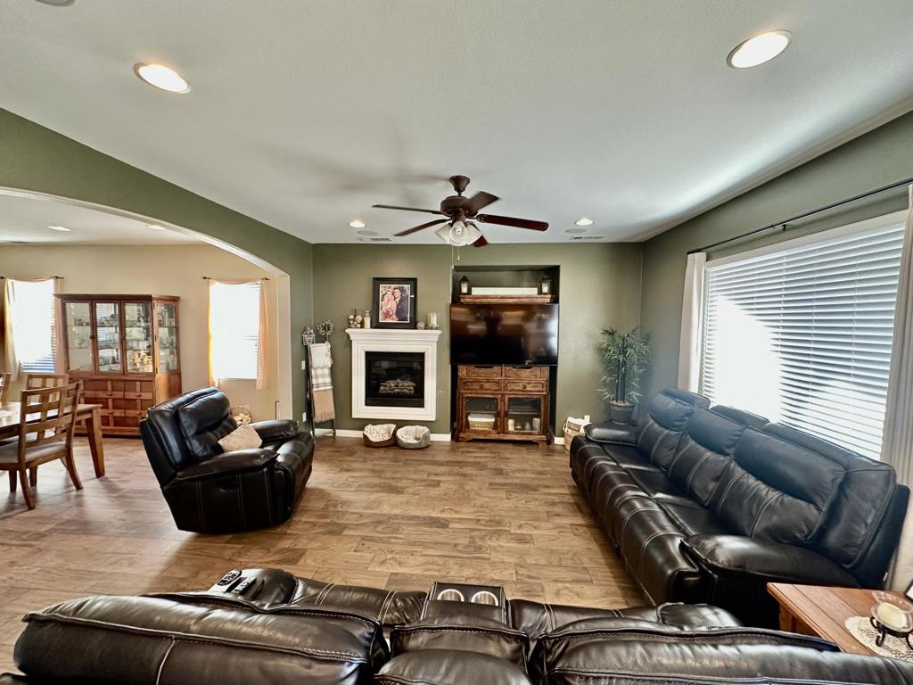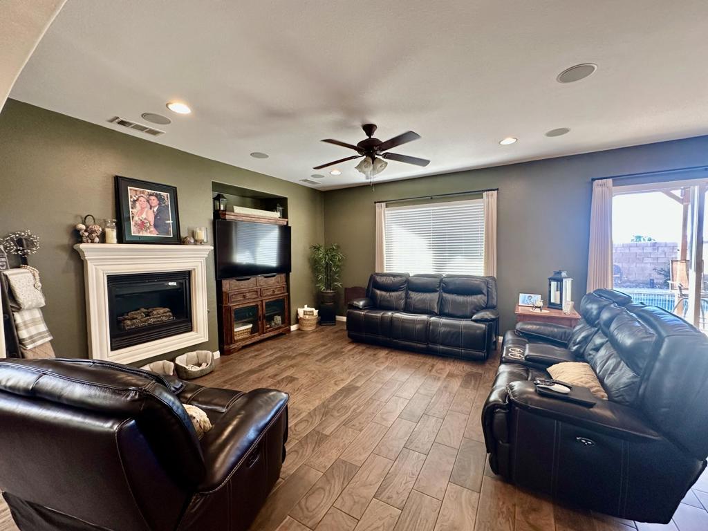 Stunning two-story pool home with RV parking, solar, and entertainer's backyard!This beautifully maintained residence offers the perfect blend of comfort, efficiency, and resort-style outdoor living. The backyard is a true retreat, featuring a 15x30 sparkling pool with raised spa, expansive concrete decking, and a covered patio ideal for entertaining. Enjoy the built-in BBQ island with mini fridge, ceiling fans, and generous space for outdoor dining and gatherings.Inside, the home showcases wood-look tile flooring throughout the downstairs, an open-concept layout, neutral designer tones, and recessed lighting. The updated kitchen is a standout with new quartz countertops, ample cabinetry, a large center island with seating, stainless steel appliances, and a Culligan water softening system with reverse osmosis.The inviting family room includes a cozy fireplace and flows seamlessly into the dining area. Upstairs, the spacious primary suite offers a relaxing retreat with plush carpeting, abundant natural light, and an en-suite bathroom featuring dual sinks, extended vanity space, and a walk-in closet. Secondary bedrooms are generously sized and versatile for guests, home office, or family needs.Additional highlights include leased solar for low summer electric bills, a high-efficiency HVAC system (approximately 2 years old) with variable-speed condenser, a 50-amp power receptacle for RV hookups, indoor laundry with cabinetry, an attached two-car garage, wide driveway with RV/trailer parking, block fencing, and low-maintenance landscaping.This move-in-ready home offers space, upgrades, and functionality rarely found, perfect for entertaining, storing toys, and enjoying year-round outdoor living.
