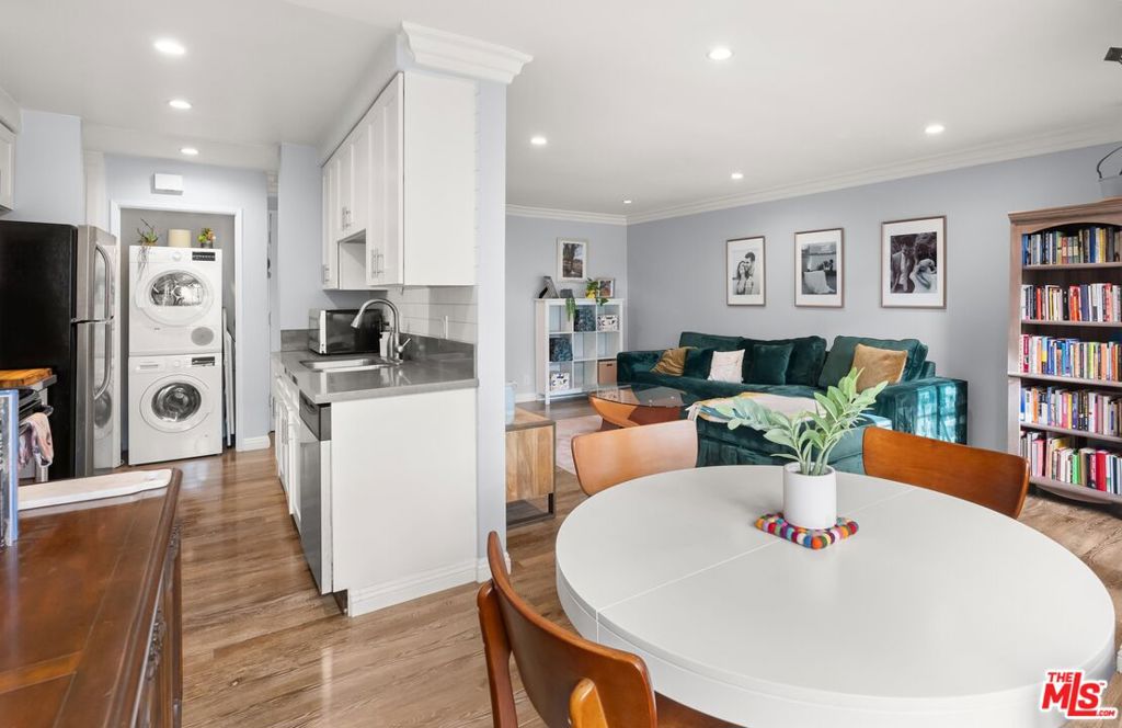 This beautiful Hancock Park condo, just 1.5 miles from Larchmont Village, features in-unit laundry and an expansive open-air patio ideal for entertaining, dining, or relaxed outdoor lounging. Inside, a spacious open floor plan, illuminated by courtyard-facing windows, welcomes you into a tastefully styled contemporary home with wood laminate flooring and air conditioning. The kitchen is outfitted with shaker cabinetry, quartz countertops, and classic subway tile. Past the Bosch washer and dryer, the bathroom is thoughtfully designed with two separate spaces; one for the vanity and one for the enclosed shower offering enhanced privacy and comfort. The oversized bedroom provides ample room for additional seating, workspace, or fitness equipment. This well-appointed community offers a swimming pool, sauna, meeting room, and an exclusive enclosed parking space. Located just two blocks east of La Brea near Melrose, this highly walkable condominium is arguably one of the best values for a one-bedroom home in the entire area. NOTE: square footage includes ~294 sqft of outdoor patio space.