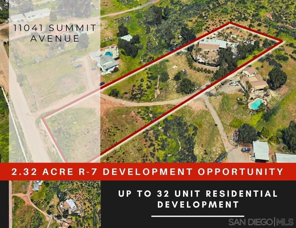 R-7 Zoning! Up to 32 Unit Development Opportunity on this 2.32 Acre Property. This property is the absolute best of both worlds, live in a country-esque environment while only being minutes away from shopping centers and freeways. Fell good knowing you can make this home exactly how you want with your own touches all while knowing you have an incredible growing value in the land you live on. Property features fully owned solar, upgraded electrical panel and new roof on main house, all only 2-3 years old. Home is extremely spacious with interior dimensions measuring approximately 2800 sqft. Property shows as 2 units on tax records. Opportunity to revert back to 2 units or customize a grand layout for the home you have always dreamed of. Parcel was approved for up-zoning to R-7 by the City of Santee as part of the 6th Cycle Housing Element. R-7 Zoning allows for 7 to 14 units per gross acre. It is a Medium Density Residential General Plan designation. Per the city's zoning code, the R-7 zone "is intended for a wide range of multiple family residential development types including detached units in planned residential development at the lower end of the density range and attached units at the higher end of the density range." Maximum lot coverage is 55%, maximum height is 35 feet/three stories, and there is no minimum lot size. Home is extremely spacious with interior dimensions measuring approximately 2800 sqft. Property shows as 2 units on tax records. Opportunity to revert back to 2 units or customize a grand layout for the home you have always dreamed of. Parcel was approved for up-zoning to R-7 by the City of Santee as part of the 6th Cycle Housing Element. R-7 Zoning allows for 7 to 14 units per gross acre. It is a Medium Density Residential General Plan designation. Per the city's zoning code, the R-7 zone "is intended for a wide range of multiple family residential development types including detached units in planned residential development at the lower end of the density range and attached units at the higher end of the density range." Maximum lot coverage is 55%, maximum height is 35 feet/three stories, and there is no minimum lot size.