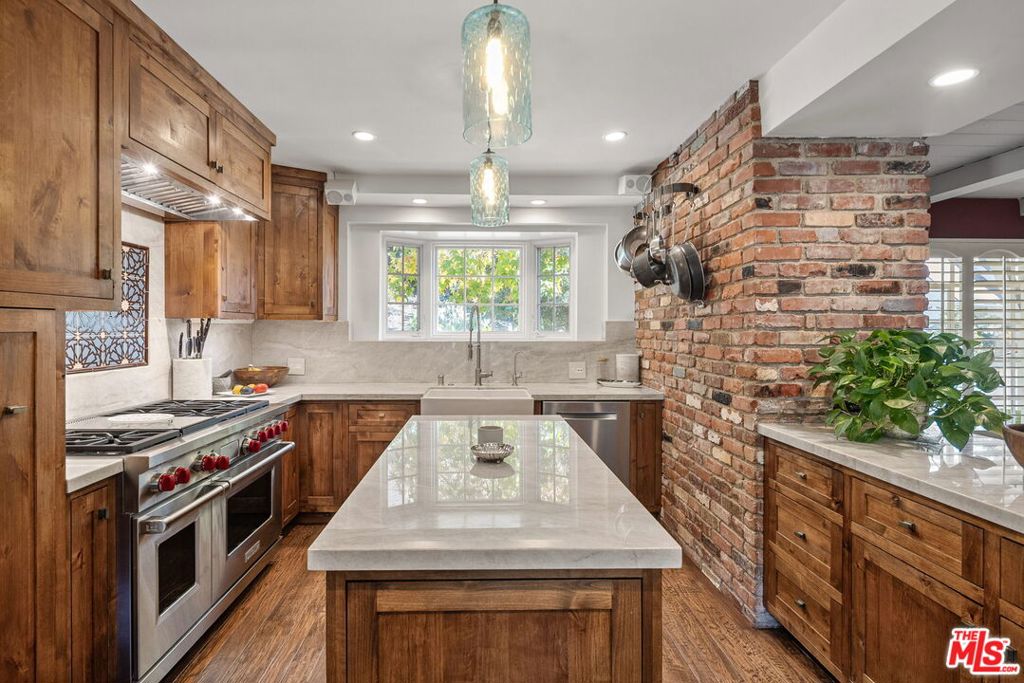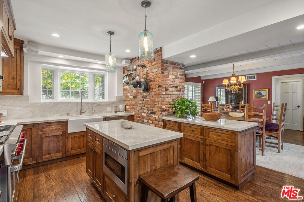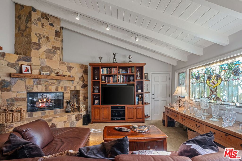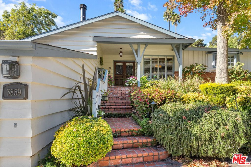 Tucked away in the coveted enclave of Upper Mandeville Canyon, 3859 Mandeville Canyon Road is a serene 1950s sprawling Ranch House nestled in the heart of one of Brentwood's most prestigious neighborhoods. Set against a lush canyon backdrop, this warm and inviting retreat offers 2,644 square feet of effortless living with 4 bedrooms, 3 bathrooms, a bonus room perfect for an office or library, a formal living room and a cozy family room, organically blending classic character with thoughtful modern upgrades. Sunlit interiors flow seamlessly along the new hardwood floors, from the updated kitchen to the beautifully remodeled Primary Suite into expansive living and family rooms, creating a home that feels both intimate and ideal for entertaining. Outdoors, the property truly shines. A resort-style pool and spa, custom outdoor kitchen, waterfall feature, and newly installed turf, landscaping and lighting set the stage for relaxed canyon living, whether hosting gatherings or enjoying quiet evenings under the stars. Meticulously maintained and thoughtfully improved, including upgraded plumbing throughout, tankless water heater, central A/C and heat, hardwood floors, remodeled bathrooms, a renovated family room with stone fireplace, Sonos sound system, ADT security, and extensive drainage and landscaping enhancements. This is a rare opportunity to own a timeless canyon home that has been lovingly cared for, offering privacy, comfort, and the unmistakable charm of Brentwood living.