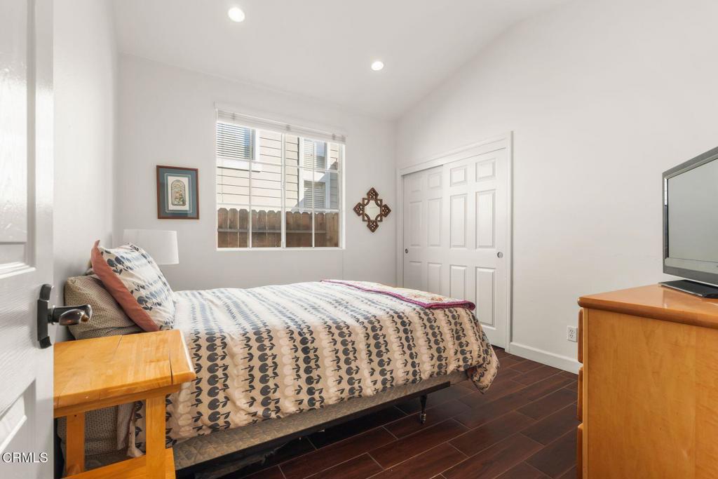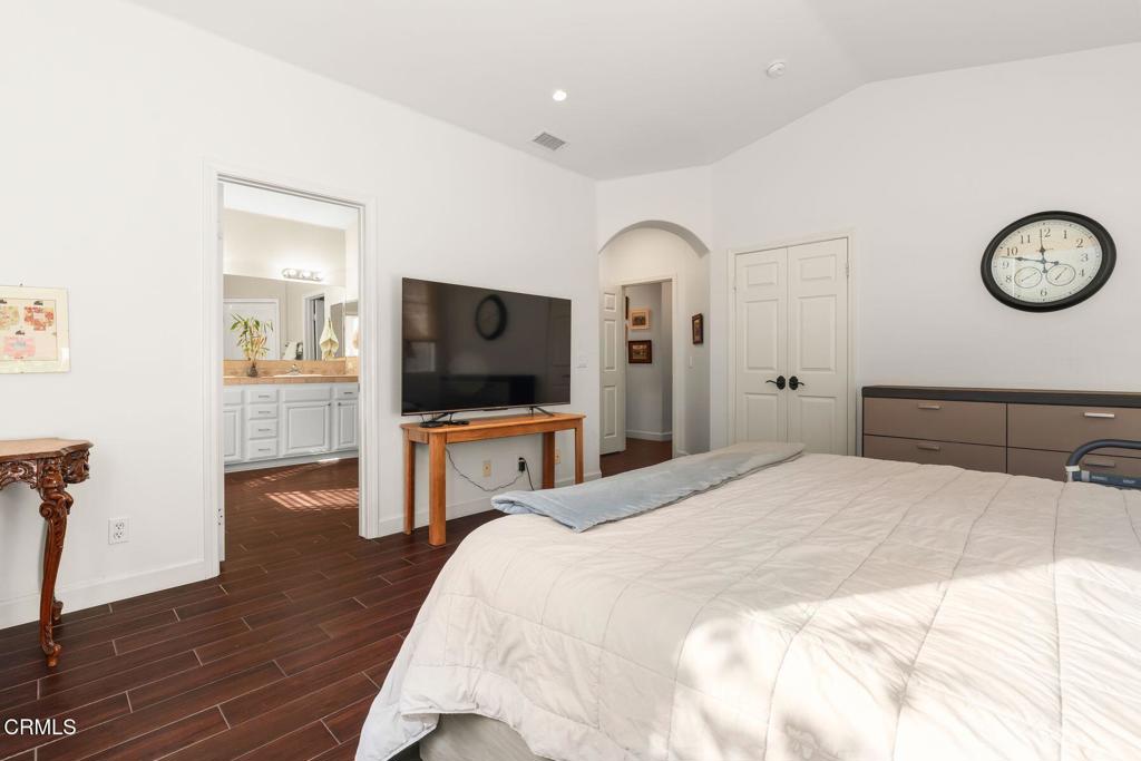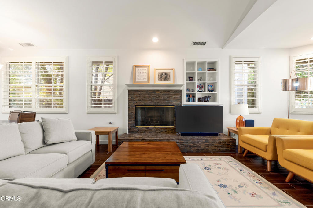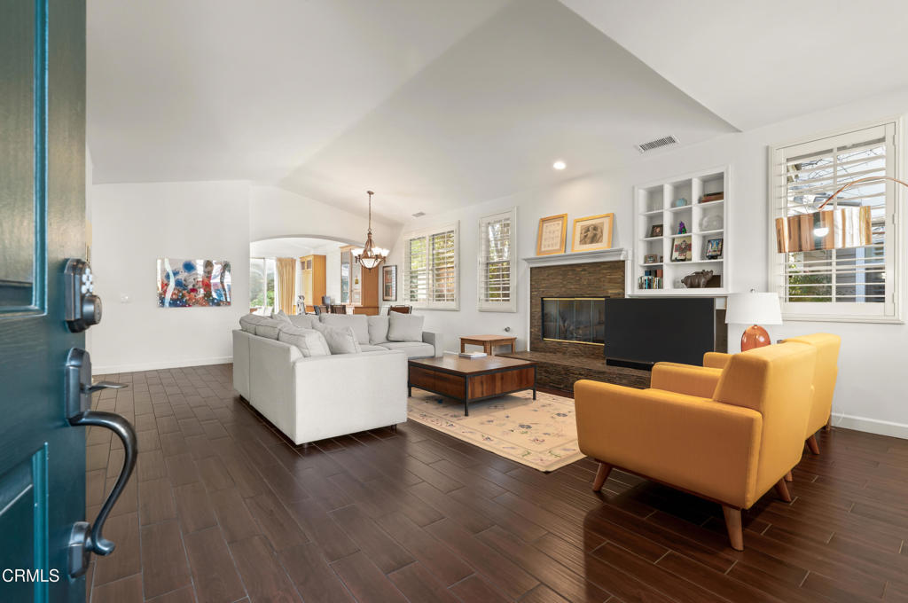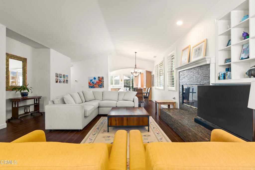 Welcome to this beautifully maintained 3-bedroom, 2-bath, single-story home offering comfort, style, and thoughtful upgrades throughout. The open living space features vaulted ceilings, a cozy fireplace, and wood-like tile flooring, complemented by recessed lighting and elegant plantation shutters that enhance both function and design. The kitchen is designed for everyday living and entertaining, showcasing quartz countertops, center island, double oven, ample cabinetry, and a convenient pantry. The spacious primary suite offers a relaxing retreat with double vanities, separate tub and shower and a generous walk-in closet. Step outside to a private, enclosed yard designed for both relaxation and entertainment, featuring stone and paver hardscaping surrounded by lush landscaping. Enjoy the benefits of paid-off solar, providing energy efficiency and long-term savings. Located within a vibrant community featuring a shared orchard with citrus and avocado trees, residents also enjoy access to a pool, playground, and BBQ area--ideal for weekend enjoyment. This inviting home blends modern upgrades, peaceful outdoor living, and exceptional community amenities, all on one easy-living level.