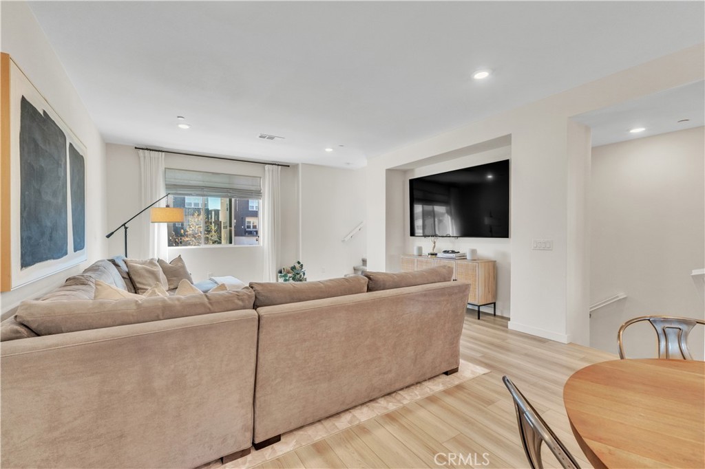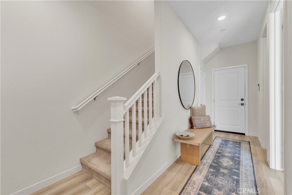 Experience exceptional modern living in the highly coveted FivePoint community of Valencia. Built in 2022, this tri-level townhome blends contemporary luxury with everyday comfort. Set in a prime location with inviting views, this light-filled 3 bedroom, 3.5 bathroom residence offers approximately 1,840 square feet of thoughtfully designed living space. The main level showcases an open-concept great room with living and dining areas that flow seamlessly into a sun-drenched kitchen. Enjoy a spacious center island, stainless steel Whirlpool appliances, walk-in pantry, Quartz countertops, and crisp white cabinetry. Wide-plank wood-like flooring and abundant natural light create a warm, tranquil atmosphere throughout. The upper level hosts the elegant primary suite, complete with plush carpeting, a generous walk-in closet, and a spa-inspired bathroom featuring dual vanities, a separate shower, and a soaking tub. An additional ensuite bedroom and a convenient laundry closet with side-by-side washer and dryer complete this floor. The lower level offers a charming entry and a versatile third bedroom, ideal as a family room, office, gym, or guest space and with sliding glass doors opening to the front courtyard. This level also includes a full bathroom with walk-in shower and direct access to the attached two-car garage. Designed for today’s lifestyle, the home includes eco-friendly upgrades such as solar panels, an Ecobee thermostat, EV charger, water filtration system, and a tankless water heater, enhancing both convenience and sustainability. Residents of FivePoint enjoy an array of resort-style amenities, including multiple pools and spas, a clubhouse, parks, sport courts, scenic hiking and biking trails, a community greenhouse, and the Community Center. All of this is just minutes from Confluence Park, major roadways, freeways, Magic Mountain, shopping, dining, and award-winning schools.