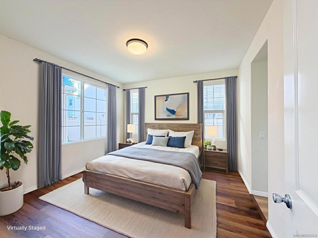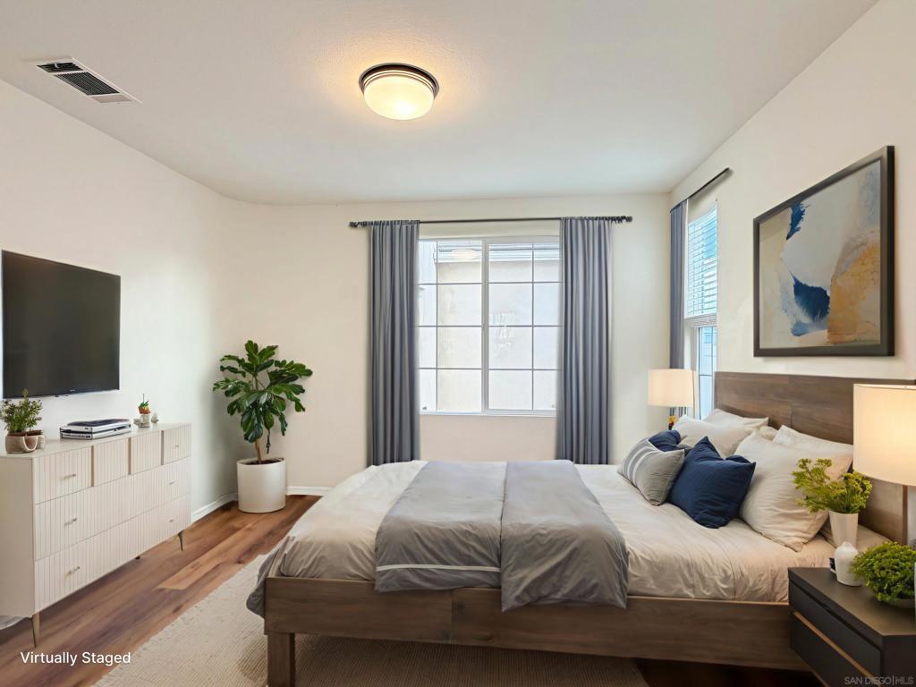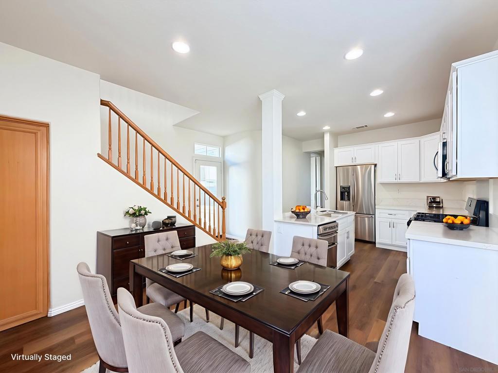 This exquisitely upgraded 3-bedroom, 2.5-bath single-family home offers 2,065 sq ft of sophisticated modern living. An open-concept layout highlights luxury vinyl plank flooring throughout, and a fully remodeled chef’s kitchen appointed with quartz countertops and premium stainless steel appliances—ideal for both refined entertaining and everyday comfort. All three bedrooms are generously sized with the primary suite elegantly situated on the main level. This private retreat features a walk-in wardrobe, dual vanities, and an indulgent deep soaking tub. The upper level presents an expansive family lounge complemented by a built-in office niche, perfect for remote work or study. Bathed in natural light, the home is enhanced by a new A/C system installed in 2022, a two-car attached garage, and owned solar panels for exceptional energy efficiency. Lush front and rear landscaping, including manicured lawns, mature trees, and shrubs, are HOA-maintained at low fees. Enjoy resort-inspired living in the highly desirable Wolf Creek community, featuring pools and spas, a fitness center, clubhouse, outdoor barbecues, and serene park spaces—conveniently located just across the street. Situated within the award-winning Temecula school district, including Great Oak High School, with nearby shopping and effortless I-15 access. Come experience the lifestyle this exceptional home has to offer!