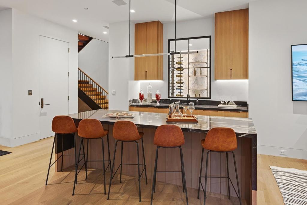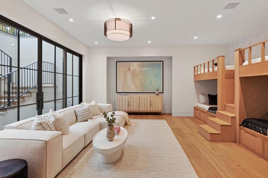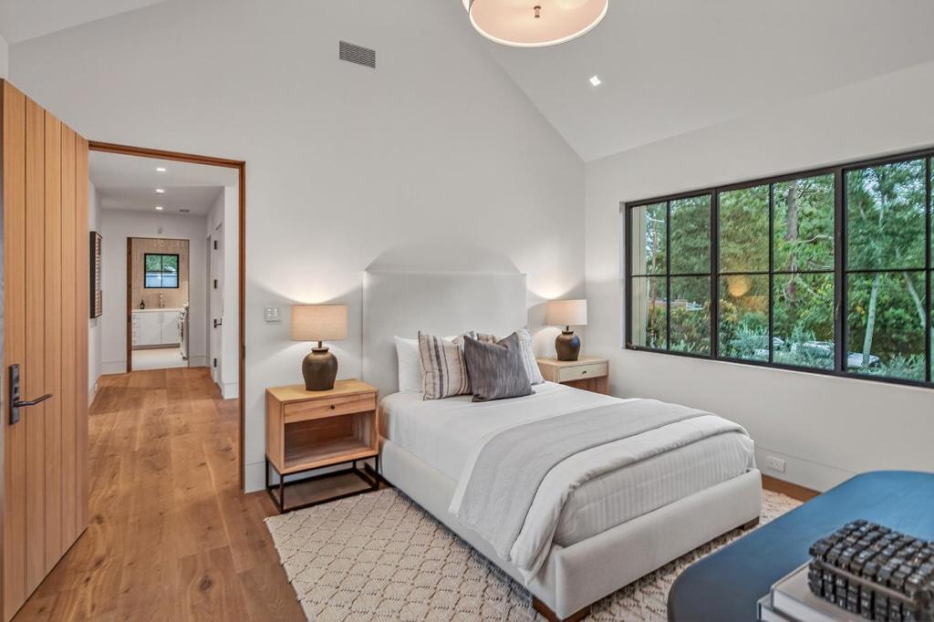 Walking distance to all that the Woodside Village has to offer, this just completed masterpiece showcases the brilliant, organic design of architect Steve Simpson and builder Gilson Development, perfectly in tune with the natural setting. The spacious three-story home, connected by elevator, presents cathedral ceilings, custom Portella steel windows and glass doors, and hydronic-heated white oak floors that span all levels. Four bedrooms and five and one-half baths in the main home are complemented by a detached office with bath and a separate one-bedroom guest house with full kitchen. The lower level featuring a sculptural stainless-steel slide that serves as both art and function, along with a theater, fitness center, steam shower, wine cellar, fully loaded HD Golf simulator, and a bunk room. Resort-style amenities unfold outdoors with a fully tiled saltwater pool and therapeutic spa, fire pit, heated terrace, and full outdoor kitchen surrounded by vast synthetic lawn and professionally landscaped gardens with exceptional lighting. Solar power, four Tesla Powerwalls, and home automation. Acclaimed Woodside Elementary School. Habitable footage: 9,406; Main house: 8,261; ADU: 799; Detached office: 346 Plus garage 550. Total all buildings: 9,956 per Seller architect drawings