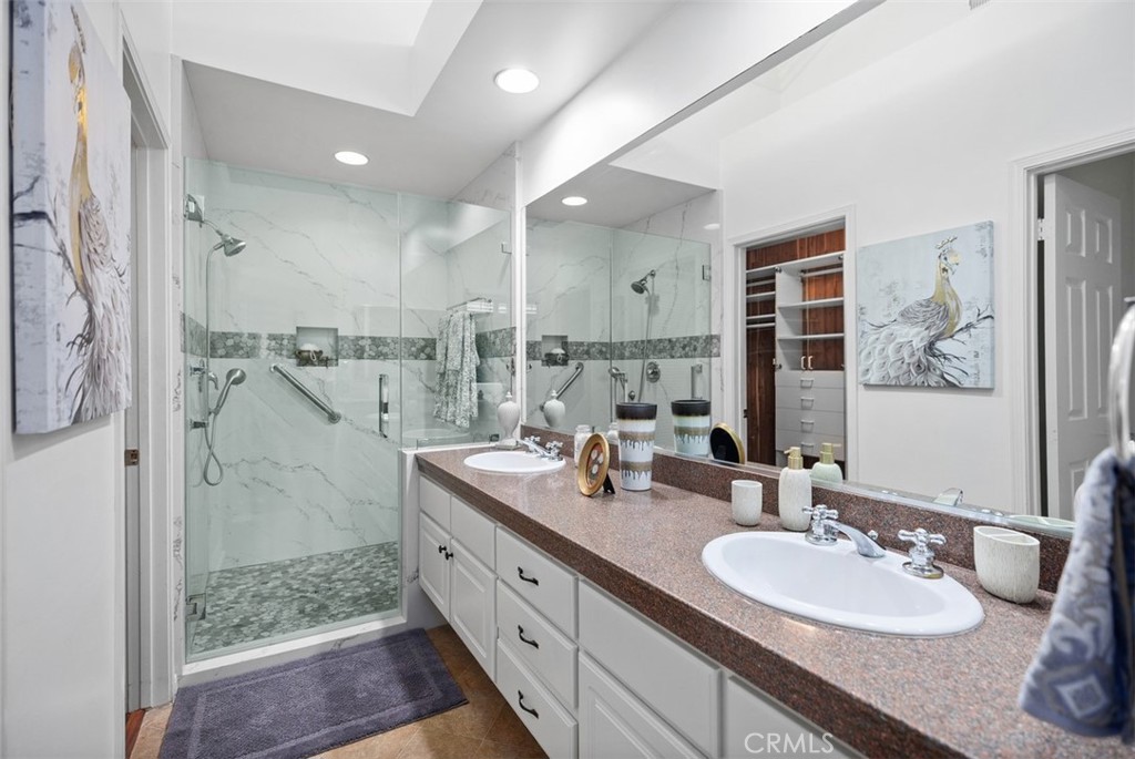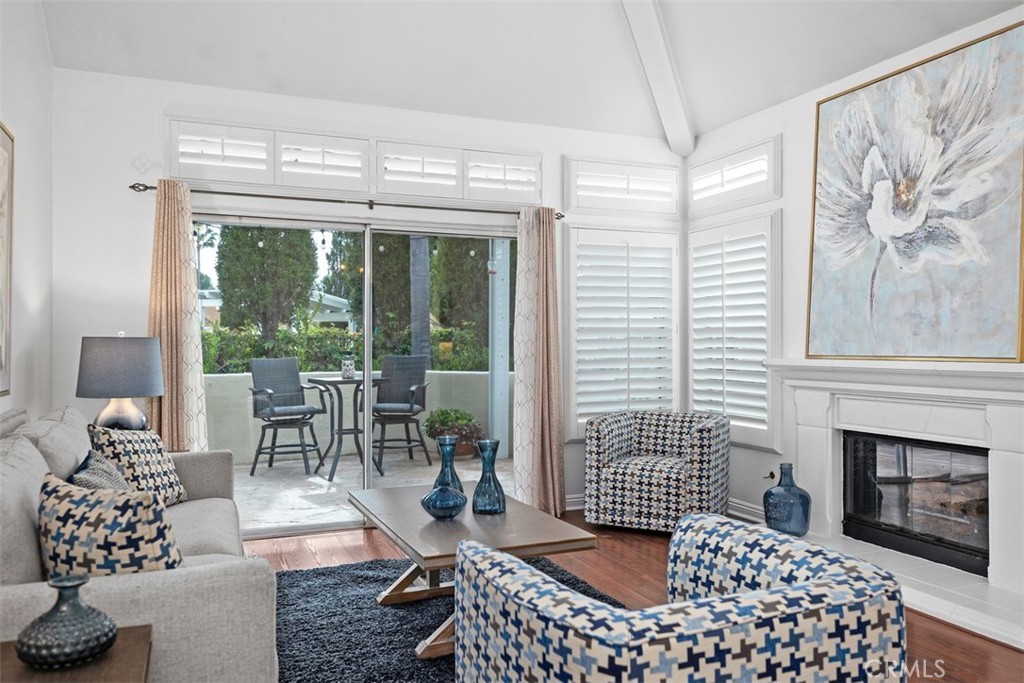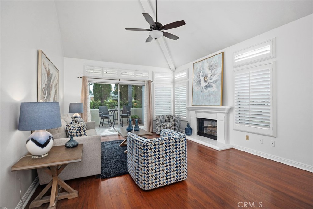 Single-level living at its best in the highly sought-after 55+ Palmia community. This two-bedroom PLUS den/office home with two full baths offers a delightful location and a fabulous, well-designed floor plan close to pool and spa—your private oasis is right outside the backyard gate. Upon entry, the welcoming foyer opens to a spacious great room featuring vaulted ceilings, laminate flooring, and a cozy fireplace. The den/office is located toward the front of the home (currently without a closet or door, but easily added), while the bedrooms are thoughtfully positioned on opposite wings for privacy. The kitchen showcases quartz countertops and includes a charming breakfast nook for casual dining. As an end unit, the home enjoys an excellent window line that fills the space with natural light and offers serene greenbelt views. Plantation shutters and ceiling fans enhance both comfort and style throughout. The primary bedroom features direct patio access and a remodeled ensuite bath with a walk-in closet, dual vanities, and a walk-in shower. The main bedroom is equipped with closet organizers to maximize storage. The outdoor space is designed for enjoyment, with areas for planting, dining, and relaxing. Alumna wood patio cover along with a convenient gate offering direct access to the greenbelt and pool/spa. The two-car garage includes an extended laundry area and built-in cabinetry for additional storage. Notable upgrades include full re-piping and fresh interior paint. Palmia residents enjoy an exceptional array of amenities, including a clubhouse, fitness center, three swimming pools and spas, an 18-hole putting green, pickleball and tennis courts, bocce ball, shuffleboard, and more. Membership also includes access to Mission Viejo Lake.