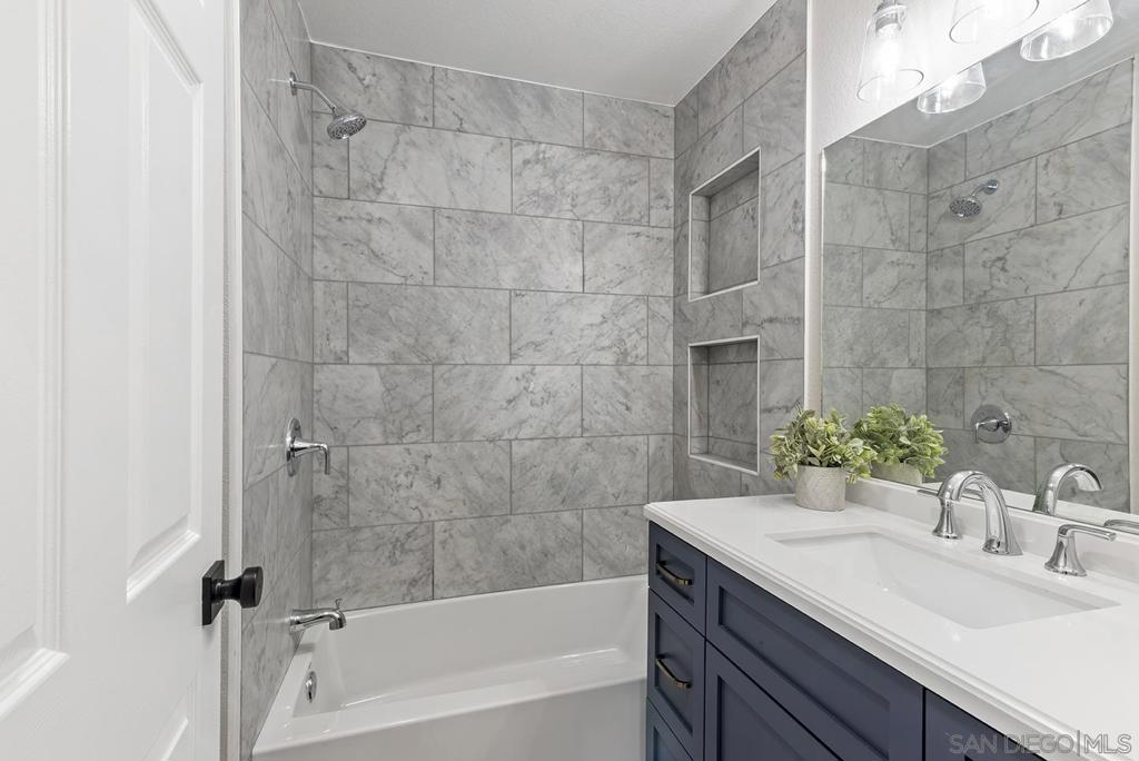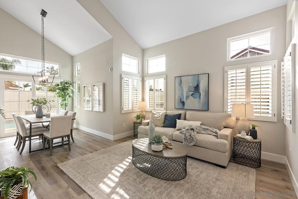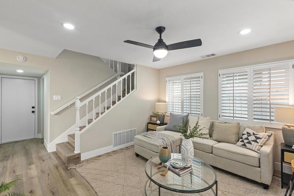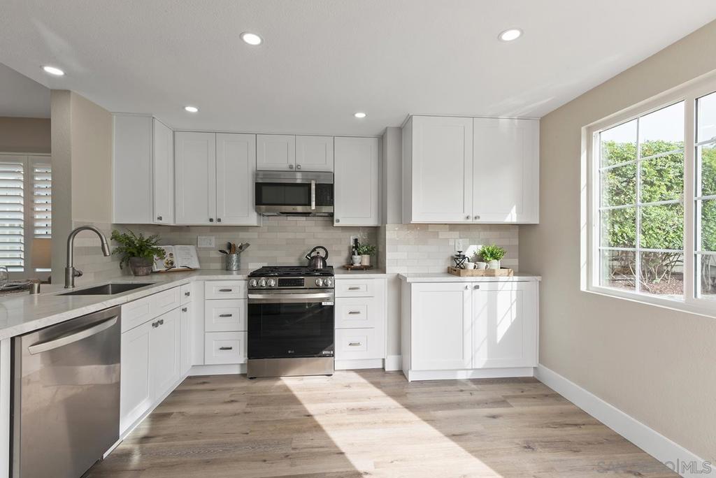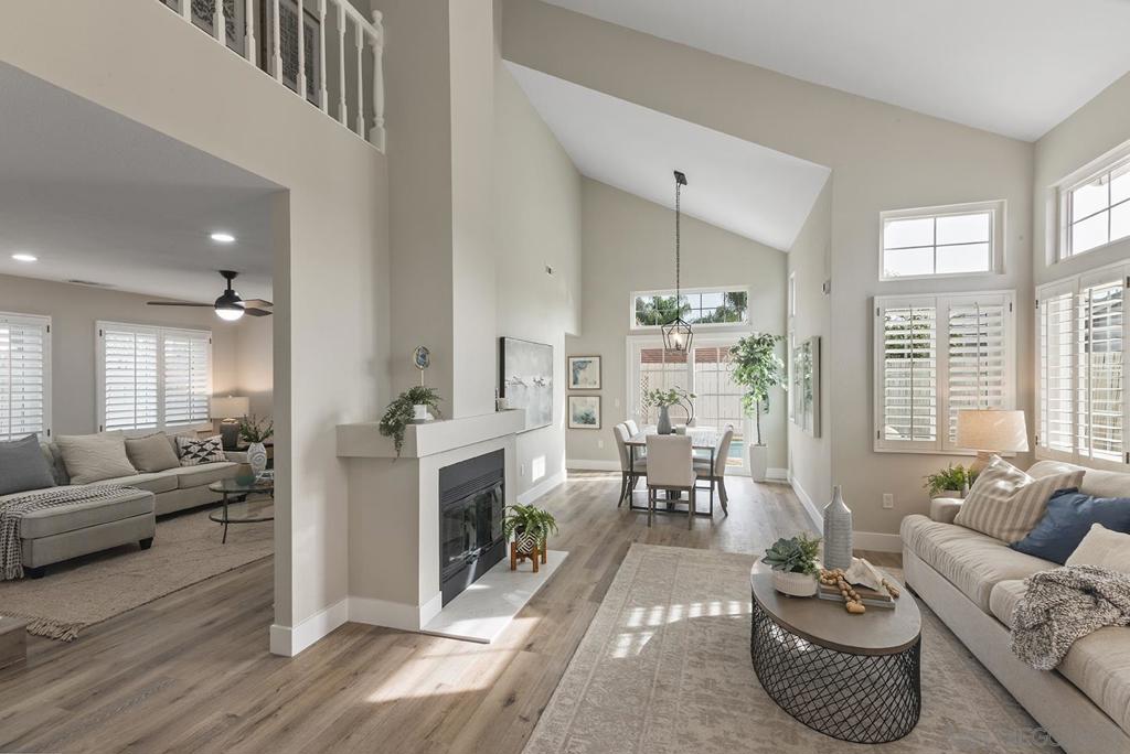 This 3-bedroom, 2.5-bath home offers 1,505 sq. ft. of updated living space with high ceilings and fresh modern finishes throughout. Recent renovations include new luxury vinyl plank flooring, new windows, interior and exterior paint, updated lighting, and new baseboards. The renovated kitchen features shaker cabinets, quartz counters, a tile backsplash, and new stainless steel appliances. Bathrooms have been refreshed with new vanities, mirrors, fixtures, a new tub, and three new toilets. Additional upgrades include a replastered pool with new tile, quartz-wrapped fireplace hearths, a painted garage floor, and a new front door. The front and backyard include a pool and low-maintenance turf in the front yard. Located in a quiet Rancho Bernardo neighborhood near schools, parks, shopping, golf, and freeway access—move-in ready and well maintained.