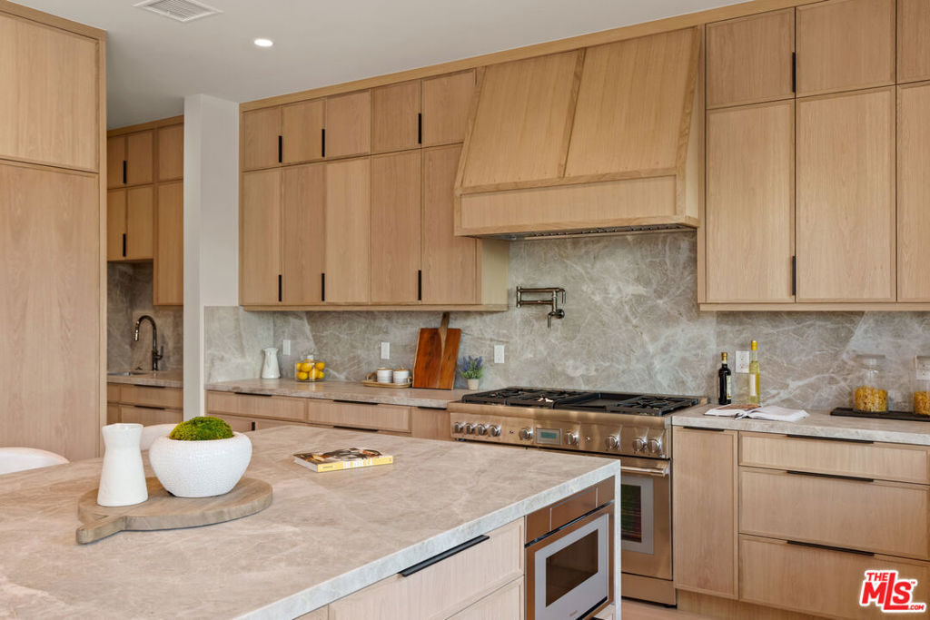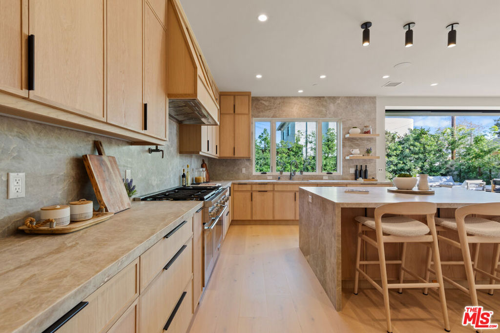 Experience elevated living in this brand-new architectural residence located in the heart of prime Mar Vista. Spanning approximately 4,134 square feet, this 5-bedroom, 4.5-bath modern masterpiece seamlessly blends clean contemporary lines with warm, timeless finishes. Light-filled open living spaces feature expansive windows and Fleetwood pocket doors, creating a true indoor-outdoor California lifestyle, complete with a thoughtfully designed mudroom-style entry closet.The stunning Taj Mahal stone chef's kitchen is equipped with custom rift oak cabinetry, top-of-the-line Thermador appliances, and a sleek butler's pantry, while natural stone finishes carry throughout the spa-inspired bathrooms. An elegant dining area flows effortlessly into the spacious family room, highlighted by plaster built-in shelving and integrated built-in speakers, ideal for both everyday living and entertaining. Built-in speakers extend throughout the home, enhancing comfort and functionality.A private main-level in-law suite provides ideal flexibility for guests or multi-generational living. Upstairs, the luxurious primary suite impresses with vaulted ceilings, a spa-like bath featuring an oversized walk-in shower, a custom walk-in closet, and refined finishes throughout.Designed for year-round enjoyment, the outdoor living spaces offer inviting lounge areas, while wired security cameras provide added peace of mind. Ideally situated just minutes from Venice, Abbot Kinney, Santa Monica, Culver City, and Mar Vista's best dining and shopping, this exceptional home offers the perfect blend of style, comfort, technology, and location.