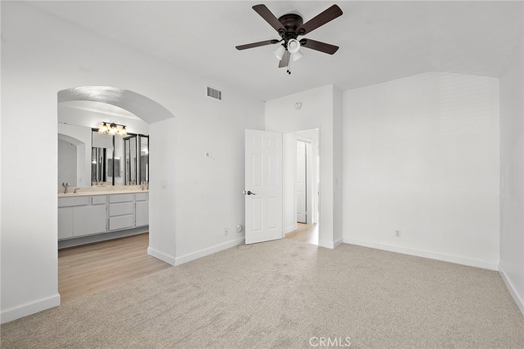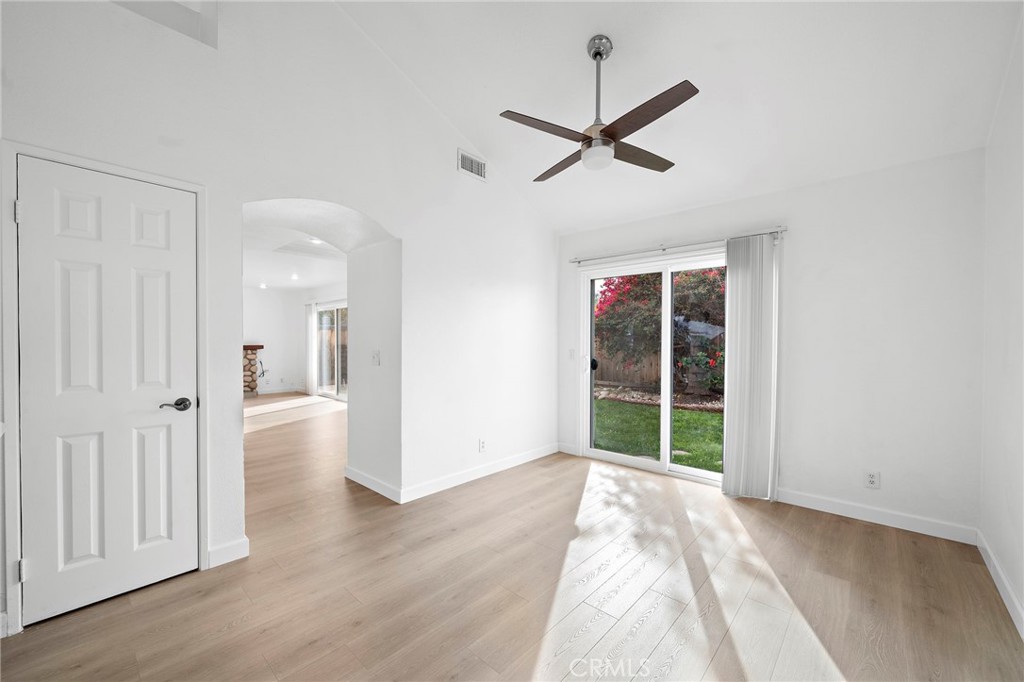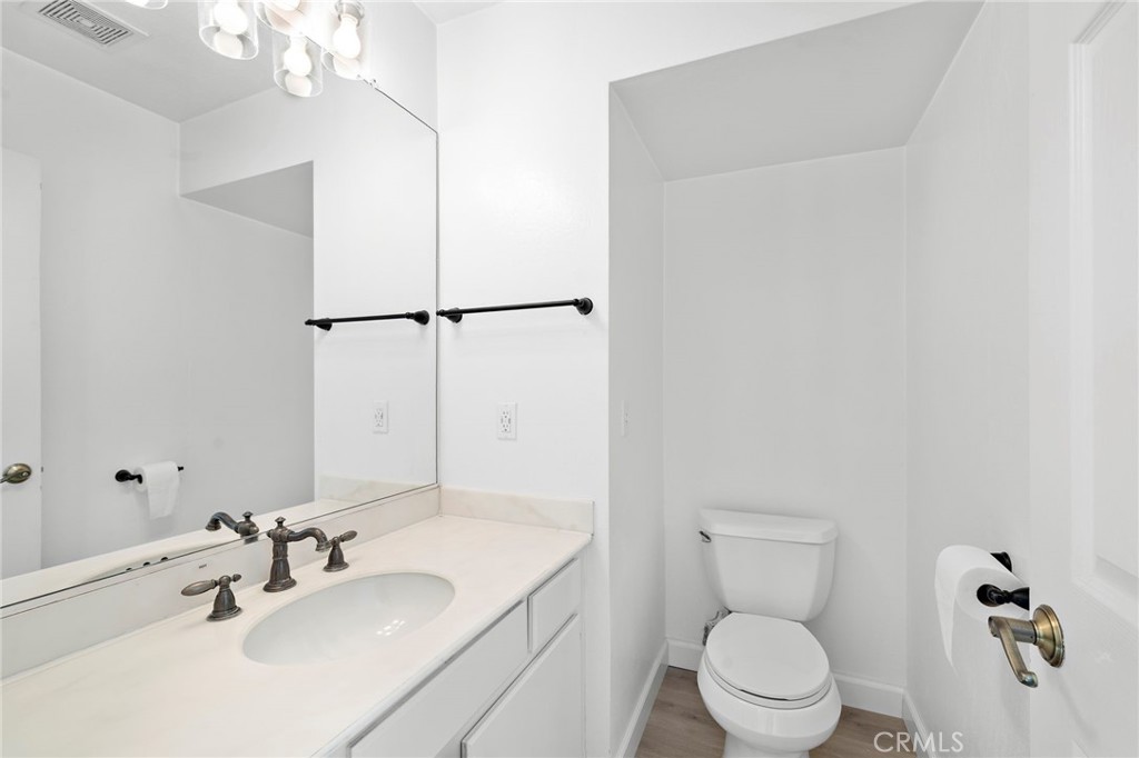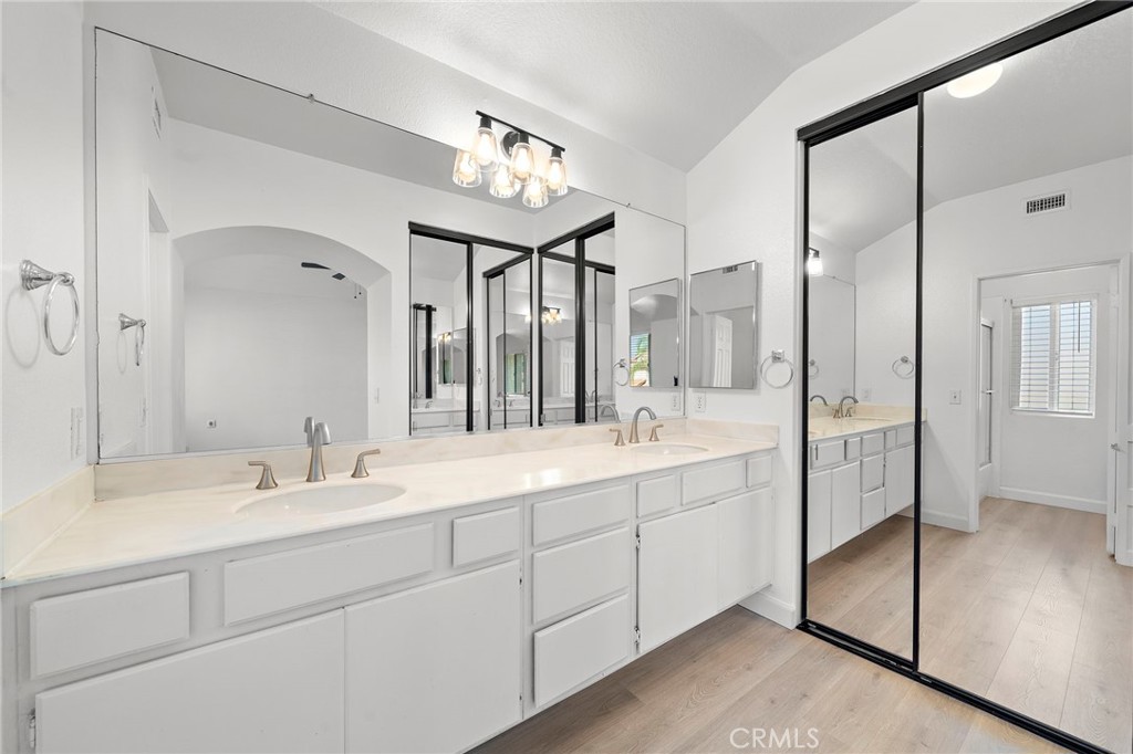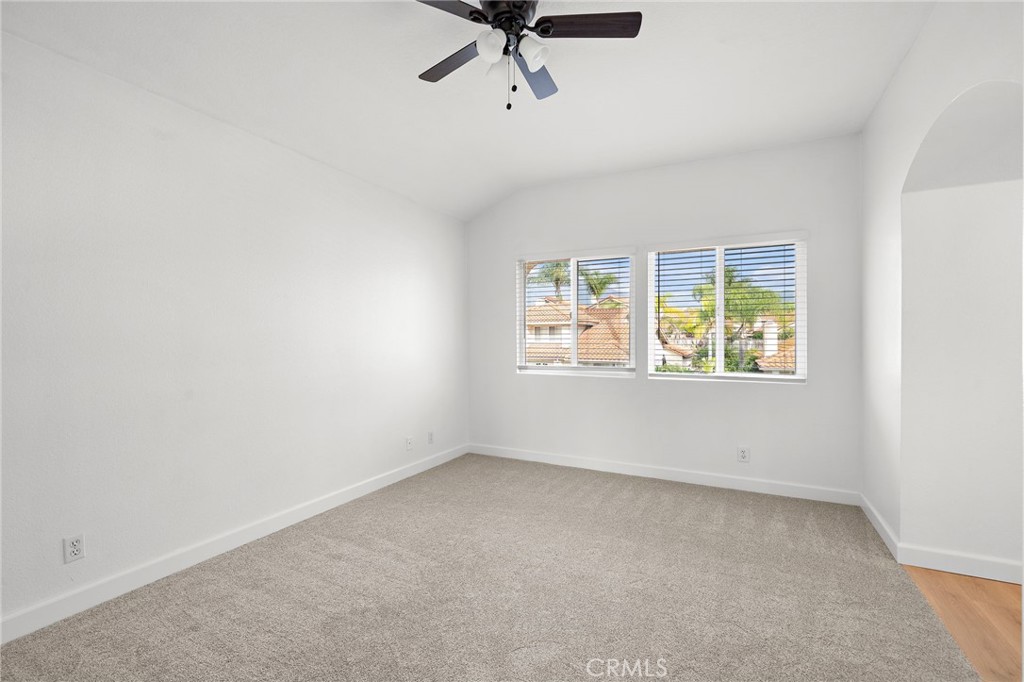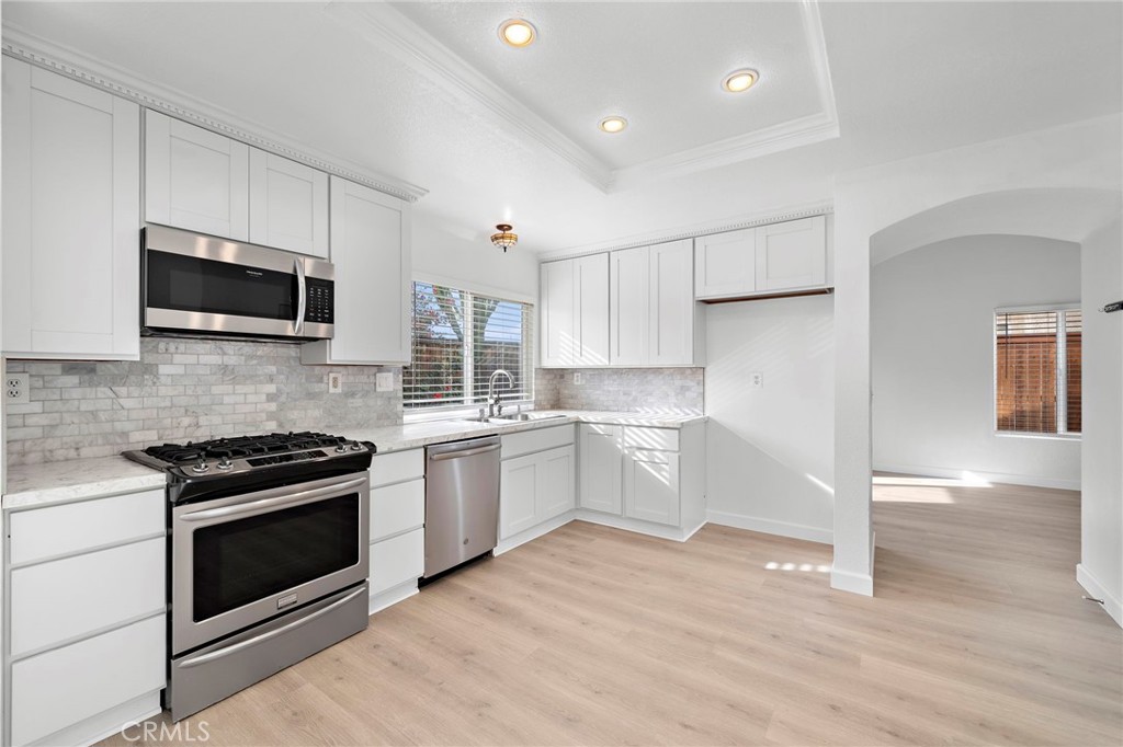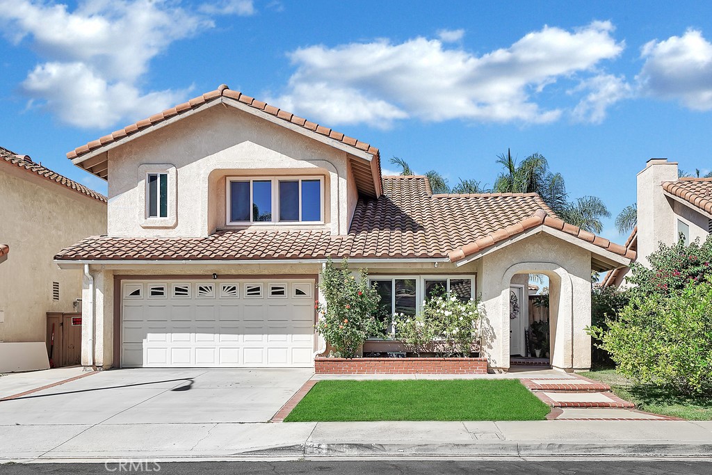 Charming home with soaring vaulted ceilings, two-story with three full bedrooms, two and one-half baths, two-car direct access garage and a spacious backyard! Open floor plan with new wood laminate and plush neutral carpet, designer paint, ceiling fans, mirrored closet doors, stone fireplace, recessed lighting and more! Remodeled kitchen includes quartz countertops with full subway tile backsplash and stainless steel appliance package! Primary bedroom with soaring vaulted ceiling and opulent bath with dual sinks. Conveniently located within walking distance to Santa Margarita Town Center! Enjoy resort-style amenities and award-winning schools!