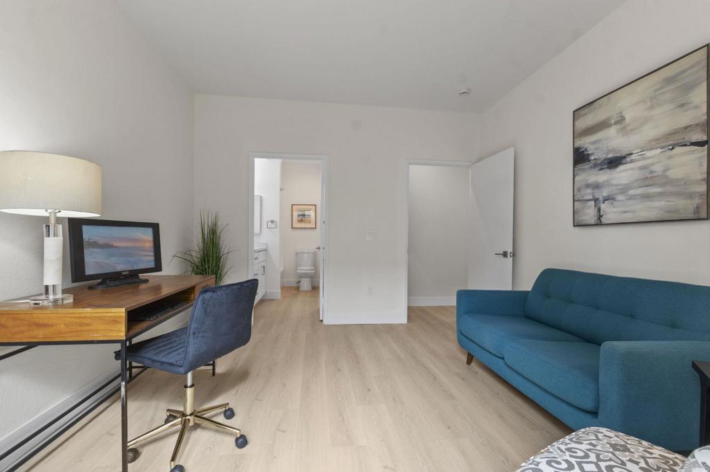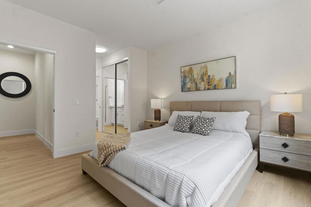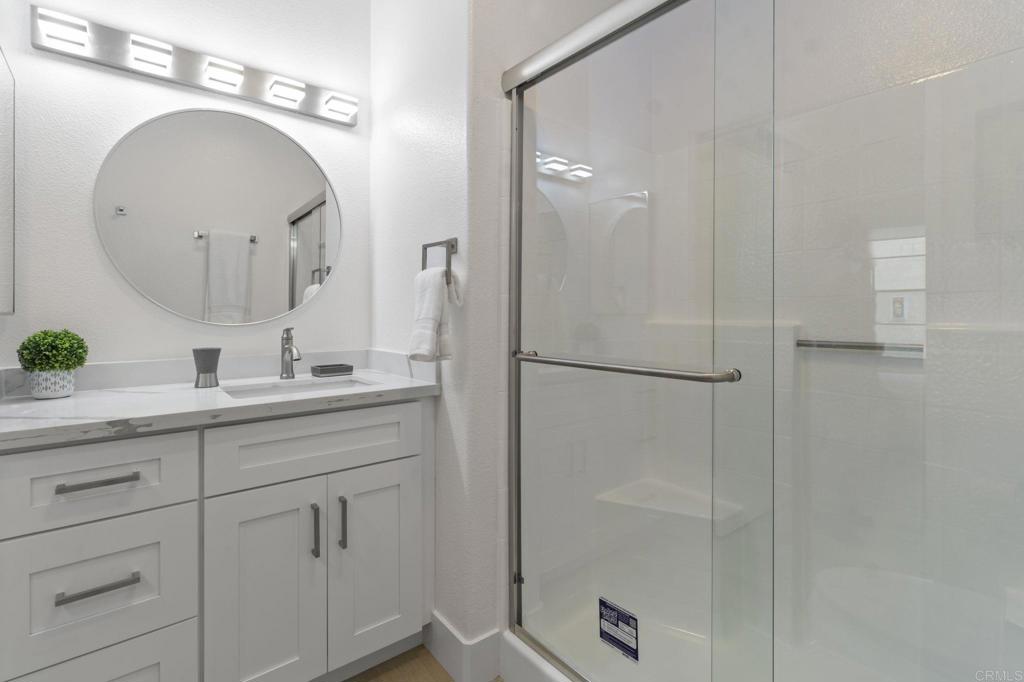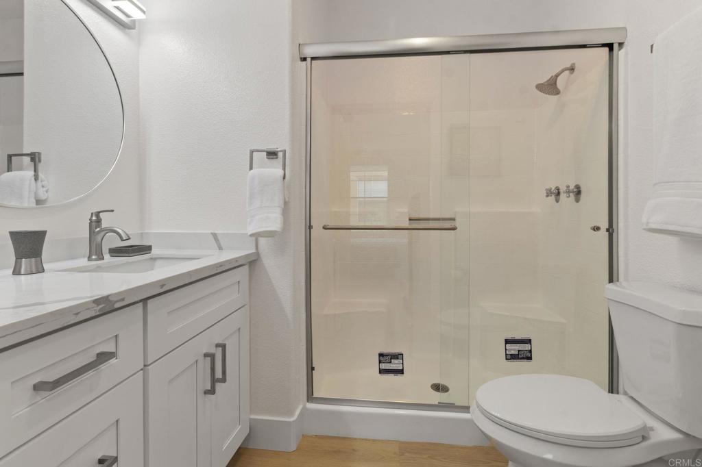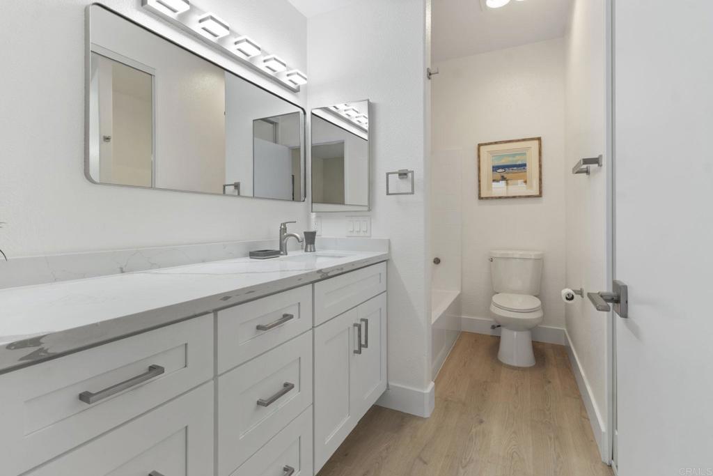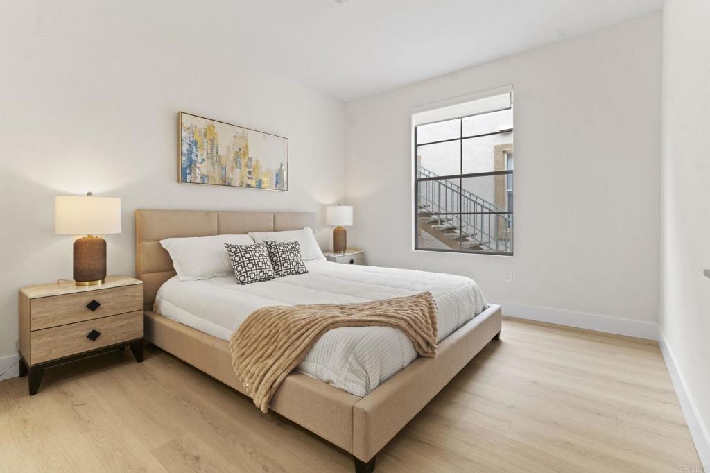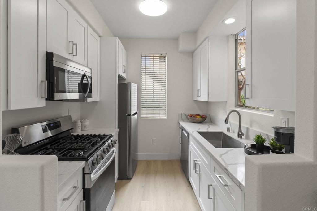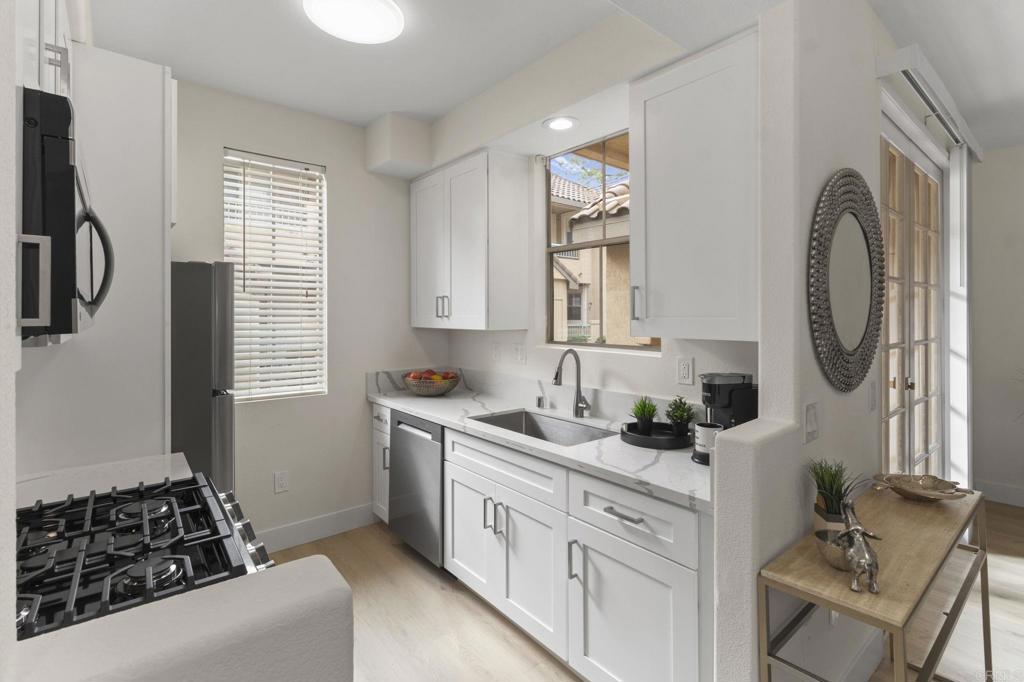 Step into this beautifully renovated 2-bedroom, 2-bathroom condo that seamlessly combines comfort and convenience. Located in a desirable community with resort-style amenities, this home offers the perfect setting for relaxed Southern California living. Enjoy the 9-foot-high ceilings and cozy evenings by the charming fireplace in the open living room and dining area. Get creative in the updated kitchen, which boasts ample counter space and storage, featuring all-new shaker cabinets, quartz countertops, and stainless-steel appliances. The spacious primary suite includes a private en-suite bathroom and generous closet space, complete with custom cabinets from San Diego Closet Design. The second bedroom is ideal for guests, a home office, or a family room. It also includes an updated bathroom with a new vanity and countertops, custom closets, and a refinished tub/shower. Unwind on your private decks or take advantage of the community amenities, which include a sparkling pool, spa, and fitness center. This condo offers in-unit laundry, two assigned parking spaces, and a prime location close to shopping, dining, and freeway access. This home truly has everything you need and more. Don't miss out on this rare find—come see it today and envision yourself living the easy, breezy lifestyle you deserve!