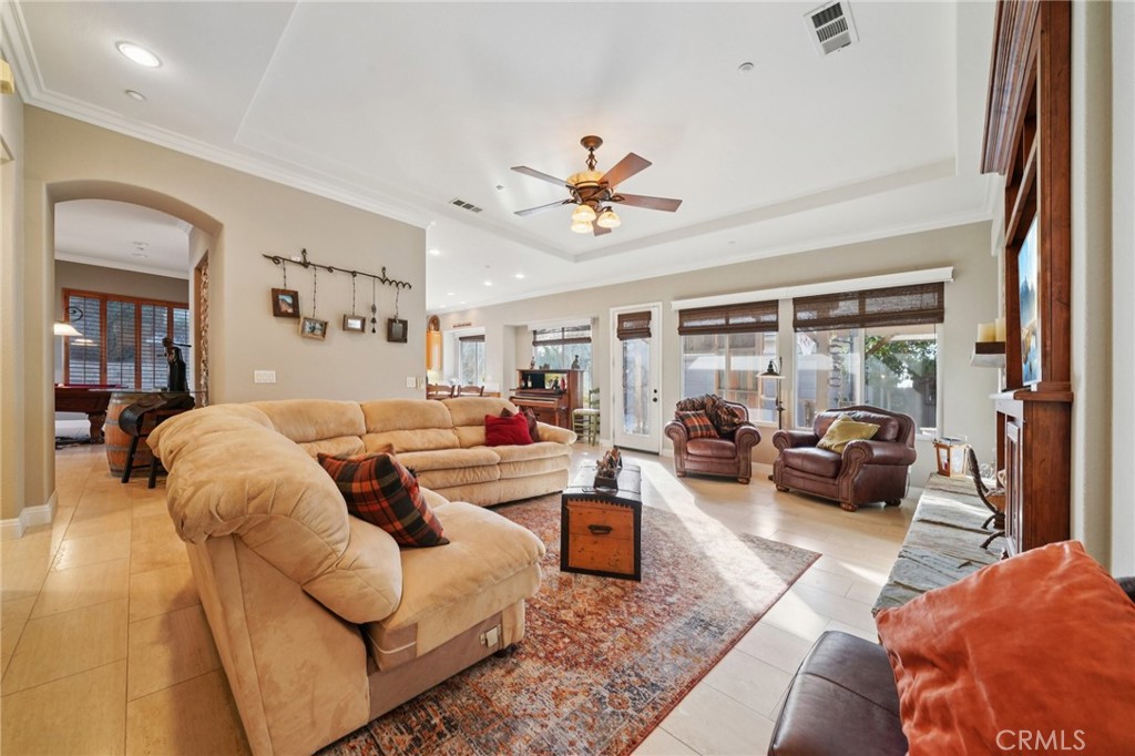 NO MELLO ROOS! Welcome to this stunning single-story ranch-style home in the highly desirable Wild Horse Estates of Norco Hills. Offering 2,480 sq ft, this beautifully appointed residence features 4 bedrooms and 2.5 bathrooms on an expansive 23,000+ sq ft equestrian-zoned lot with breathtaking city lights views. Step onto the cozy covered front porch and into a home showcasing deluxe travertine flooring, tall ceilings with crown molding, a formal living room, and a formal dining room conveniently located off the kitchen. The spacious family room is anchored by a custom stacked-stone fireplace with a wood mantel, full-width hearth, and a custom upgraded media niche with accent lighting. The kitchen offers an island layout, ample cabinetry, and flows seamlessly into the main living areas—perfect for entertaining. Additional highlights include an inside laundry room, a long gated driveway, RV parking, and a 3-car detached garage. Outdoors, enjoy beautiful paver walkways and driveway, a low-maintenance front yard, an above-ground spa perfectly positioned to soak in the city lights, and a custom-built western-themed outdoor bar area ideal for gatherings. Horse enthusiasts will love the large community riding arenas directly across the street and miles of scenic riding trails right outside your gate. The office/bedroom features a separate French door entry, making it ideal for guests, multigenerational living, or a private home office. This is true Norco living—space, views, and an unbeatable equestrian lifestyle, all with NO MELLO ROOS.