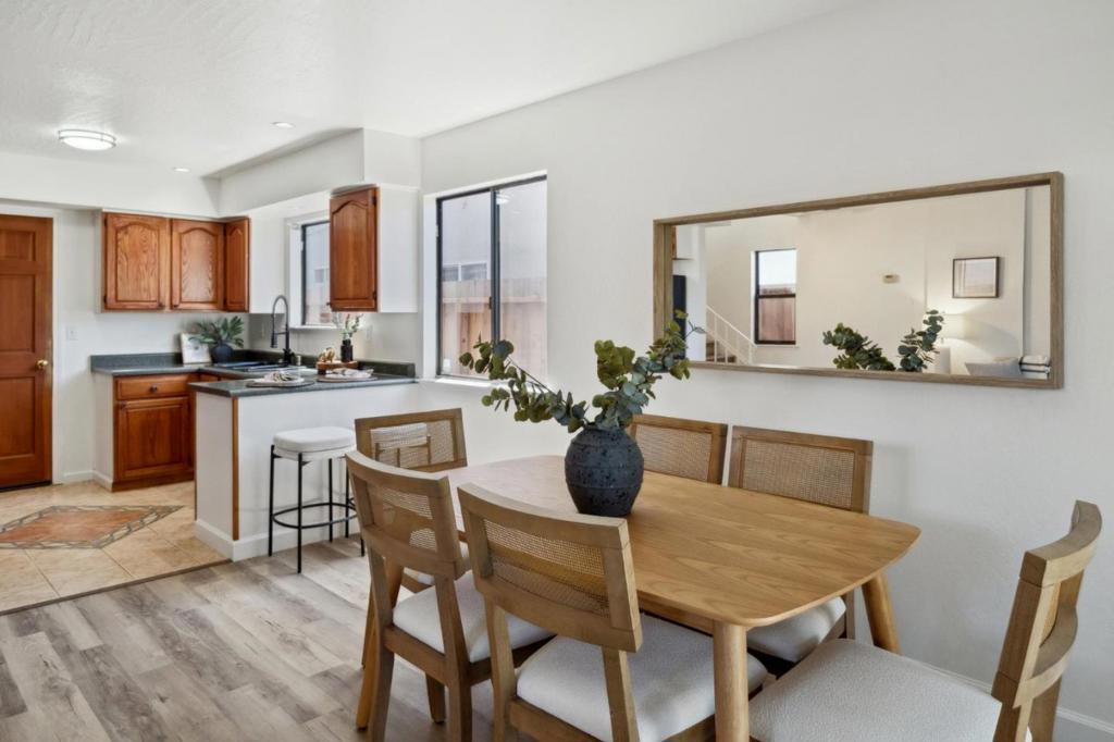 Welcome to this charming home that blends warmth, comfort, and convenience. The open floorplan is flooded with natural light, highlighting the fresh interior paint and modern feel. The spacious kitchen features a breakfast bar, perfect for casual dining or entertaining. Unwind by the wood-burning fireplace in the living area, or step through the sliding glass door to a beautifully stone-paved backyard ideal for outdoor dining and relaxation. Upstairs, you'll find a generously sized primary bedroom with partial ocean views, offering a peaceful retreat where you can fall asleep to the sound of waves. The large bathroom includes both a separate stall shower and a luxurious soaking tub. Located with easy access to Highway 280, this home offers a convenient commute to San Francisco, SFO Airport, San Mateo, and Silicon Valley. Enjoy being within walking distance to all Pacifica has to offer, including great hiking trails, beaches, local cafes, restaurants, and grocery stores, making everyday living effortless and enjoyable.