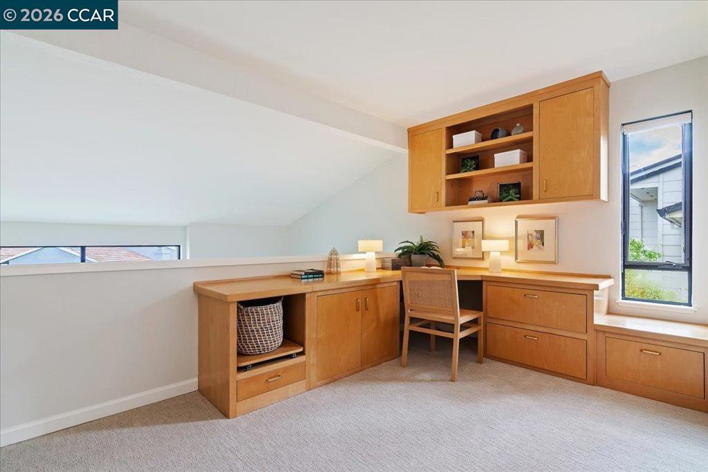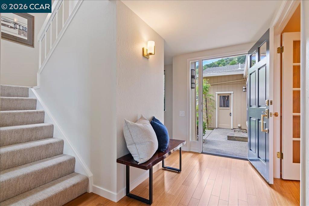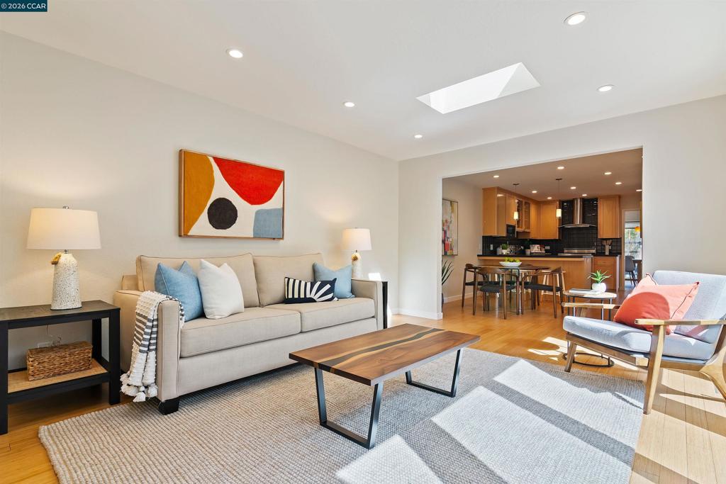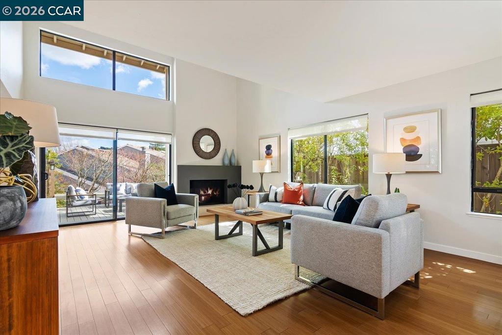 Welcome to your serene oasis in the Moraga Country Club! On a quiet cul-de-sac, this bright end unit townhouse offers 2 BR + a den along and 2,038 sqft of beautifully remodeled & expanded living space. Elegant hardwood flooring flows throughout the main areas with dramatic vaulted ceiling in the living room and high windows to fill the home with natural light and create a warm and inviting atmosphere. The remodeled kitchen with premium Viking gas range, upgraded countertops & cabinetry flows into breakfast room and expanded family room/great room. This bonus room is right where you want it - off from the kitchen, not detached over the garage. Each bedroom includes its own en suite bathroom, while the balcony den/office offers versatile space for so many uses. The attached garage is equipped with a pull-down ladder for bonus storage providing plenty of space for all your belongings. Outside, enjoy the tranquility of a gated courtyard garden with a soothing water feature or unwind on the rear deck with creek-side views of the surrounding hills. Access to unlimited golf, tennis, swimming in 4 pools incl one just steps away, pickleball, fitness center, bocce, and two restaurants year-round while you vacation at home!