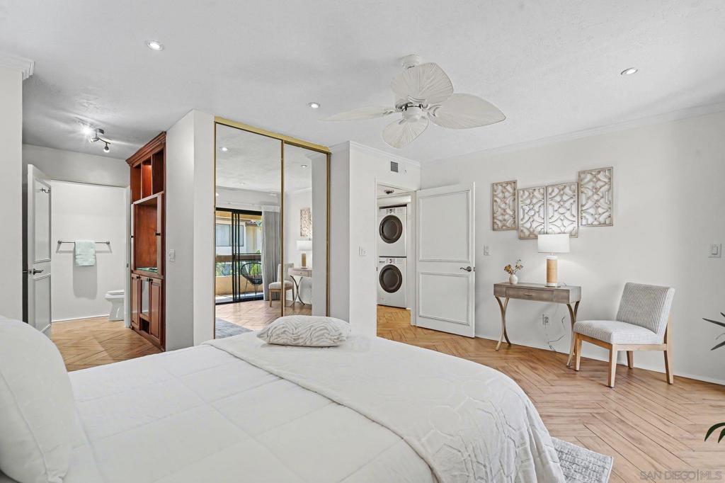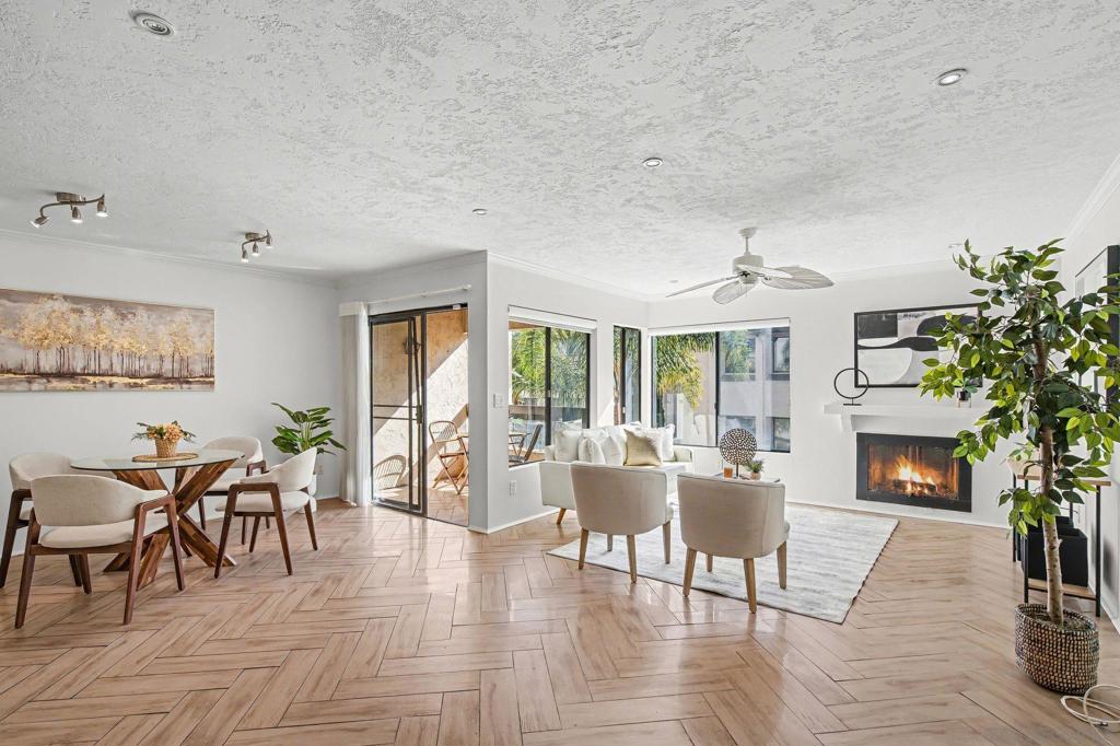 Experience the best of San Diego living in this bright and spacious end-unit located in the heart of Fashion Valley. Completely updated with luxury tile flooring throughout, this 3-bedroom, 2-bathroom home radiates modern charm. The remodeled kitchen is a delight, featuring sleek finishes and full-size appliances. Retreat to the primary suite offering a custom-built vanity and cabinetry, or cozy up by the living room fireplace. Unique features include a built-in bar for entertaining, in-unit laundry, and two private patios perfect for morning coffee. Mission Greens offers resort-style amenities including a pool, spa, two saunas, and a gym. Complete with a private storage room, one garage space, and one assigned spot. Centrally located near top-tier shopping and dining, and under 10 minutes to the beach, Downtown, and the airport. Welcome home!