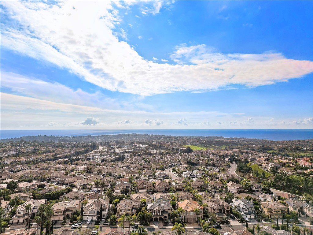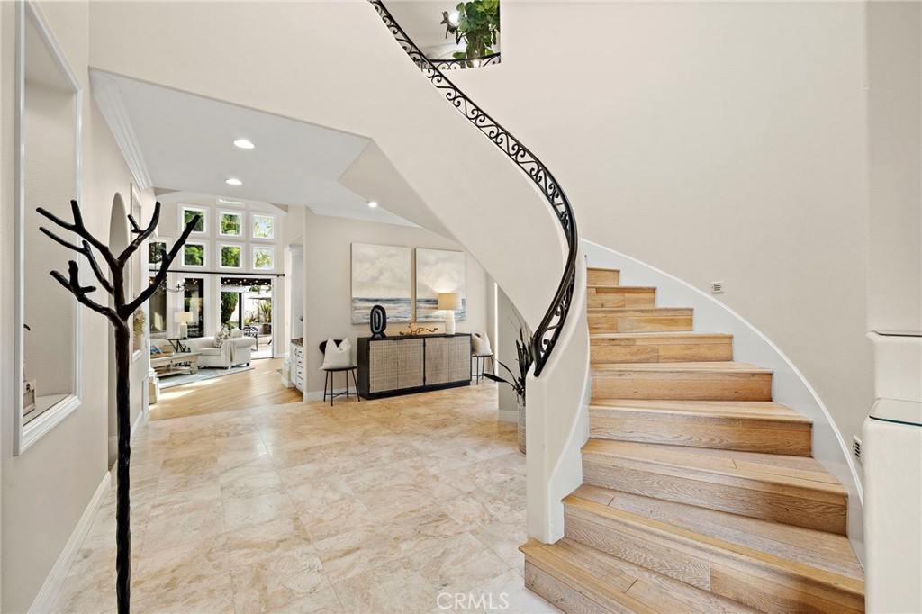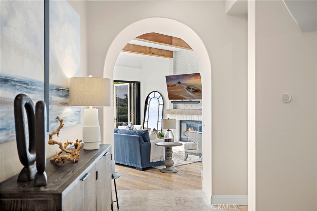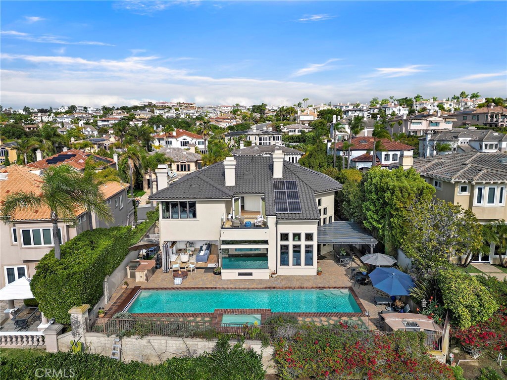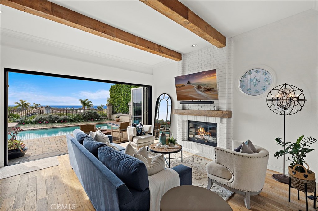 Positioned behind the gates of Ocean Ranch, this coastal residence captures EXPANSIVE OCEAN & SUNSET VIEWS (photos do not do justice) from Both First and Second Floors. Stone flooring introduces the entry, transitioning to vintage oak floors that continue throughout both levels of the home. The kitchen features custom cabinetry, Mont Blanc leathered quartzite countertops, reclaimed wood shelving, and a generous island. High-end appliances include double Bosch dishwashers, Bosch double ovens, a Dacor induction cooktop and refrigerator, wine storage, and a walk-in pantry. The kitchen opens to both the family room and a large adjacent breakfast nook, featuring an expansive picture window with glass-to-glass panel connections that frame the ocean view. The family room is anchored by a fireplace, reclaimed ceiling wood beams, and LaCantina bifold doors, creating an indoor-outdoor connection. The main level also includes a guest bedroom with en-suite bath, built-out library or home office, formal living and dining rooms, a powder bath with Venetian plaster, and a well-equipped laundry room with utility sink and laundry chute. Upstairs, the primary suite enjoys elevated ocean and San Clemente Island views and shares a double-sided fireplace with an adjacent office or retreat. The office/retreat features French doors that open to a sizable deck with spectacular ocean views. The primary bath includes a soaking tub, walk-in shower, imported Italian tile, dual vanities, and 2-spacious walk-in closets with custom organizers. Two additional guest bedrooms each offer en-suite baths. The backyard is designed for both entertaining and everyday enjoyment, with a saltwater pool and spa, waterfall feature, fire pit, built-in BBQ, separate bar, outdoor shower, and an inviting pergola with integrated lighting. Mature landscaping and ocean breezes complete the setting. Additional features include paid for solar panels, epoxy-coated plumbing, a low-water irrigation system. Ideally located near the harbor, beaches, and award-winning schools.