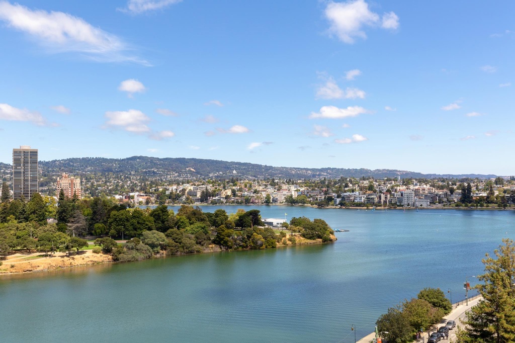 Your own private sanctuary! This sexy corner unit boasts floor-to-ceiling windows and an expansive 30+ foot patio with panoramic Lake Merritt views. Enjoy your morning coffee or al fresco dining as the lake becomes a living canvas from sunrise to sunset. The owners spared no expense in a high-end renovation. Custom closets, double-pane windows, and a spacious integrated work area with built-ins blend beauty and function. Italian stone floors and diamond-finished plaster walls exude craftsmanship, while the chef’s kitchen features Miele appliances, a Caldera glass-top stove, and seamless cabinetry. A dedicated bar with sink and refrigerator makes entertaining effortless. Both bathrooms offer radiant heated floors; the guest bath includes a Japanese soaking tub. Upgraded copper plumbing and other premium touches complete this exceptional home. Lake Royal provides a vibrant community, 24-hour secured parking, a rooftop patio with sweeping views, and easy access to BART, dining, shops, and theaters. Choose extraordinary—you deserve it! Views: Downtown