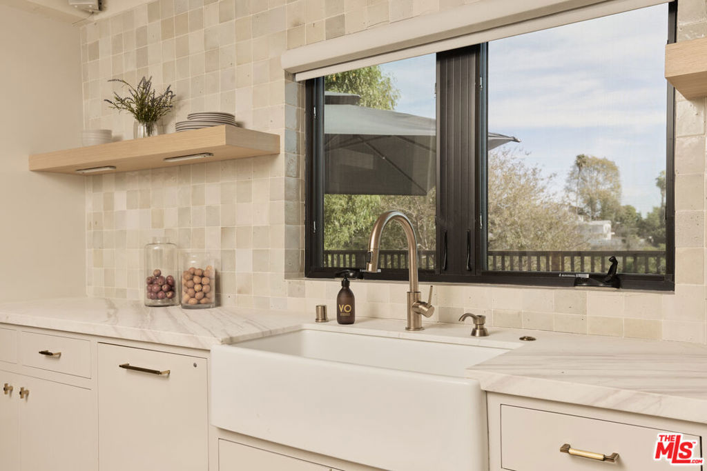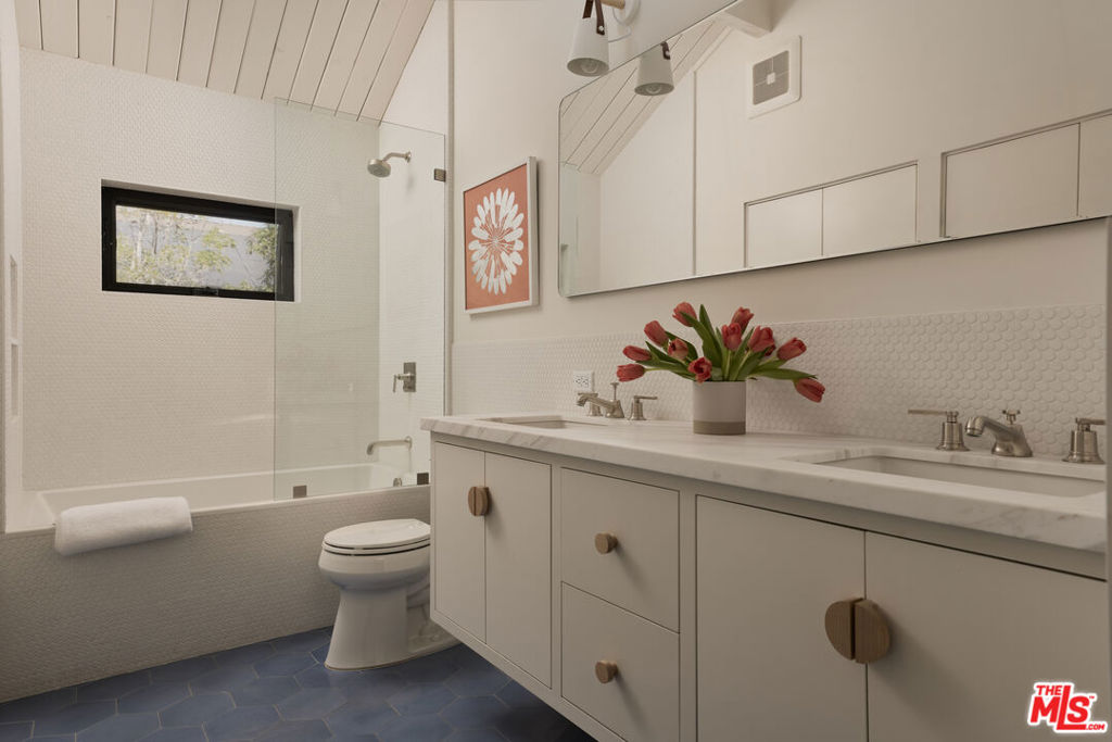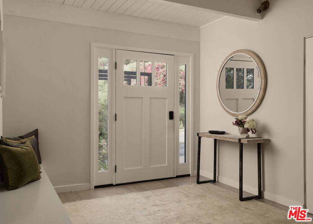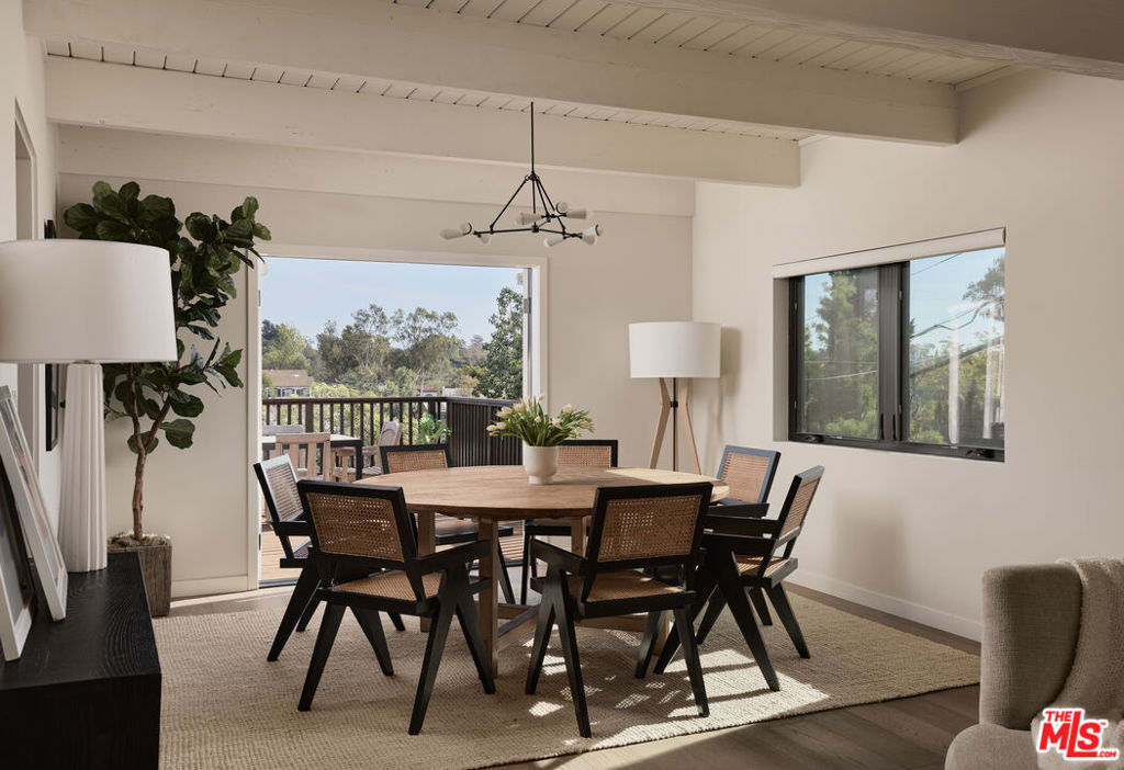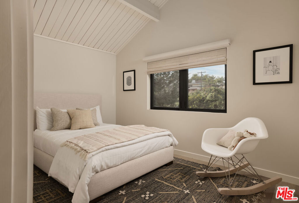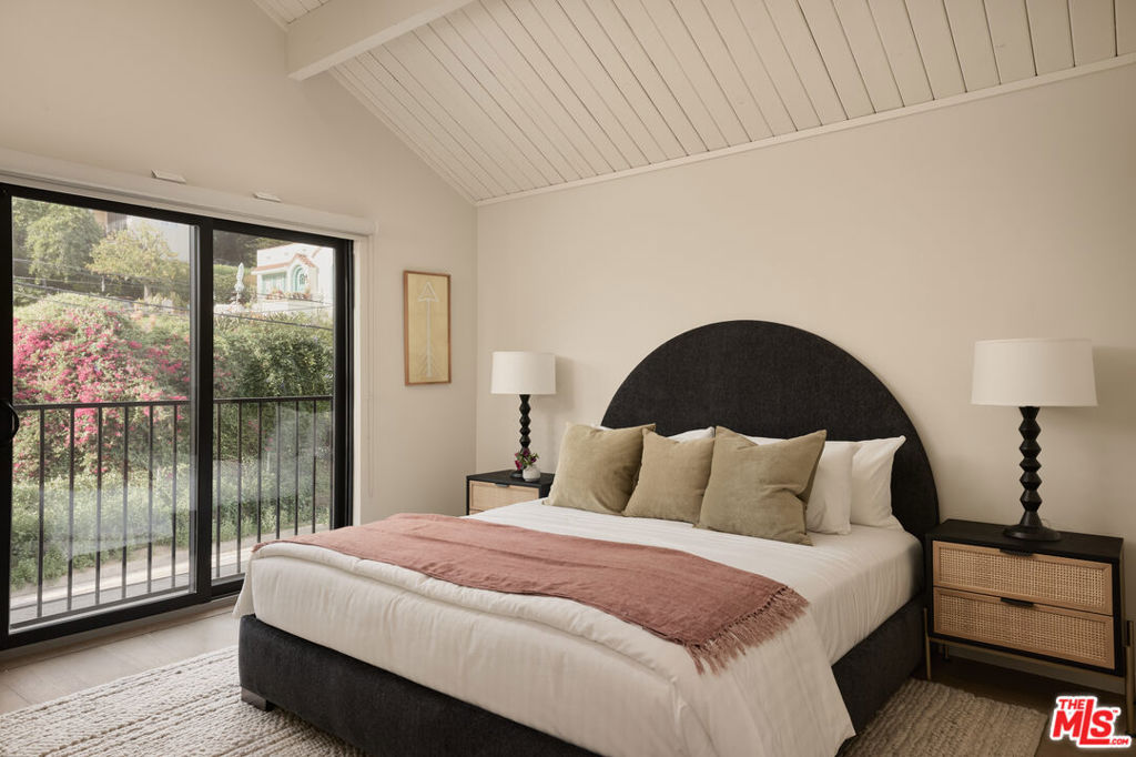Set on one of the coveted flat streets in the hills of Elysian Heights, this modern A-frame inspired residence offers striking architecture, thoughtful design, and an exceptional sense of space across a light-filled foot floor plan. Soaring ceilings, warm materials, and curated finishes create a seamless balance of rustic charm and modern convenience.Upon arrival, a welcoming entry and oversized mudroom establish a sense of flow and intention. The main living areas unfold into an expansive great room where vaulted tongue-and-groove ceilings, clerestory windows, and a gas fireplace set a warm yet dramatic backdrop. The kitchen is both streamlined and expressive, outfitted with integrated appliances, open shelving, custom lighting, abundant storage, and connects naturally to an intimate den perfect for casual evenings or quiet mornings. Natural light pours throughout the 4-bedroom, 3-bath home via multiple skylights. The main level also includes a bedroom, full bath, and laundry area. Public spaces extend outdoors to an expansive 1,800+ square-foot refinished deck overlooking treetops, rolling hillsides, Downtown Los Angeles views, and a resort-style saltwater pool, spa, and fire pit ideal for entertaining or unwinding in total privacy. Upstairs, the serene primary suite offers dual closets and a beautifully designed bathroom with a soaking tub, walk-in shower, and dual-sink vanity. Two additional bedrooms and a full bathroom complete the second level. A detached office/gym provides a quiet, private space for work or creative pursuits. Meticulously updated interiors showcase designer finishes, custom millwork, and thoughtful details throughout. Updated systems and solar panels complete the offering. Ideally situated in Echo Park, just steps from the outdoors and moments from neighborhood favorites, Sunset Boulevard, and Silver Lake, this home delivers inspired design, effortless indoor-outdoor living, and a true urban hillside escape.