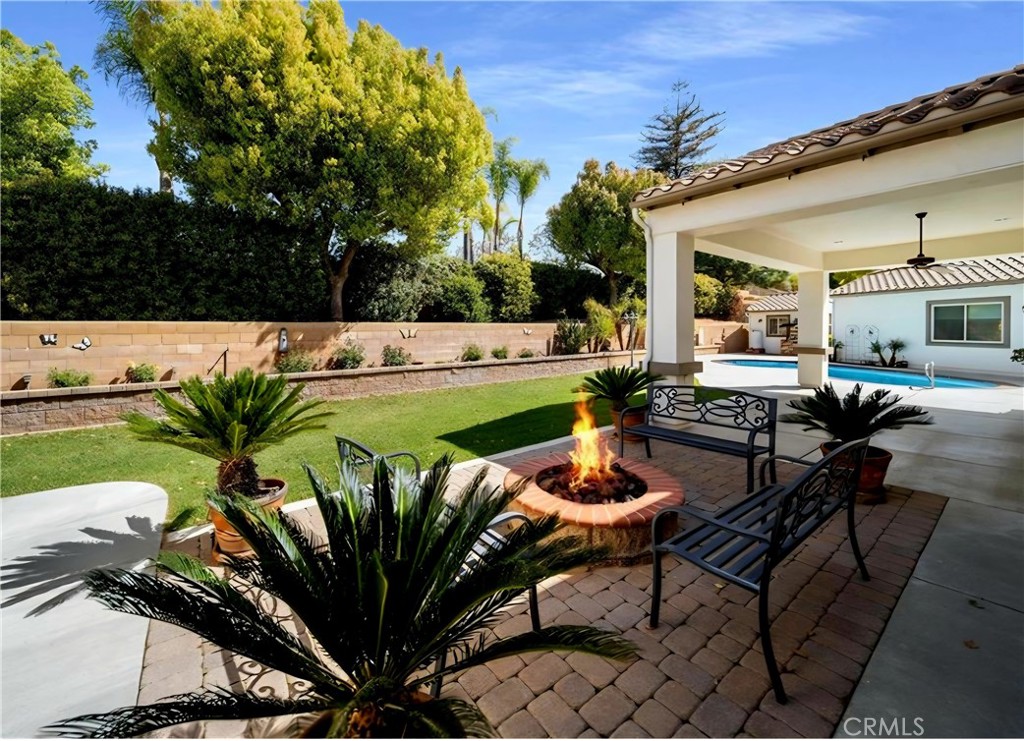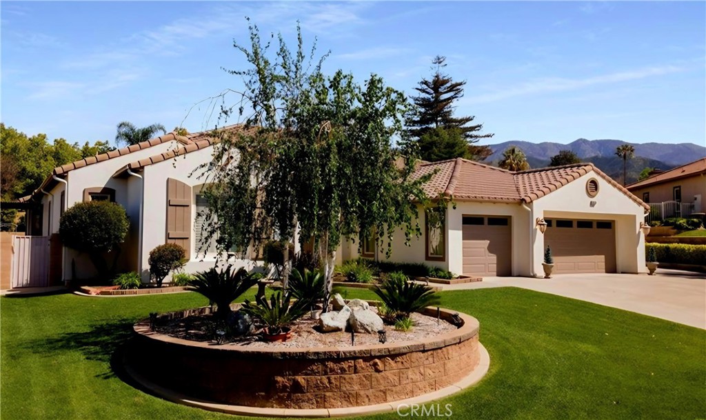 PICTURE THIS...A stunning home that perfectly blends luxury and convenience. As you approach, you're immediately drawn to the gorgeous view and meticulous attention to detail that sets the tone for the rest of the property. This 3-bed, 2.5 bath gem is located on a cul-de-sac with a semi-secluded setting, boasting a 3-car garage, extra-large driveway with RV parking, and an additional 30' deep, 2-car finished garage. The exterior is just as impressive, with a beautiful mission style finish, lighted pathways, and a bird repellent porch. Inside, you'll find a spacious dining room perfect for entertaining, a large kitchen with custom cabinetry, a large island, Jenn-Air oven and stove, and a stunning bay window with seating and storage. The adjacent family room features a gas fireplace and custom built media cabinet, the perfect spot to cozy up with loved ones. But it's the details that really make this home shine. Extra large bedrooms, a separated floor plan, and ample storage throughout mean you'll have plenty of space to spread out. And with crown molding, beautiful tile flooring, and custom cabinetry, you'll feel like you're living in a luxury retreat. The master bedroom is the ultimate oasis, complete with a fireplace, dual sinks, soaking tub, and his and hers closets. And with double doors leading to the backyard, you'll love spending time outside, whether that's sipping coffee on the covered patio or lounging by the in ground pool. This home has it all. Paid solar, powerstar vacuum system, a wishing well, mature trees, raised planters, and a custom built storage shed, to name a few. It's truly one-of-a-kind! Don't let this beauty get away!