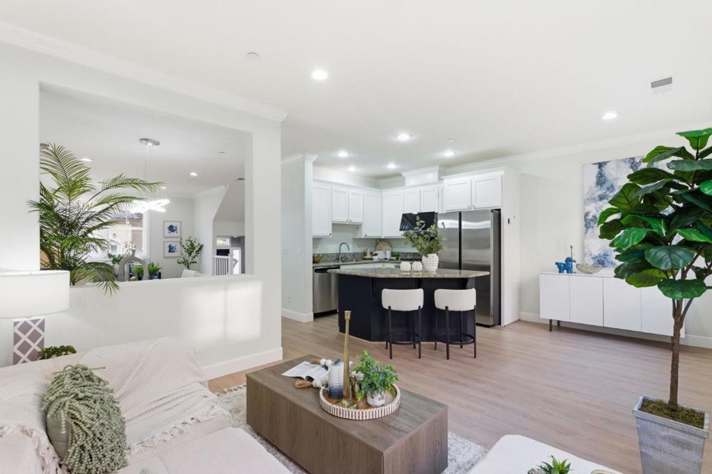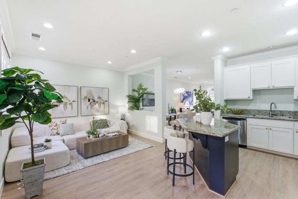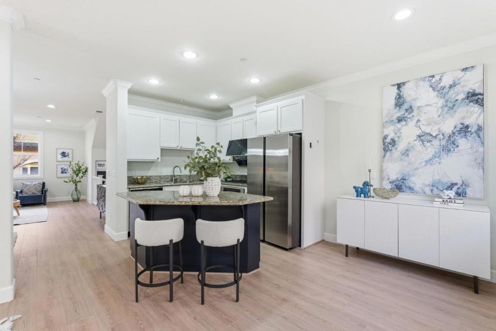 Beautifully upgraded and move-in ready, this stylish home offers a highly functional floor plan with 2 bedrooms plus an office/den, 2.5 bathrooms, and approximately 1,579 sq ft of thoughtfully designed living space. High ceilings and a bright, open layout create an inviting atmosphere throughout. The living room and primary bedroom face south, filling the home with abundant natural light. The gourmet kitchen is well appointed with stainless steel appliances, a central island, and ample cabinetryideal for both everyday living and entertaining. The primary suite is a private retreat featuring a walk-in closet, a spa-like bathroom with an oversized soaking tub and separate shower. The guest bedroom suite also includes a walk-in closet, providing excellent comfort and storage. A dedicated office/den is conveniently located on the ground level, perfect for remote work, guests, or flexible everyday use. Well-maintained HOA with a low monthly fee of just $338, including garbage service. Ideally located in a highly convenient Sunnyvale neighborhood, the home is within walking distance to Seven Seas Park and just minutes from major tech employers such as Google, Amazon, and NVIDIA. Enjoy easy access to Highways 237 and 101, along with nearby shopping, dining, and recreational amenities.