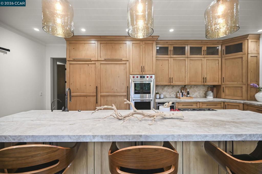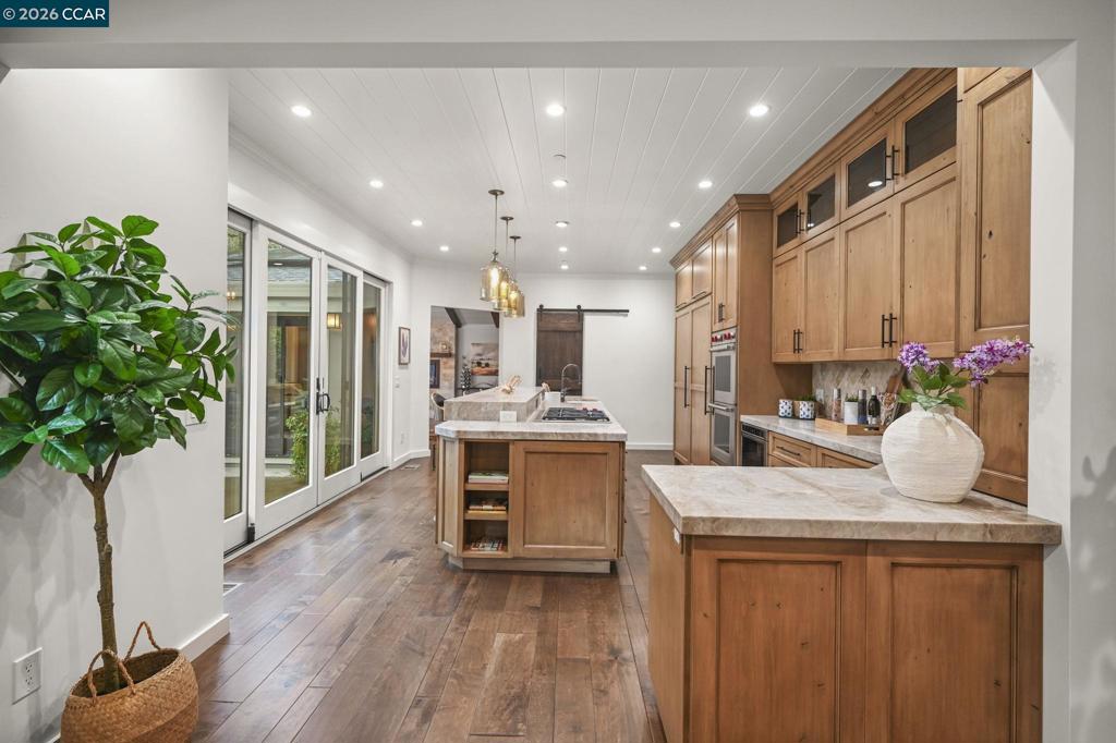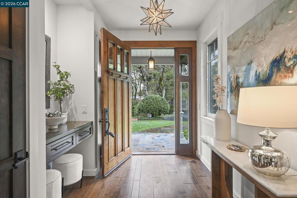 Set in the beloved Burton Valley–Trails neighborhood, this rare gem .86-acre retreat offers a peaceful escape just steps from the Lafayette-Moraga Trail and a stroll or bike ride to Lafayette’s highly acclaimed elementary, middle, and high schools. Fully remodeled in 2017, this turnkey, custom-built home blends comfort, function, and refined design. The heart of the home is a chef’s kitchen with Wolf appliances, quartzite counters, and generous workspace, opening seamlessly to the main living areas. A spacious formal dining room with fireplace and bar is ideal for entertaining, while high ceilings, custom built-ins, designer-chosen paint colors, and engineered wood and tile floors throughout create a timeless, elevated feel. The primary suite features a walk-in closet, custom cabinetry, spacious shower, & direct access to a private sparkling hot tub. 3rd bedroom currently serves as an executive office with Murphy bed, built-in desk, and extensive cabinetry. Outdoors, enjoy a private sanctuary with views of mature oak trees and soaring redwoods, pebble-bottom pool. Add'l amenities: owned solar, whole-home generator, Enjoy detached gym with mirrored wall and separate HVAC. Guests in charming cottage drift off to the soothing sound of the creek—all at the end of private court.