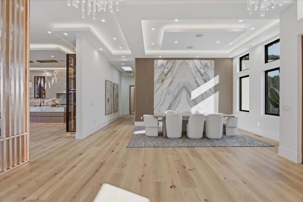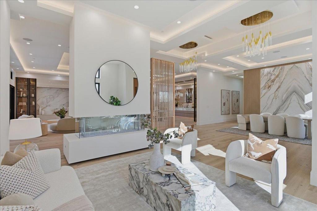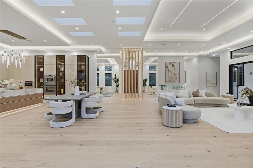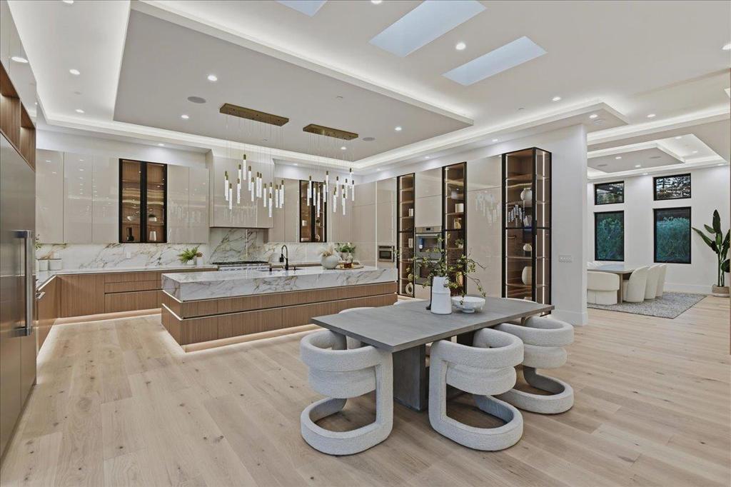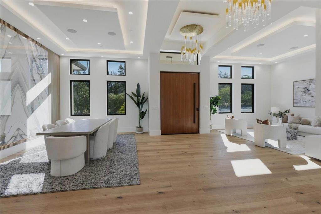 Experience this rare 2026 Brand-New Construction, contemporary-modern masterpiece nestled on a tranquil, no-through private Saratoga road on over a flat half of an acre-offering a refined lifestyle w/unrivaled design. An impressive pivot door opens to a grand foyer w/cascading chandeliers, soaring 12-to-14-foot ceilings & a seamless single-level floorplan finished w/European Oak flooring. The culinary kitchen dazzles w/custom European cabinetry, a Porcelanosa island & Thermador appliances. A DaVinci floating-island fireplace anchors the great room, where formal living & dining spaces are framed by designer accent walls. The layout features 5 ensuite bedrooms, w/floor-to-ceiling porcelain slabs, including a tranquil primary wing & an attached ADU integrated into the layout. The 850+ SF California Room w/full kitchen merges to the interior via glass bifold doors for lavish indoor-outdoor entertaining. The grounds feature low maintenance Belgard pavers*lush grass*stones & a serene fountain. High-tech sustainability includes dual EV chargers*owned solar w/battery backups*audio zones*security cameras & whole house water filtration system-A Silicon Valley sanctuary near the Saratoga Library, Farmers Market, High-Tech Hubs, Saratoga Village w/Michelin dining & top-rated Saratoga schools