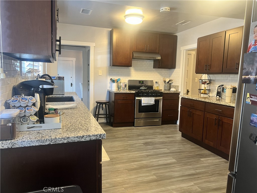 Excellent opportunity to own a single-family residence with a rear duplex in a desirable Sierra Madre location near Old Town. The front unit is a detached single-family home featuring 3 bedrooms and 1 bathroom, completely gutted and remodeled approximately 5 years ago. It offers a living room with a wood-burning fireplace, a formal dining room, and an updated kitchen with granite countertops, soft-close cabinets, and newer appliances. Additional features include LVP flooring throughout, dual-pane windows, recessed lighting, a dedicated laundry room, a basement providing extra storage or flexible use space, and its own private backyard. A new composition roof was also installed on the front house around 5 years ago. The rear duplex includes two units and two one-car attached garage: one garage space is allocated for the single-family home, and the other is dedicated to the one-bedroom, one bath unit. Both units also enjoy a side yard and a backyard. Upstairs: A one-bedroom, one-bath unit with a warm, inviting kitchen featuring wood-paneled walls, open shelving, and ample cabinetry. The kitchen includes a vintage-style range, generous counter space, and a breakfast bar that opens to the living area, creating a comfortable and functional layout. Downstairs: A studio unit with a kitchen, eating area, walk-in closet, and ¾ bathroom. This versatile property offers flexibility for owner-occupants or investors seeking a well-located income opportunity in Sierra Madre.