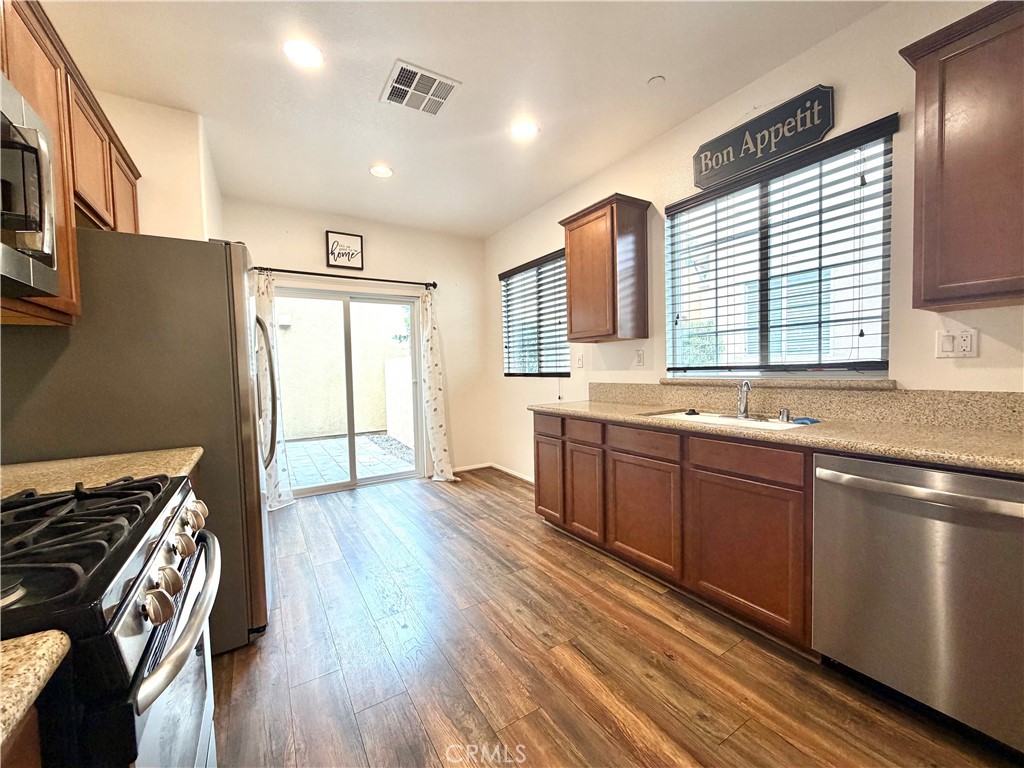 Welcome to Paseos at Crown Valley, where comfort and convenience come together in this beautifully designed home featuring 2 bedrooms and 2.5 bathrooms with dual front and rear entrances, including direct access from the 2-car garage. As you approach, you’re greeted by low-maintenance landscaping that sets the tone for easy living. Enter to a bright and spacious living room, with a conveniently located powder room and storage closet nearby. Straight ahead, the kitchen serves as the heart of the home, showcasing wood cabinetry, sleek countertops, and stainless-steel appliances, including a refrigerator and dishwasher—perfect for everyday living and entertaining. Upstairs, you’ll find a comfortable secondary bedroom and full bathroom featuring carpeted flooring and a shower/tub combo. The laundry room is thoughtfully placed upstairs for added convenience. The primary suite offers a peaceful retreat, complete with a generously sized walk-in closet and an en-suite bathroom featuring modern flooring, dual sinks, and a shower/tub combo. Enjoy indoor-outdoor living with a private backyard just off the kitchen, offering direct access to the garage, with additional garage access located at the base of the staircase. Residents of Paseos at Crown Valley enjoy access to community amenities including a playground and a resort-style pool with spa. Ideally located near shopping, schools, dining, entertainment, and major freeways, this home places everything you need within reach. Don’t miss this opportunity—schedule your private showing today before it’s gone!