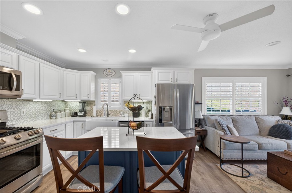 Beautifully updated view home in Brea featuring stunning sunrise views of Saddleback Mountain from yard, with sunset views of Catalina Island from the neighborhood hill. Interior upgrades include new LVP flooring throughout, fresh interior paint, an updated kitchen with stainless steel appliances, quartz counters, and a remodeled gas fireplace in the living room. Fantastic layout for hosting or just a larger family. Including 3 bedrooms, dining room, one large living room with fireplace and family room. The primary suite offers a private bathroom with upgrades and a beautiful tile walk in shower, complemented by an updated guest bathroom. New steel patio French doors enhance indoor-outdoor living. The insulated garage door opens to a fully finished garage with drywall, pull-down attic access, and space for two cars plus a gym or office setup. Additional improvements include a new main water shut-off valve, water pressure regulator, and new backyard shut-off valve. Move-in ready with exceptional views and thoughtful upgrades throughout.