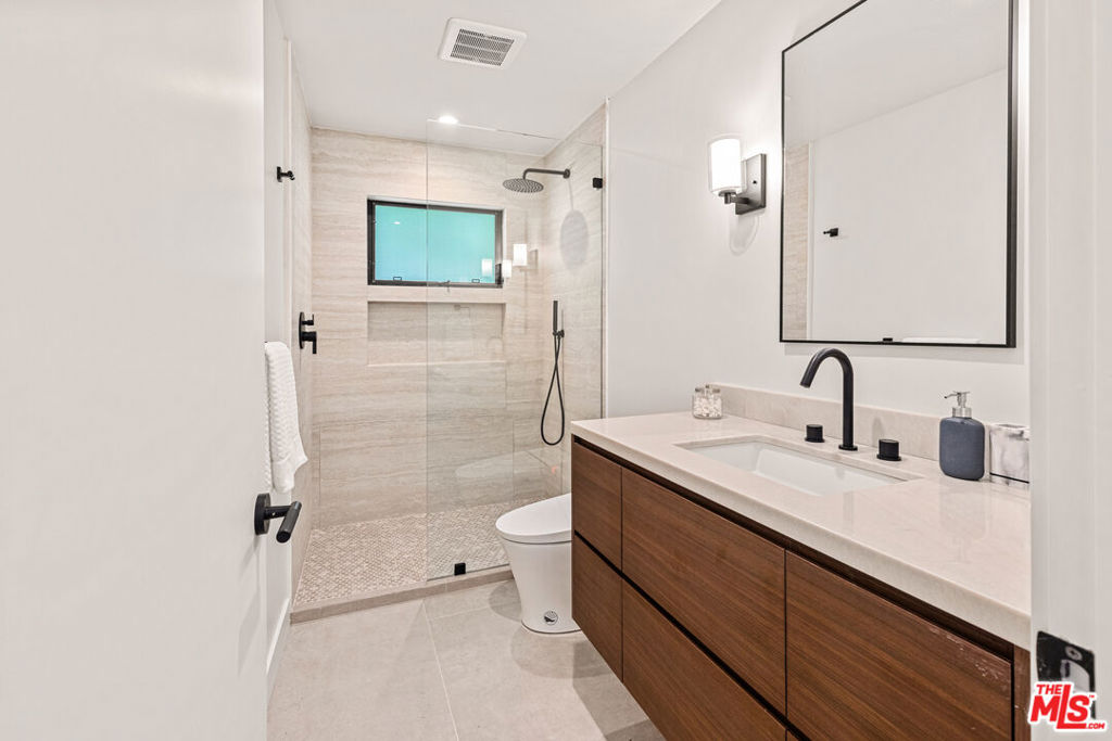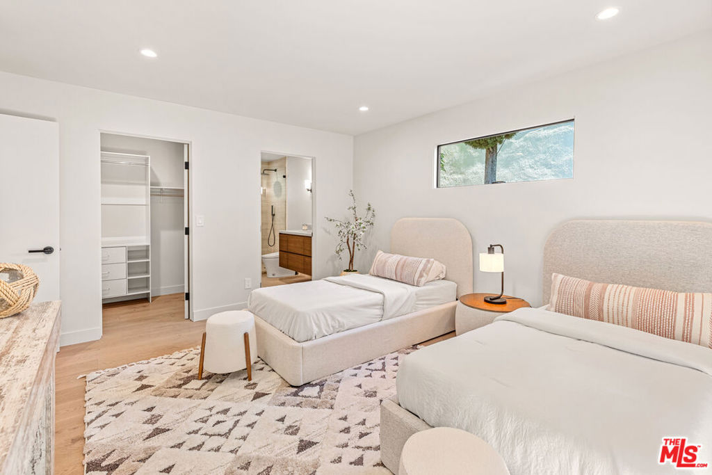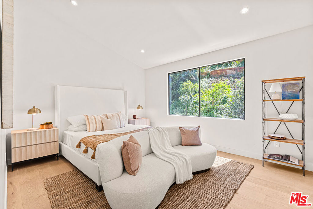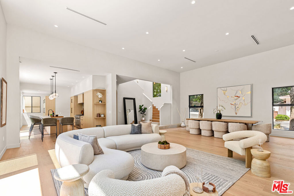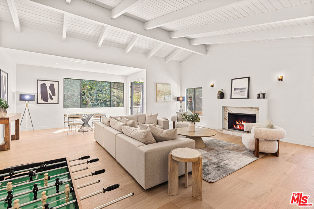 Tucked away on a peaceful street in one of Brentwood's most coveted enclaves, this strikingly updated 4-bedroom, 6-bath modern residence offers refined design, impressive scale, and effortless livability. A dramatic 10-foot entry door opens to a voluminous interior highlighted by soaring 14-foot ceilings and an expansive, open layout ideal for both everyday living and entertaining. The heart of the home features a chef-caliber kitchen equipped with top-tier appliances, an oversized dining area, and multiple living spaces designed for seamless flow. These areas connect effortlessly to a private backyard retreat, complete with a newly constructed pool and spa, along with dedicated spaces for outdoor dining and relaxation.The primary suite serves as a true sanctuary, boasting a spa-inspired bathroom with dual vanities, a freestanding soaking tub, and a custom walk-in closet. Additional amenities include two thoughtfully placed powder rooms, a newly added theater, and a spacious entertainment lounge with a fireplace perfect for hosting gatherings or enjoying quiet evenings at home. Notable upgrades include a fire-resistant standing-seam metal roof, fully updated electrical and plumbing systems, and a generous three-car garage with ample storage. A rare opportunity to own a turnkey modern home in a premier Brentwood location.