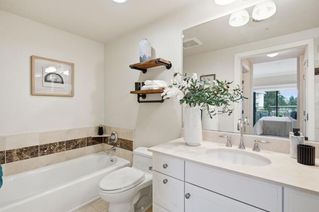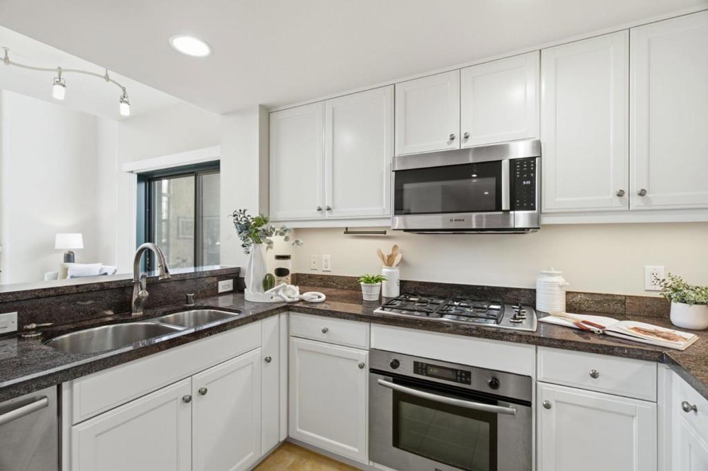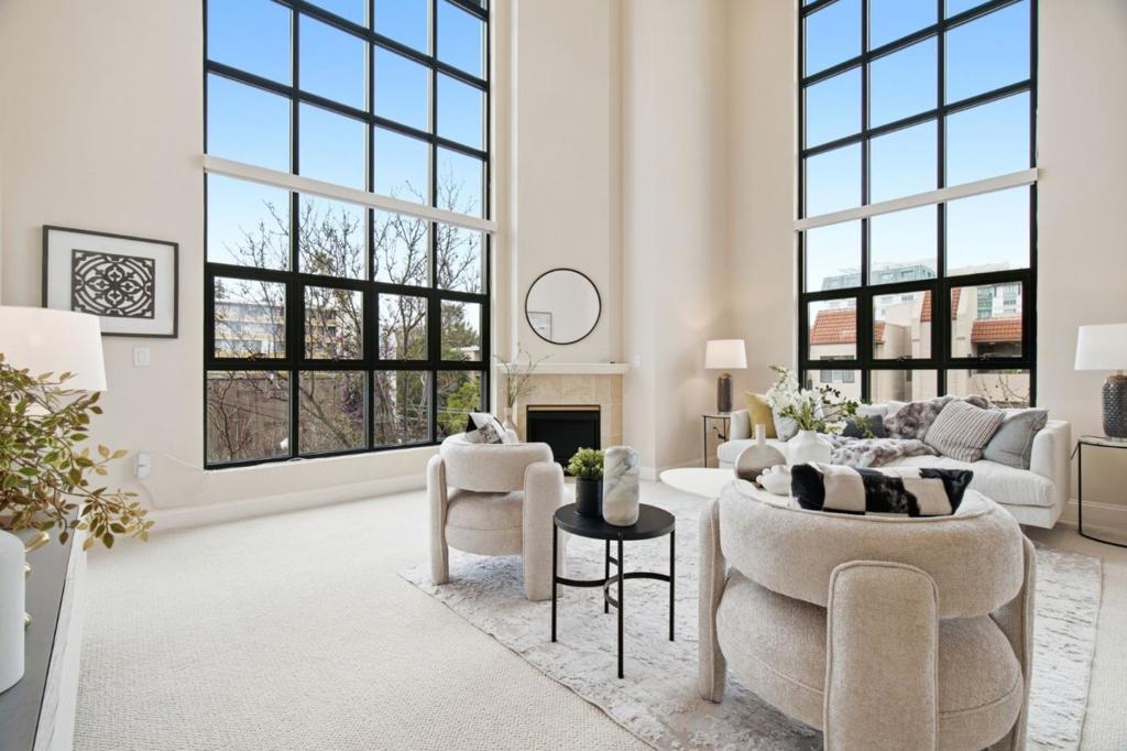 Set above the city in a premier top-floor corner setting, this exceptional townhouse-style condominium offers a rare combination of space, light, and privacy in the heart of downtown San Mateo. Soaring 19-foot ceilings and expansive floor-to-ceiling windows flood the living area with natural light and capture sweeping open views. Second-level loft provides the flexibility of a family room, home office, or potential third bedroom. Refined finishes include limestone and marble surfaces throughout, complemented by a well-appointed chefs kitchen with granite countertops and stainless steel appliances. The primary suite is a private retreat, with scenic views, a walk-in closet, and an elegant spa-like bathroom with marble-tiled shower, and separate soaking tub. Additional highlights include a gas fireplace, a dedicated in-unit laundry room with washer/dryer, central AC and heating, and three private balconies with views of the Bay and surrounding hills. Secure underground garage with 2 deeded parking spaces. Enjoy access to a modern fitness center and beautifully landscaped courtyards with fountains and cascading waterfalls. Ideally located just moments from Central Park, downtown shopping, dining, and Caltrain. This move-in-ready home offers both convenience and elevated living.