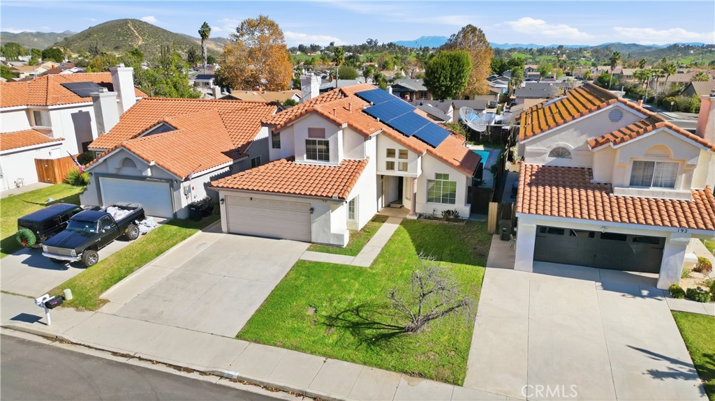Welcome to this charming spacious 4-Bedrooms, 3 Full bath with Olympic Size POOL & PAID-OFF SOLAR Home nestled in the highly sought-after City of Lake Elsinore, known for its Top-Rated Schools and Safe, Family-Friendly neighborhoods, making it perfect for families of all sizes. All New Central HVAC System, Energy saver variable speed Pool Pump, Electric Water Heater, Fresh Interior & Exterior Paint, Mix of Carpet, Tile & Laminate floor throughout. This home also has A whole house fan, Ceiling fans in rooms- an added Bonus on top of the Central Cooling & Heating System! Attached double car garage has 240v Fast Charging option, EV Plug-in-Ready Outlet to charge all current Electric Vehicles on the market. Excellent choice for Current & Future Electric Vehicle Owners. Strategically designed 1 bedroom & 1 full bathroom with double doors on the first floor, perfect for guests or a home office. The ample sized primary suite provides views of the lush backyard- Private Pool & Mountain view! The open floor plan boasts vaulted ceilings throughout the living and dining area. The spacious family room, complete with fireplace, flows seamlessly into a generously sized area, ideal for family gatherings. Walk through the sliding glass door from the family room, you are greeted by a very large sized covered patio structure with ceiling fan, a sparkling pool, BBQ area with sink to entertain large crowd on the weekends and to enjoy pool party on summer days with outdoor misting system to cool the entire patio area. Enjoy breathtaking view of the Mountain from the Front and Back of the home. Some Fruit Trees are in the backyard and front yard of the Home. Low Property Tax, NO MELLO ROOS & NO HOA! 28 Panels SOLAR that is PAID OFF! NO LEASE to Deal with!! A wonderful opportunity for first-time buyers. Don’t miss the opportunity to make this charming residence your forever home!