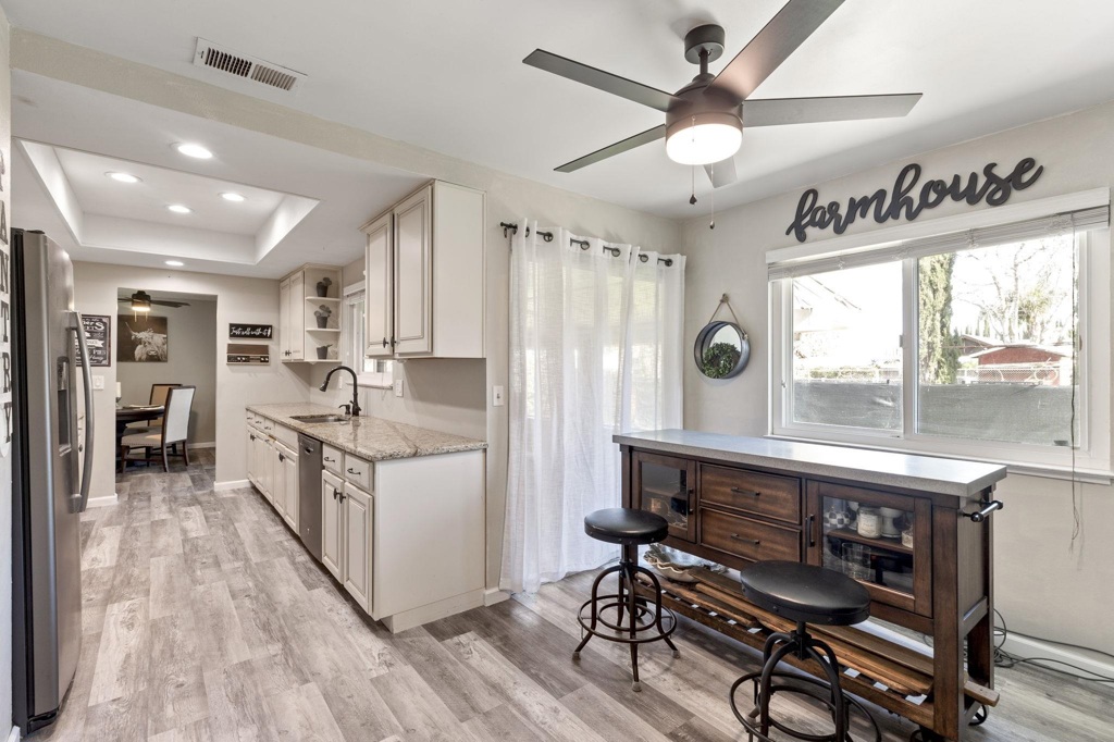 This charming single-story ranchette sits on a fully fenced 0.85-acre corner lot, offering privacy, versatility, and plenty of space to roam. Enjoy the freedom of country-style living with space for horses, RVs, and outdoor enjoyment. This 3-bedroom, 2-bath home features approximately 1,968 sq. ft. of living space. The home offers a formal dining room, updated eat-in kitchen, walk-in pantry, and indoor laundry. The spacious family room features a wood-burning fireplace creating a warm and inviting gathering space. One bedroom includes a separate entrance to the backyard, ideal for guests, extended family, or flexible living arrangements. Plantation shutters and dual-pane windows are featured throughout most of the home. Additional features include a spacious basement (approx. 800 sq. ft.), complete with a pool table included, and an enclosed porch/sunroom (approx. 240 sq. ft.), providing extra usable space beyond the main living area. A standout feature is the 25x40 workshop with power, sewer, and a half bath, perfect for hobbies, storage, or a home-based business. The property also includes an automatic rear gate, private well, and septic system, making it ideal for rural living with modern conveniences.
