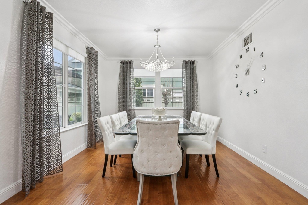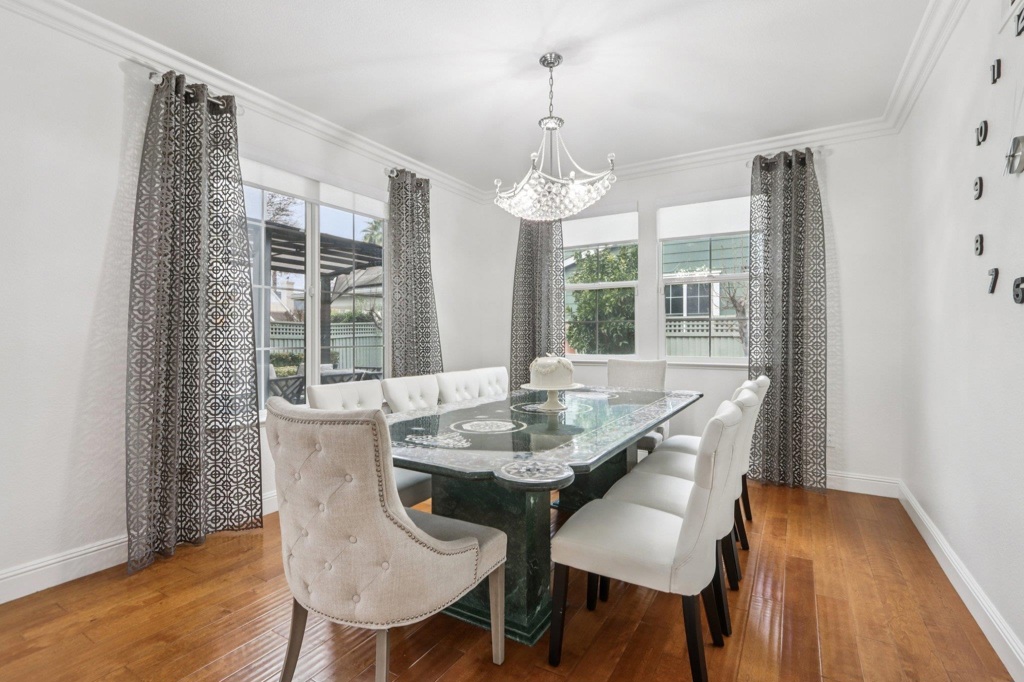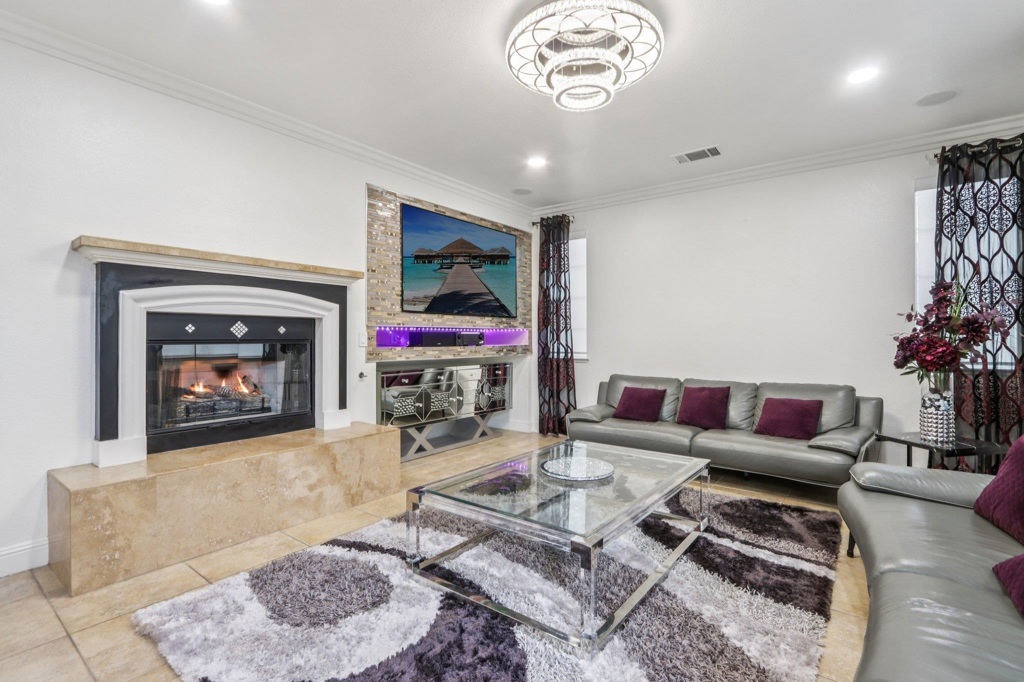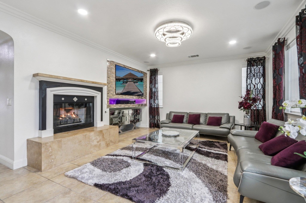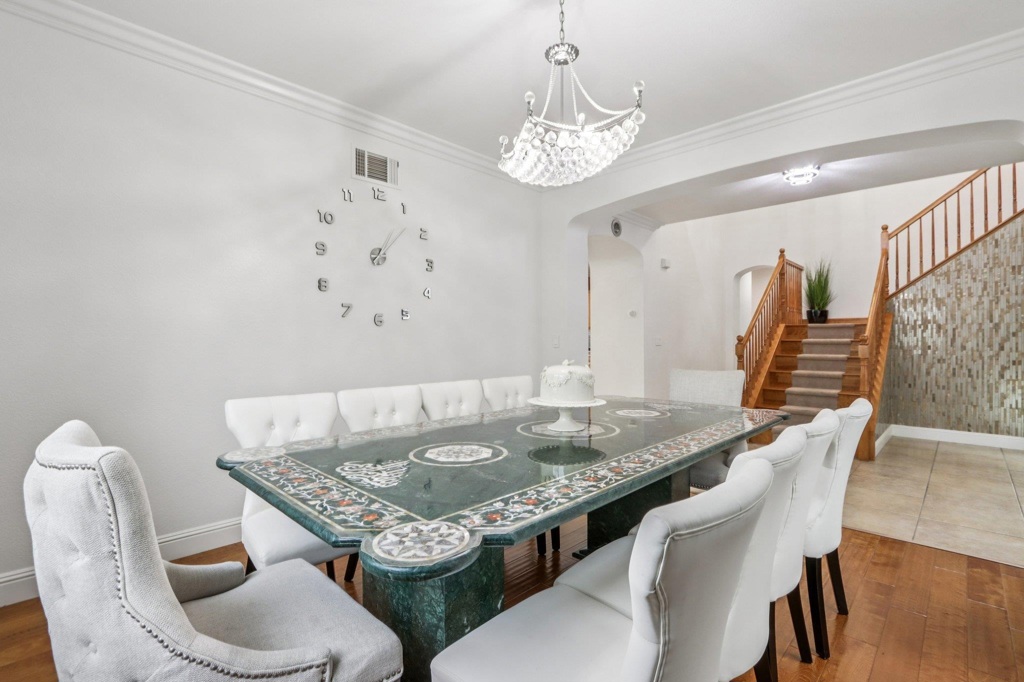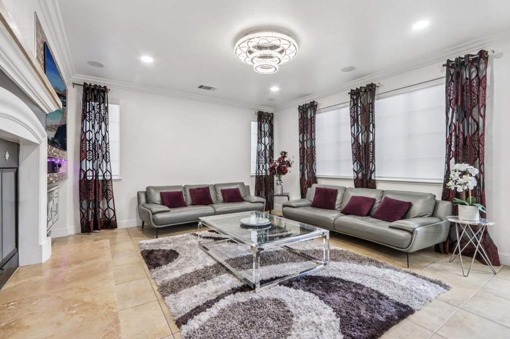 Beautifully upgraded custom home in a 24 hour gated community. Features include rich hardwood and tile flooring, crown molding, custom shutters, and an epoxy finished garage. All four bathrooms showcase premium tilework and designer fixtures. The layout offers formal dining, elegant living spaces, and a first floor BEDROOM with full bath. Additional highlights include a backyard workout area, state of the art water softener and filtration system, fully paid 22 panel SOLAR, crystal chandeliers, scratch resistant interior walls, and custom stonework in the front and rear yards. Comprehensive alarm and camera system included.Gym work out in back yard area