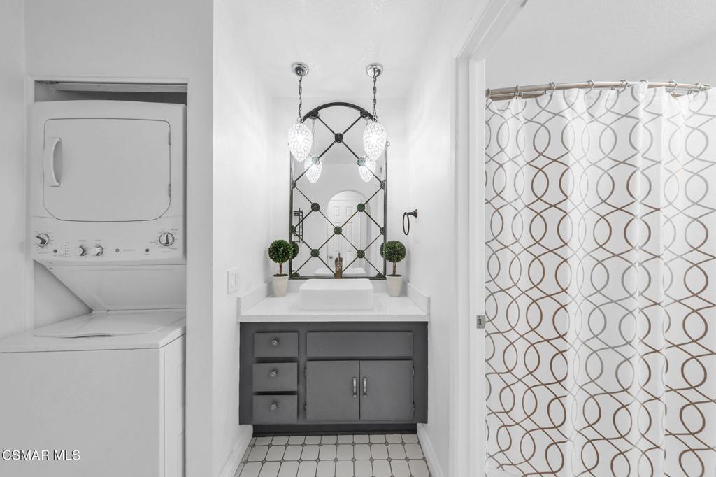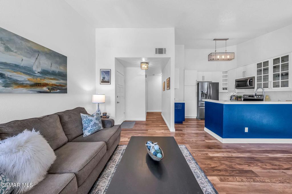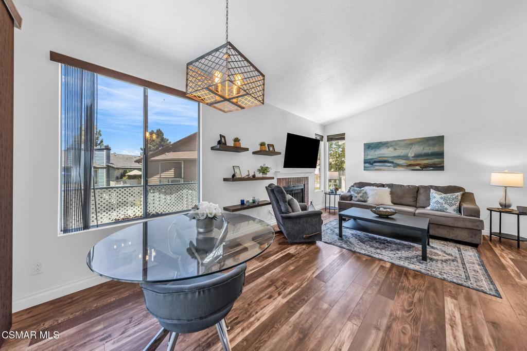 Great location! Gorgeously appointed 2 bedroom, 1 and 1/4 bath Camelot condo, centrally located in Thousand Oaks, blocks away from Gardens of the World, the Thousand Oaks Civic Arts Center, Mastro's Steakhouse and The Lakes Shopping Center. Camelot is also now eligible for conventional loans.This unit is situated on the second level facing a quiet interior courtyard, surrounded by well-maintained grounds and trees, and conveniently close to the park, pool and spa. As you enter, you'll immediately feel the warmth of this home and are greeted by vaulted ceilings, beautiful flooring and sparkling fixtures. The updated kitchen offers plenty of counter space and storage, plus a bar that seats 4. Rich wood-like flooring is throughout and provides an open flow to the bedrooms. The primary offers a custom arched walk-in closet . A slider door from the primary opens to the large wrap-around patio that can also be accessed from the living room. The shared bathroom offers separate vanities, on opposite ends of the bathroom. This unit also offers privacy, peek-a-boo mountain views and a newer HVAC system (2023). Camelot Condos is an owner-occupied complex, is now fully insured and eligible for conventional loans. HOA includes water, trash, and one covered assigned parking spot (space 161).