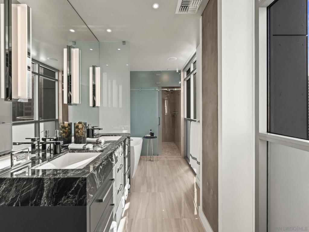Imagine waking up in the heart of vibrant downtown, where every day is a new story waiting to unfold. This luxury residence at the Cortez Blu, an exclusive boutique building, isn't just a condo; it's a launchpad for an unparalleled urban lifestyle, perfectly situated just steps from Symphony Plaza, Balboa Park, Little Italy, and the Gaslamp. Step inside your eighth-floor sanctuary, a space totally redefined in 2024 to blend modern luxury with architectural distinction. The design choices are intentional and inspiring, featuring striking exposed concrete walls adding texture and an industrial-chic edge to high-quality finishes. You'll find bespoke elements everywhere, from custom cabinetry with granite tops and high-end appliances to sophisticated designer lighting and hidden tech shades. The commitment to unique architecture extends to the bathrooms, which feature fixtures by legendary Frank Lloyd Wright. The primary suite is a true retreat, offering picturesque city views through floor-to-ceiling windows and access to a private balcony. The en-suite bathroom indulges with a dual custom vanity, soaking tub, wet room, and walk-in closet. But the real showstopper is the over 750 sq. ft. private view terrace—a rare, almost impossible-to-duplicate outdoor space that seamlessly transforms your living experience. It's your personal stage for entertaining guests or simply soaking in continual, breathtaking city vistas. This turnkey property, complete with secure parking and storage, offers a lifestyle that is both sophisticated and thrilling in the pulsating center of the city. One must experience this residence to understand the feel and tranquility it brings. Enjoy the privacy of only 2 neighbors on your floor with only a small, shared wall. Perched atop the serene Cortez Hill, Cortez Blu offers the idyllic location in Downtown San Diego, coupling urban convenience with neighborhood charm. This location affords quick access to freeways, putting the entire city in easy reach, but near all the verve and excitement of the cultural and brimming nightlife, sporting events, and social happenings of the downtown area.