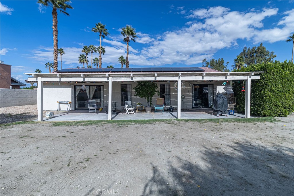 Indulge in elevated desert living in this impeccably designed 3-bedroom, 2-bath residence, ideally situated in the coveted Rio Vista neighborhood of Cathedral City. The open-concept layout seamlessly connects the living, dining, and kitchen areas, making it ideal for both entertaining and everyday living. A light-filled step-down living room creates an inviting focal point with ample space for relaxing or hosting guests. The kitchen features stainless-steel appliances, a spacious island, and an open flow to the main living areas. The primary suite offers a private retreat with sliding doors to the oversized backyard, an in-suite bath, and a walk-in closet. Two additional bedrooms provide flexibility for guests, family, or a home office. Enjoy an expansive backyard with endless potential—perfect for a pool, fire pit, RV parking, or custom outdoor retreat. Fully paid solar panels add efficiency and value. This home blends comfort, style, and opportunity—welcome home.