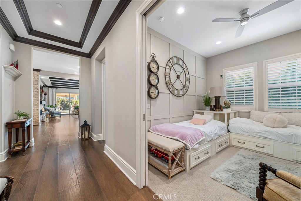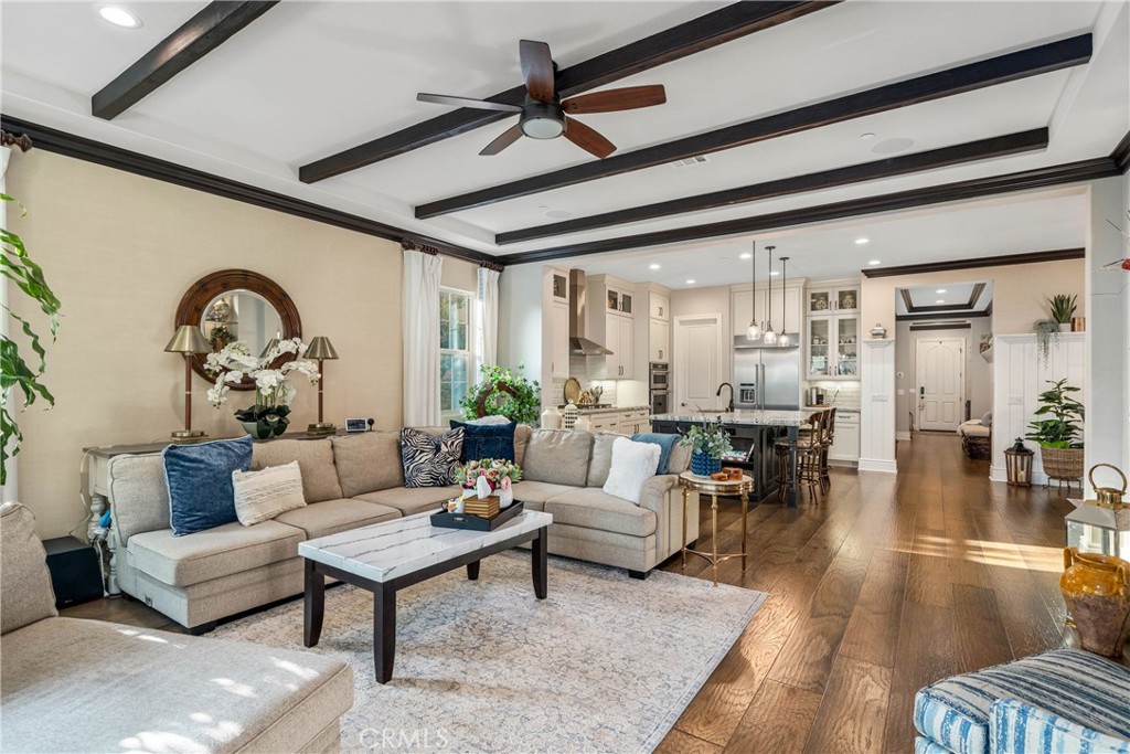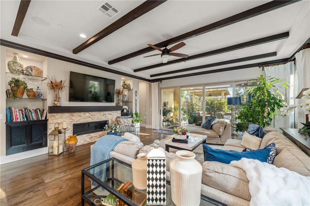 Welcome to luxury living in the prestigious 55+ gated community of La Floresta. This stunning single story residence showcases impeccable craftsmanship where no expense was spared. Soaring ceilings and an open floor plan create a light-filled, expansive feel, complemented by gorgeous wood flooring throughout. The highly upgraded kitchen is a showstopper, featuring leathered granite countertops, a massive island, premium finishes, and an oversized walk-in pantry...perfect for both everyday living and entertaining. The home offers three bedrooms, one is currently being used as a den with sliding pocket doors. It features a thoughtfully designed layout that provides privacy and comfort. A secondary bedroom and full bathroom are located at the front of the home, along with an additional half bath for guests. The spacious primary suite is a true retreat, with wood beams, and tall ceilings, boasting a beautiful en suite bathroom and a generous walk-in closet. The family room is accented by striking wood beams and an impressive wall of sliding glass doors that span nearly the entire length of the space, opening almost completely to seamlessly blend indoor and outdoor living. Situated on a large lot, the backyard is an entertainer’s dream with a covered patio extension, pergola, lush grass area, mature fruit trees, and a private spa, ideal for relaxing or hosting gatherings. Every detail, finish, and design choice has been carefully curated, offering refined elegance in a serene, resort-style setting. This exceptional home perfectly captures the best of La Floresta living.