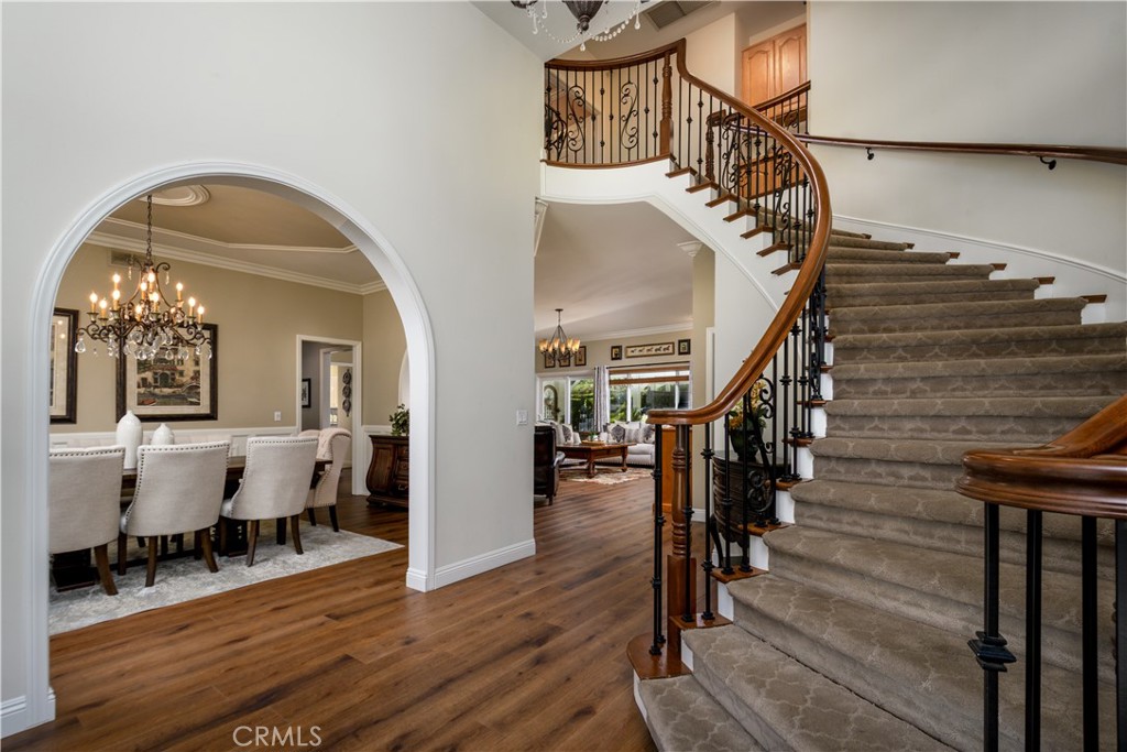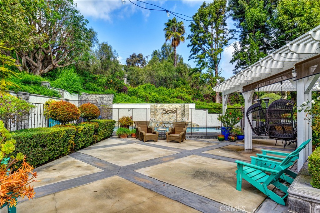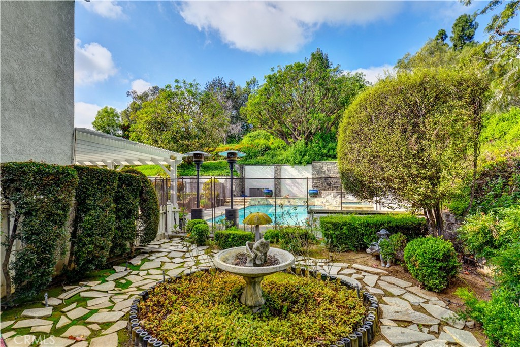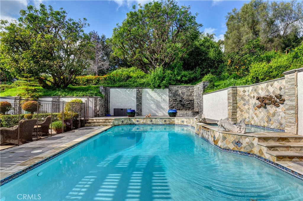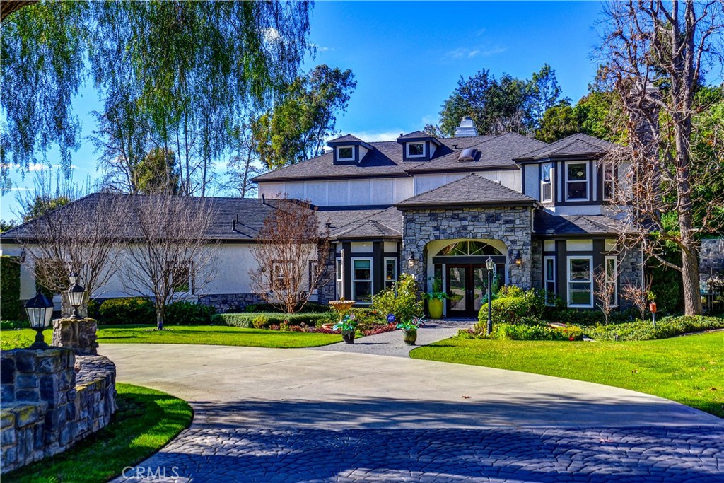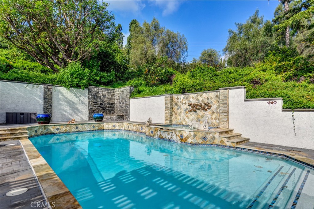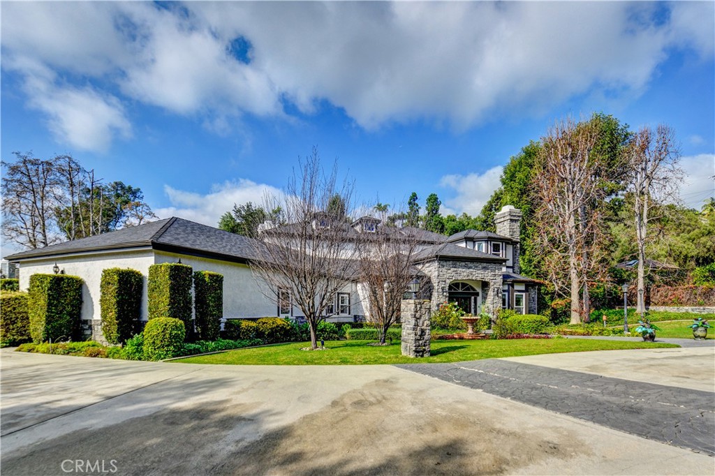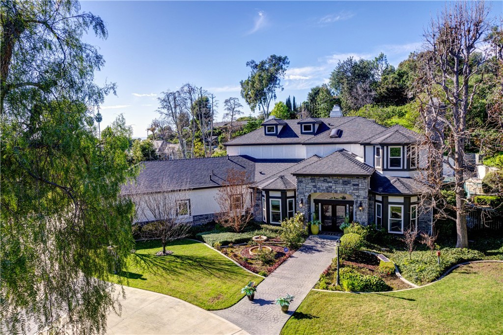 Set at the end of a private street in the scenic hills of La Habra Heights, this custom-built 1988 estate rests on a one-acre plus lot. A circular driveway, stone-accented exterior, and mature landscaping create a striking and private first impression. Spanning 3,848 square feet, this two-story residence offers four bedrooms and four bathrooms with a flexible, well-designed floor plan. A grand entry with soaring ceilings opens to a spacious great room ideal for gatherings, while a step-down formal living room adds architectural depth and separation of space. The chef’s kitchen is appointed with double Thermador ovens, Subzero built-in refrigerator, ample cabinetry, and generous prep space for entertaining. A main-level bedroom with en-suite bath provides ideal privacy for guests or multigenerational living. The primary suite is a true retreat, featuring an oversized bedroom with sitting area and fireplace, a spacious walk-in closet, and a grand en-suite bathroom with a large walk-in shower, separate toilet room, dual vanities, and a standalone soaking tub. Two additional upstairs bedrooms share a Jack-and-Jill full bathroom, and all bedrooms are generously sized and well positioned throughout the home. The backyard is a true retreat, featuring a gated saltwater pool and spa, lush lawn areas, mature trees, fountains & beautifully landscaped grounds with extensive hardscaping. A separate built-in covered BBQ area creates the perfect setting for outdoor dining and entertaining. The expansive lot also offers RV parking and excellent ADU potential. Additional highlights include a three-car garage, private drive, and a one-owner history reflecting pride of ownership throughout. This exceptional property combines privacy, space, and timeless design in one of La Habra Heights’ most desirable hillside settings.