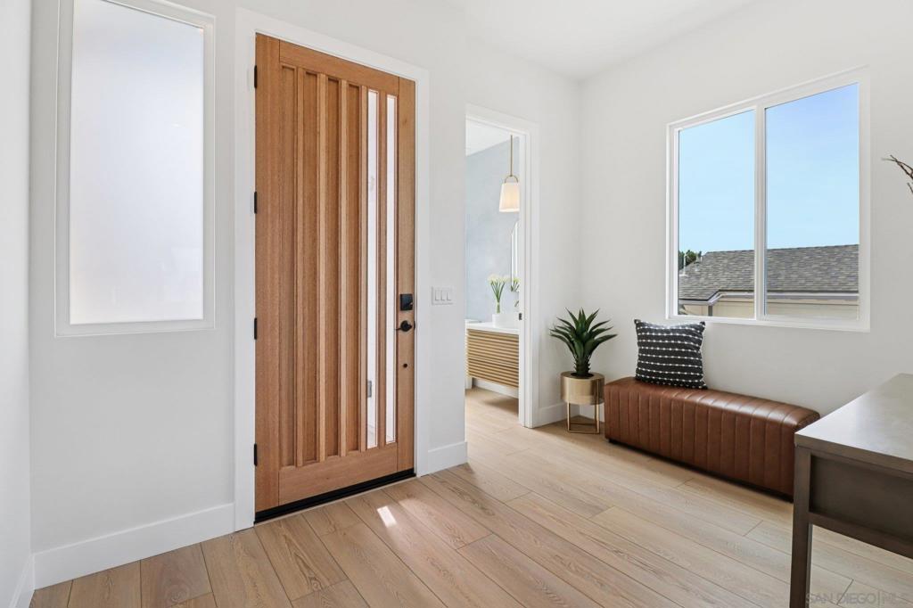 NEW CONSTRUCTION!! Beautiful Bay Park "Beach Chic" Home featuring panoramic views & warm, contemporary styling! Welcome to this stunning 3,008 sq. ft. residence that blends luxury, comfort, and spectacular views. Perched in a premier location, the expansive rooftop deck showcases sweeping vistas stretching from USD, Point Loma, the Bay and Ocean, all the way to Mount Soledad—an entertainer’s dream setting. The primary suite is a true retreat, featuring a spacious walk-in closet, sunset-centric patio, spa-like soaking tub, and an oversized shower. Upstairs, you’ll also find three additional bedrooms, including another with its own en-suite bath, plus a generous laundry room for convenience. At the heart of the home, the chef’s kitchen shines with an 48" Z-line cooktop and double oven with elegant gold accents. Built in double wide refrigerator, a walk-in pantry, crisp white cabinetry, wine fridge, and huge island with beautiful quartz counters—designed for both style and function. Accordion doors off the living and dining areas seamlessly blend the indoor and outdoor covered patio and private backyard. Thoughtful details throughout include soft close cabinets, wine fridge, epoxy garage floors, OWNED SOLAR, 10' high ceilings, and a spacious, open floor plan. This residence offers a rare combination of indoor-outdoor living, upscale amenities, and panoramic San Diego views—making it the perfect place to call home.