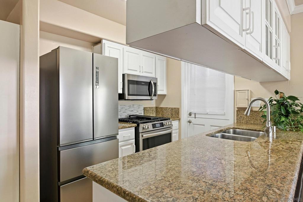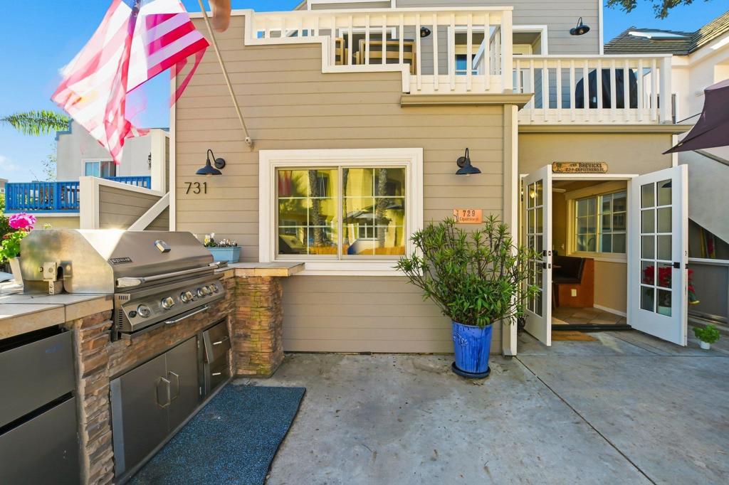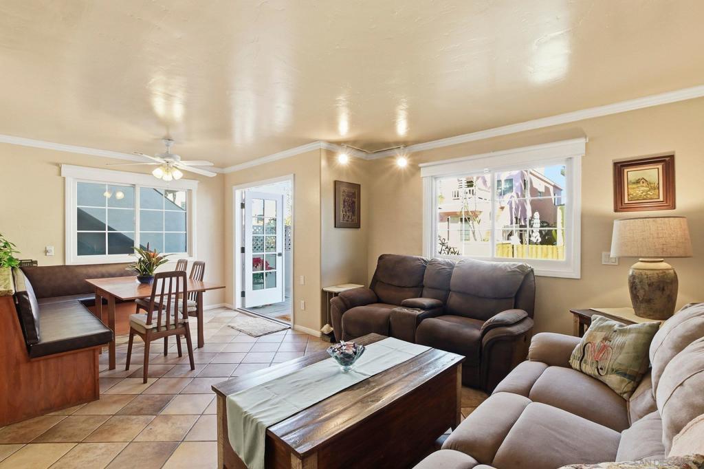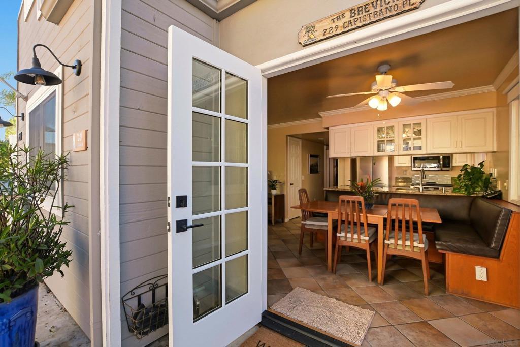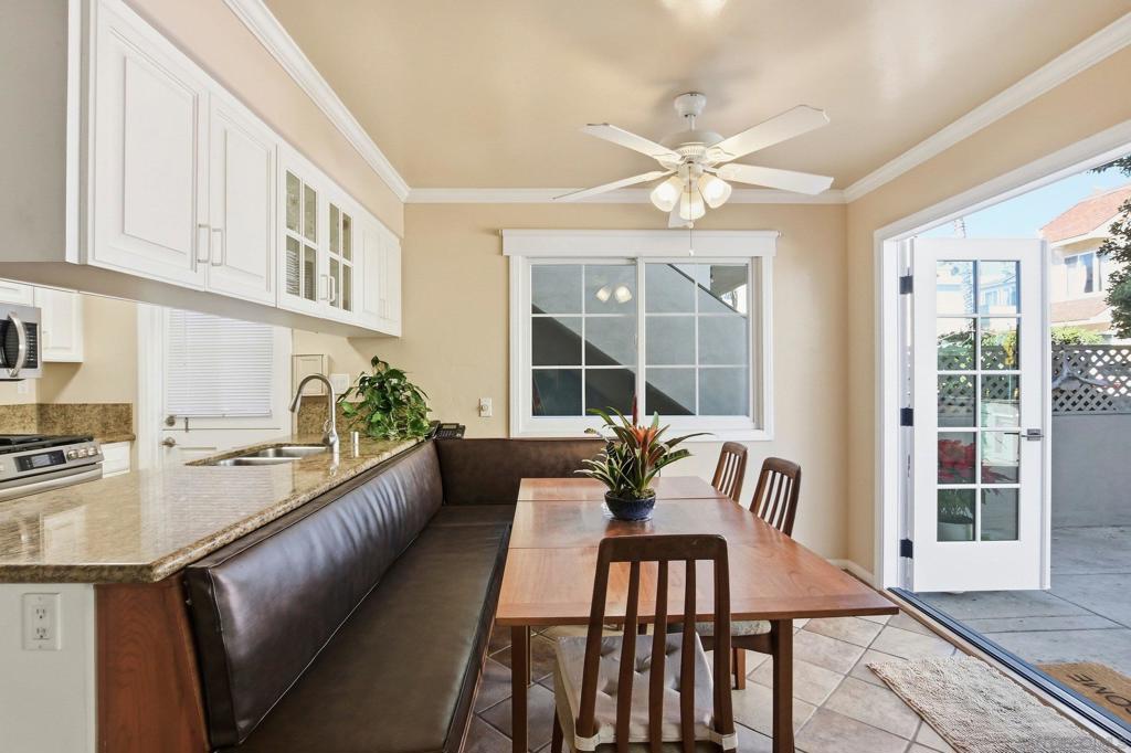 Welcome to your new beach home or ideal vacation retreat in the heart of South Mission Beach. This inviting coastal residence welcomes you through a spacious private front courtyard offering the perfect setting for outdoor dining, entertaining, or simply enjoying the vibrant people-watching. Inside, the home opens to the living/family, and dining area with tile flooring throughout. French doors connect the dining area to the courtyard, enhancing the indoor-outdoor flow. The kitchen features granite countertops, a breakfast bar, newer appliances, a five-burner gas stove with backsplash, while the dining area includes custom built-in seating along the breakfast bar with generous storage beneath, adding charm and functionality. This two-bed, two full bath layout includes a primary suite with its own bathroom, featuring custom-built overhead storage above the bedroom closet, designed to maximize space. Both bedrooms include mirrored closet doors and ceiling fans. Additional highlights include crown molding in the living room and bedrooms, six-panel interior doors, a hallway laundry closet w/stackable washer and dryer, Anderson dual-pane windows w/lifetime transferable warranty, recent interior and exterior paint and a new roof in 8/22. This home offers two off-street tandem parking spaces and exterior storage near the covered parking area. Located just steps to the Pacific Ocean, steps to the bay, a short walk to Belmont Park, restaurants, and favorites like The Beachcomber and Pennant, this home delivers a true South Mission Beach lifestyle with year-round coastal enjoyment.