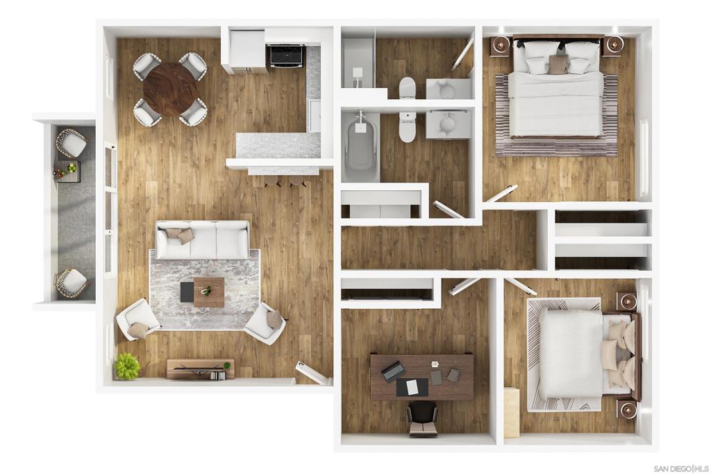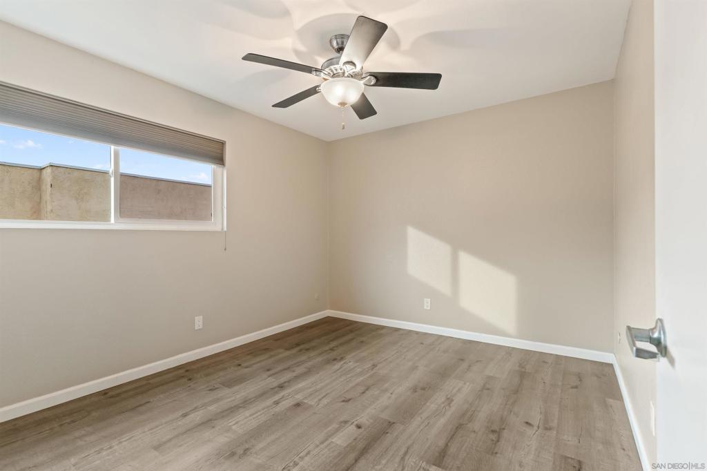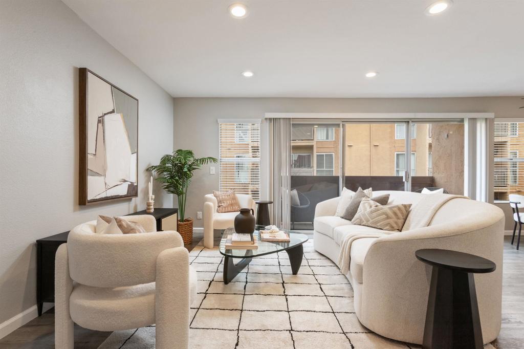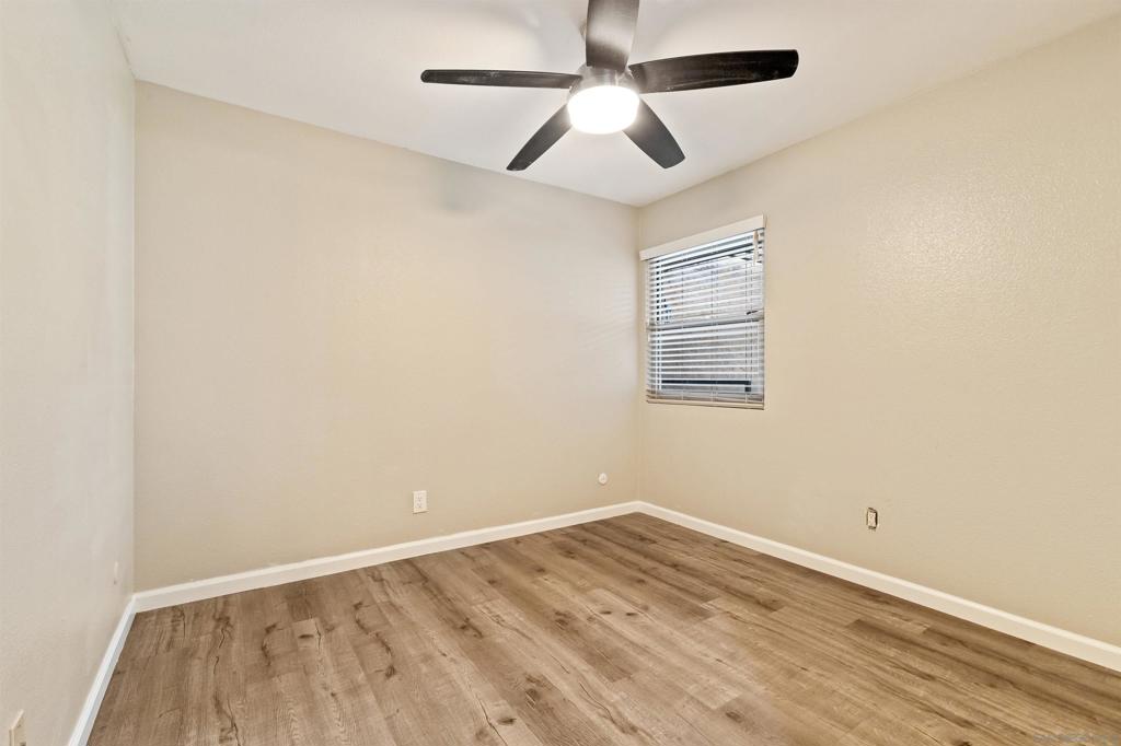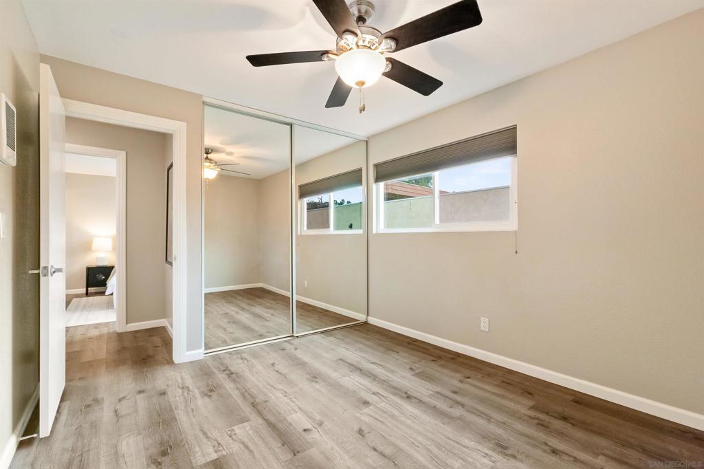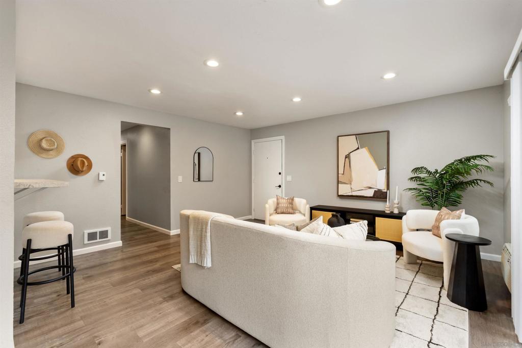 Located in the highly sought-after SDSU College area, this updated upstairs 3-bedroom, 2-bath unit offers the perfect setting, tucked along a tree-lined walkway with lush landscaping and a sparkling community pool. Step inside to discover a light-filled interior with LVP flooring throughout, dual-pane windows, designer paint, mirrored wardrobe doors, LED recessed lighting, and multiple ceiling fans. The kitchen is a showstopper, featuring stunning quartz countertops, custom cabinetry with bar seating, pendant lighting, and stainless steel appliances including brand new refrigerator and separate wine cooler. Every detail has been thoughtfully upgraded, including both remodeled bathrooms with stylish finishes and modern hardware. Additional highlights include a side-by-side full size washer and dryer and custom built storage, upgraded electric heaters, air conditioning, and a covered balcony off the living area. This larger, most desired floor plan includes two covered parking spaces, while the unbeatable location puts you close to the trolley line, popular dining spots, Lake Murray, and offers seamless freeway access. VA Approved!