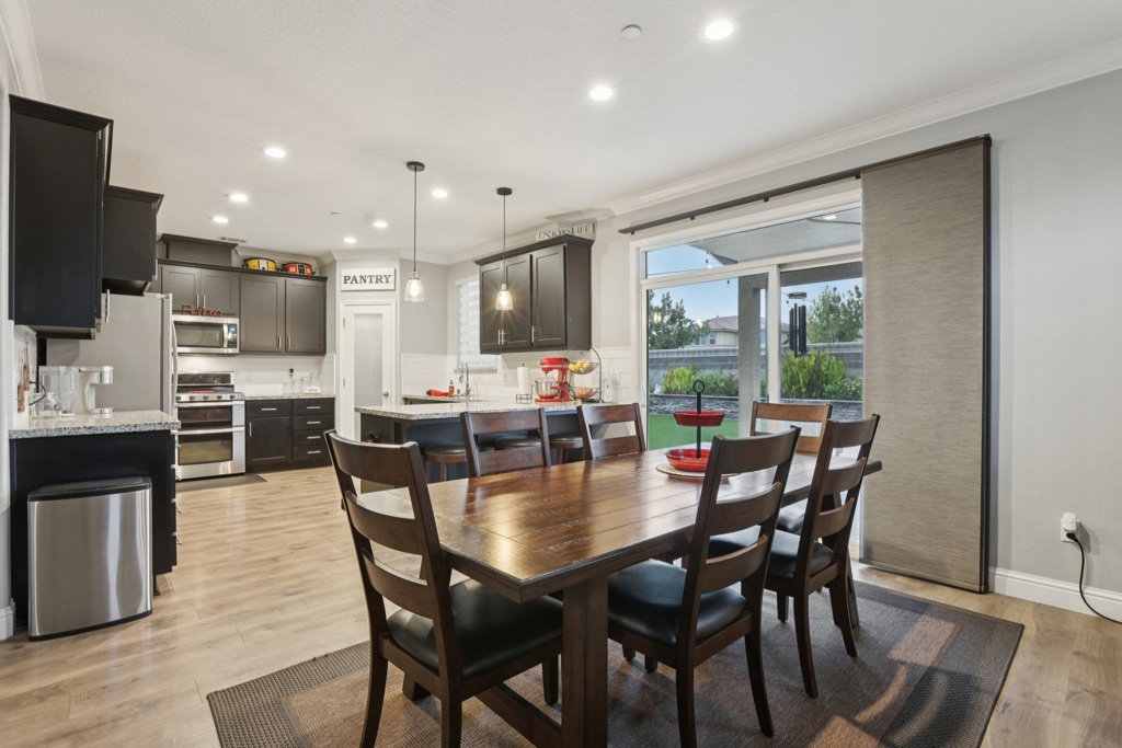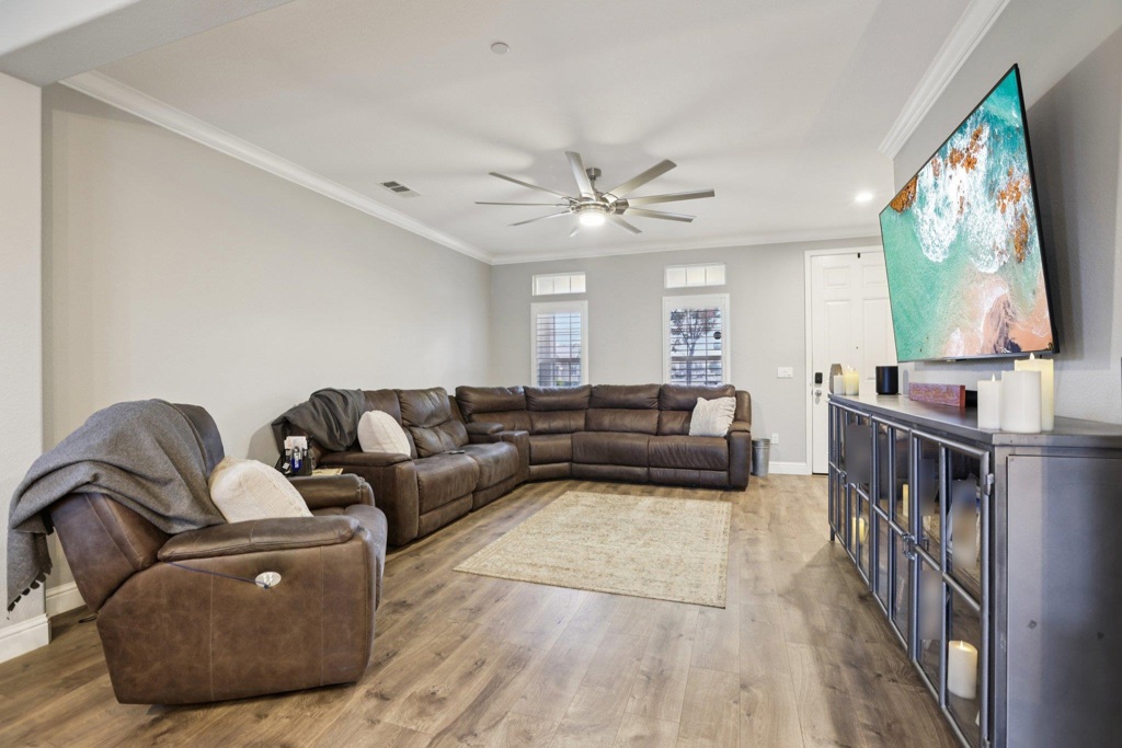 Stunning two-story home with a resort-style backyard designed for elevated living and entertaining. This maintained residence offers a bright, open layout with refined finishes and versatile spaces ideal for work-from-home, guests, or multi-generational living. The interior features spacious bedrooms, each with its own walk-in closet, updated bathrooms with dual vanities, and a well-appointed primary suite designed as a true retreat. The owner’s bath includes an extra-large walk-in shower and elevated-height vanities for a spa-like feel. Neutral designer tones and abundant natural light create a polished, move-in-ready atmosphere. A generous upstairs loft offers flexible space for a media room or lounge, while a built-in desk with filing cabinets and shelving provides a dedicated workspace. Step into the backyard retreat, complete with a custom Trex deck with built-in lighting, a covered patio with ceiling fans, and a hot tub featuring a dramatic rock waterfall. Multiple seating and dining areas, a freestanding fire pit, raised planters, and string lighting create a private, resort-like setting ideal for entertaining. Conveniently located near parks, schools, shopping, and commuter routes. A blend of sophistication, comfort, and outdoor living best experienced in person!